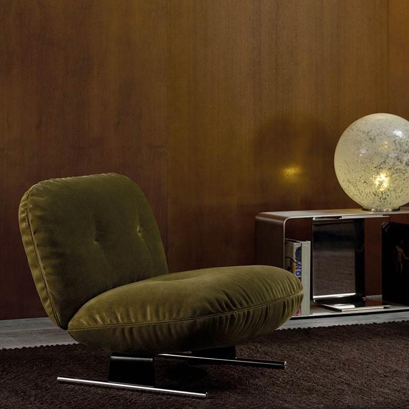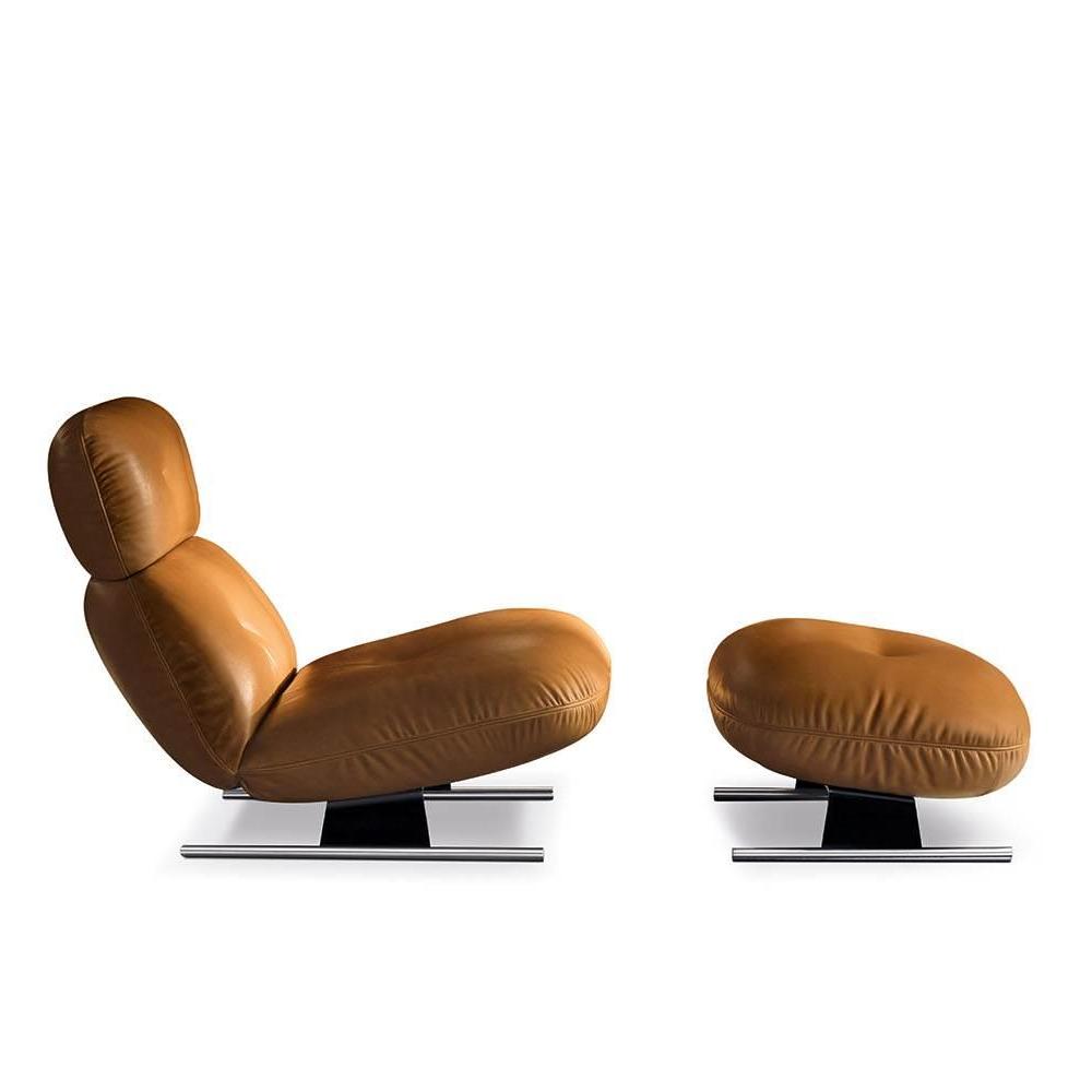 This leisure chair seat, backrest, and headrest are layered with soft materials, wrapped in leather or fabric, and reinforced with central stitching for a three-dimensional feel. The metal base is composed of curved plates and tubular legs, showcasing exquisite craftsmanship and artistic beauty as a whole.