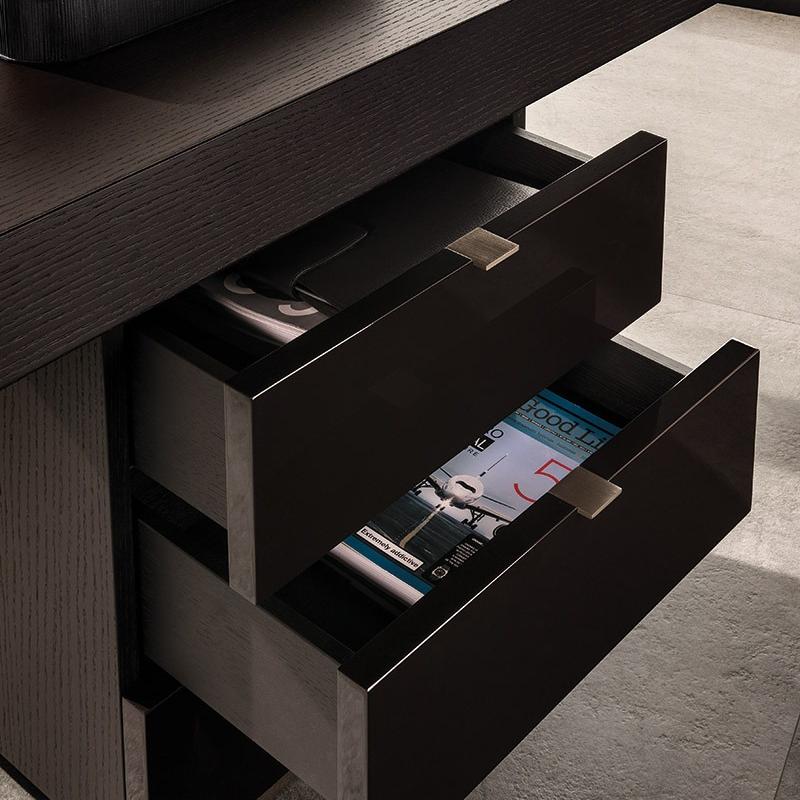 This office desk features bronze colored metal sides, a solid wood veneer with mocha paint on the tabletop and structure, and glossy mocha colored drawers. It comes in a variety of sizes and is suitable for living rooms, bedrooms, and study rooms.