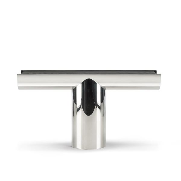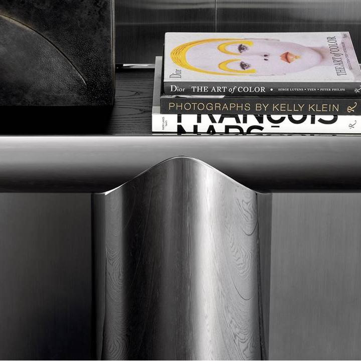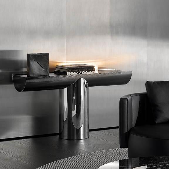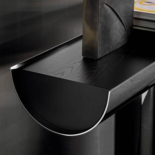 This foyer table adds a sculptural feel to the interior with its rugged style. Its base is a polished steel cylindrical frame embedded in a horizontal hollow semi cylinder of the same material, containing a Licorice painted ash wood tabletop. This design detail is particularly prominent from the side, showcasing the texture of the wood.