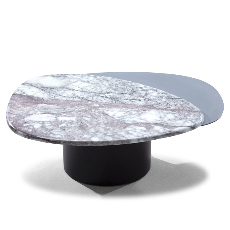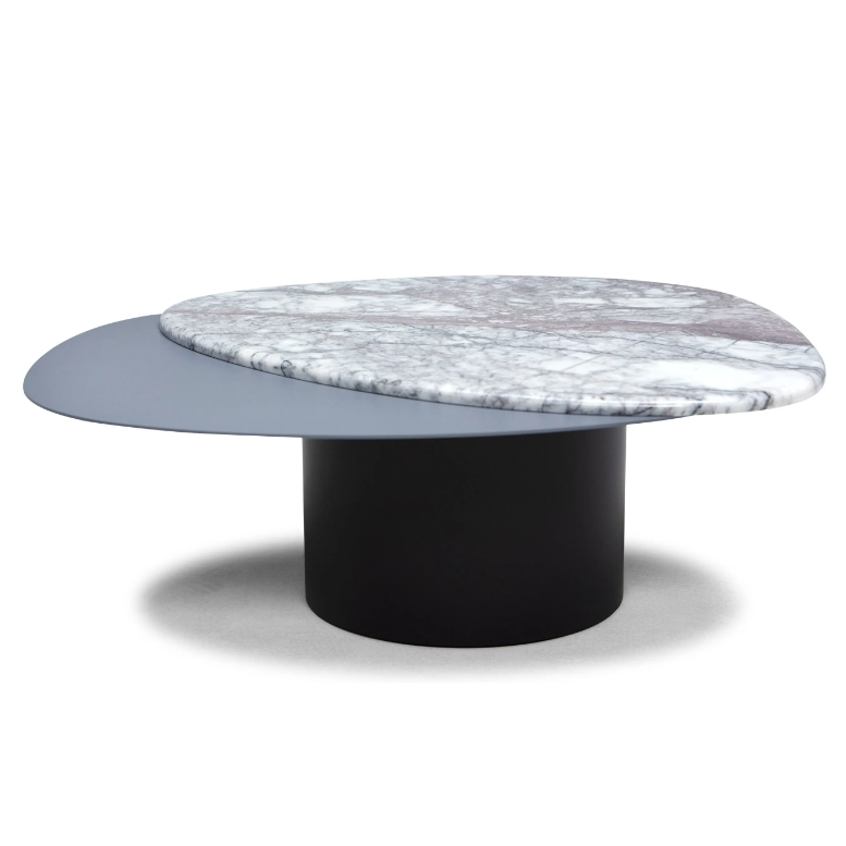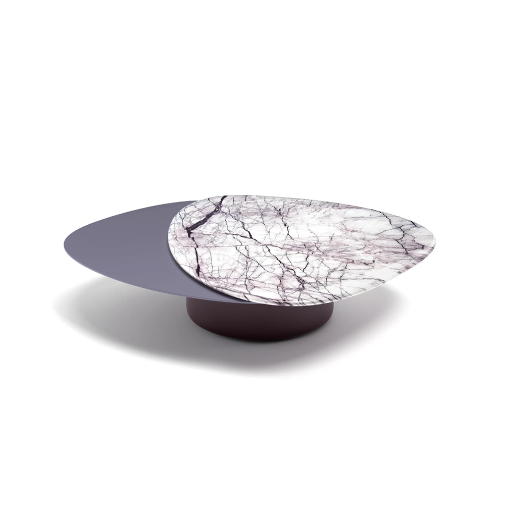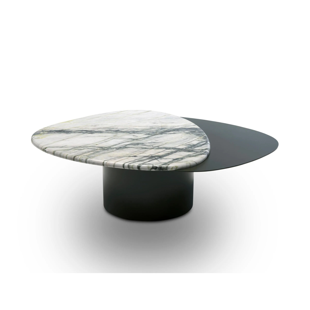 This coffee table is inspired by irregular pebble shapes, with a curved metal plate base and matte paint finish. The tabletop is made of molded steel and precious marble, with a shiny marble surface and rounded edges. The uniqueness of each piece lies in the difference in marble color tones. The table is equipped with invisible rotating wheels for easy movement in space.