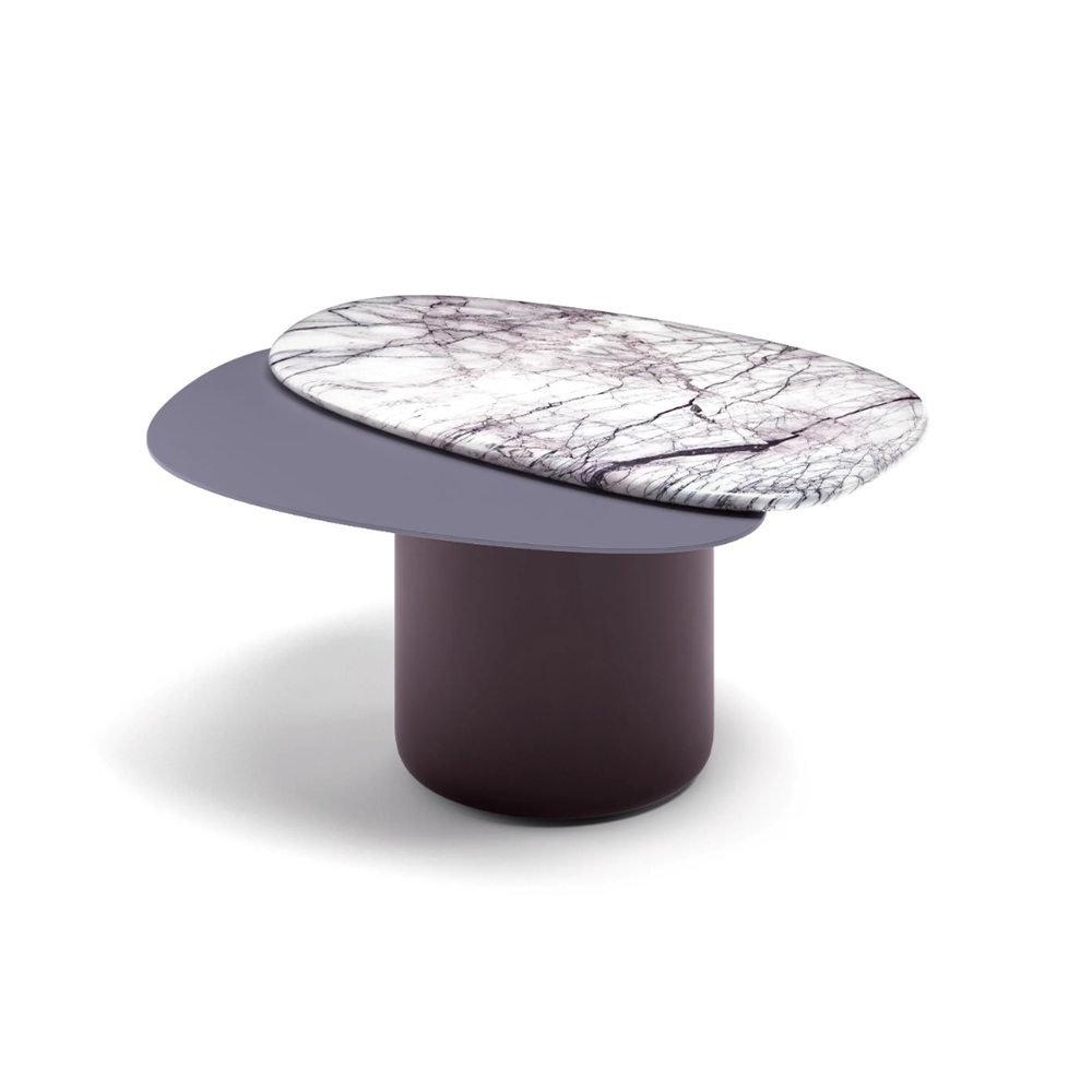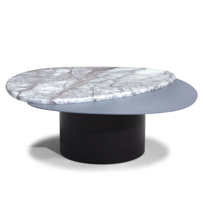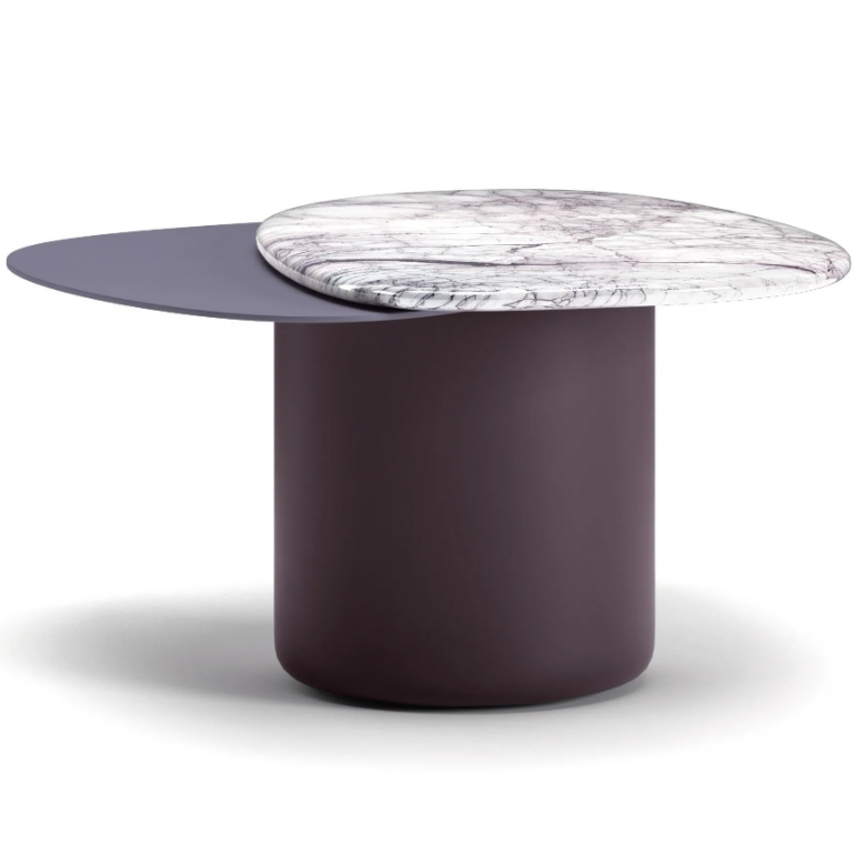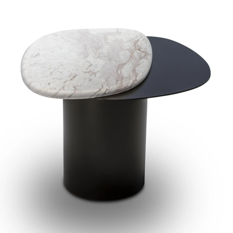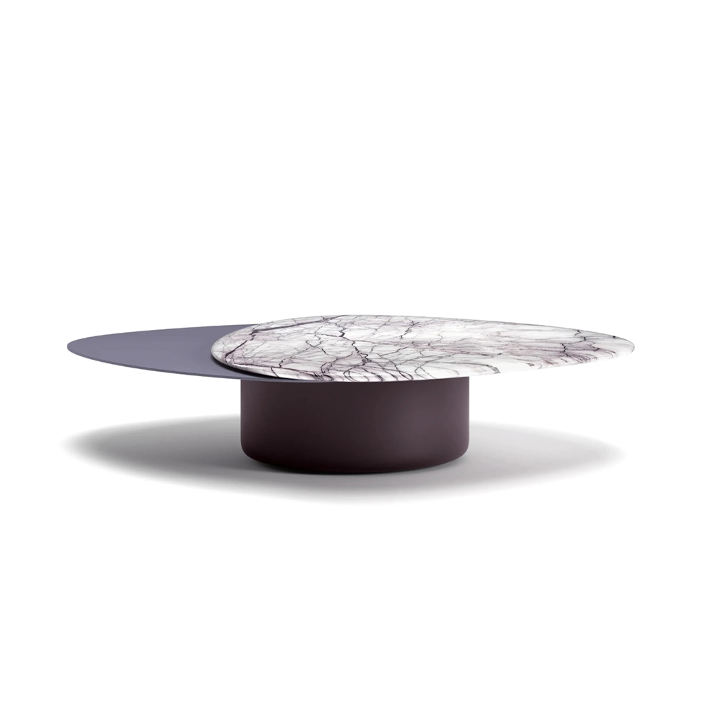 This coffee table is inspired by irregular pebble shapes, with a curved metal plate base and matte paint finish. The tabletop is made of molded steel and precious marble, with a shiny marble surface and rounded edges. The uniqueness of each piece lies in the difference in marble color tones. The table is equipped with invisible rotating wheels for easy movement in space.