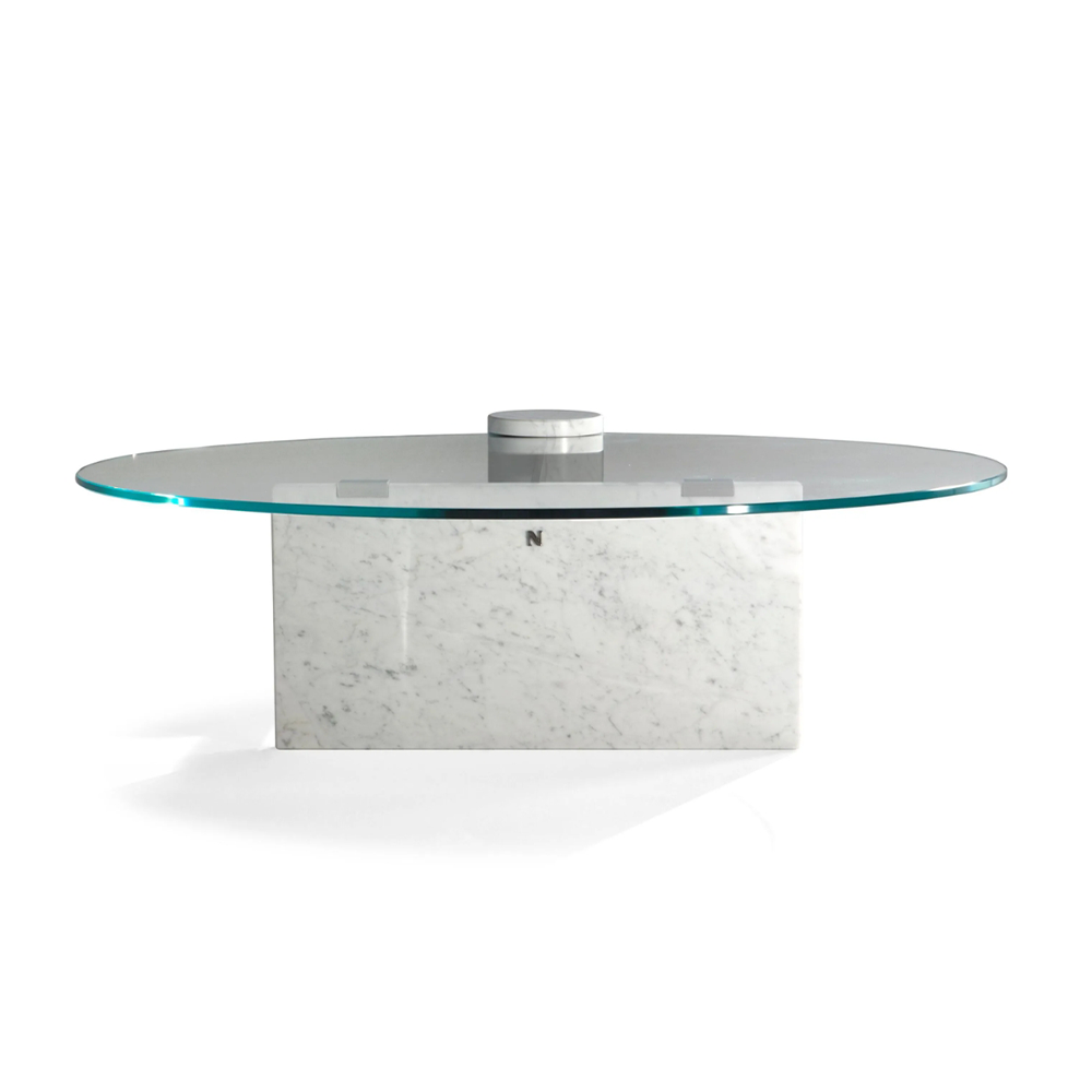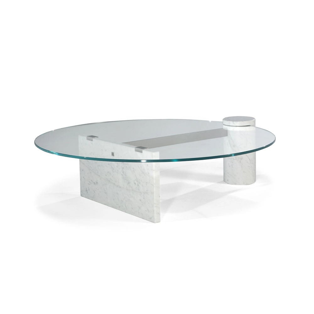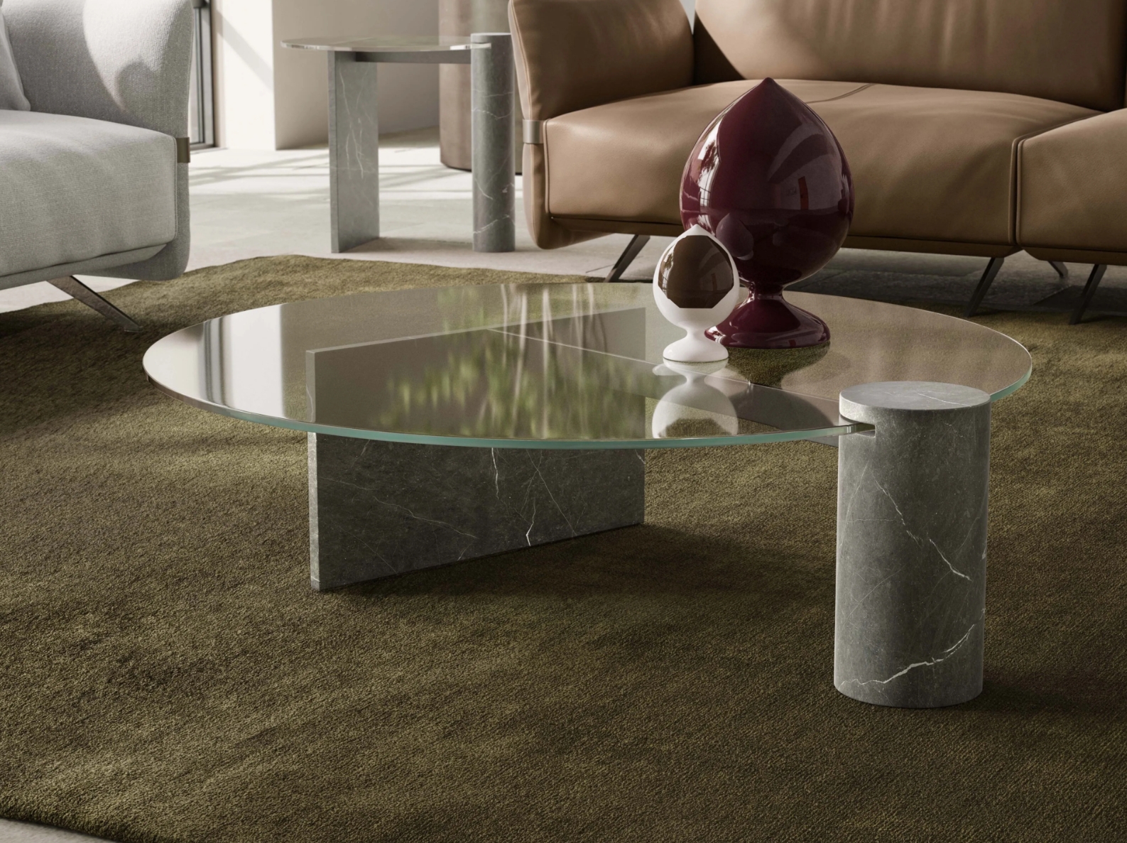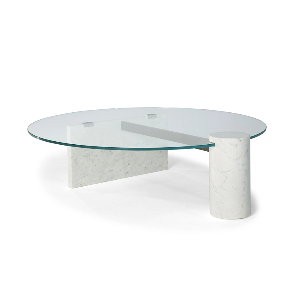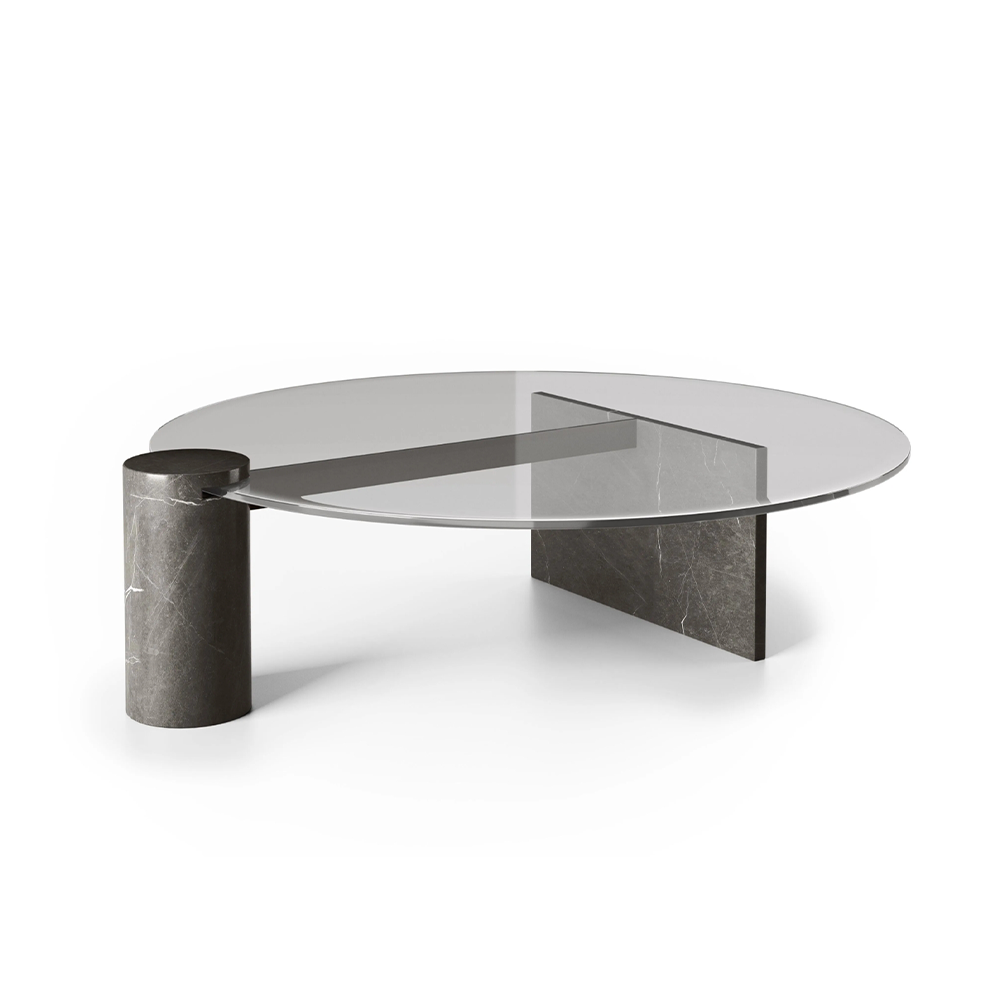 This coffee table is made of white Carrara marble and Fosana stone, with a base made of stone columns or rectangular prisms connected by tin coated steel pipes. The inspiration comes from the dewdrops on spring flowers, and the glass tabletop seems to be suspended on it. This series offers multiple sizes and heights to meet different functional needs, serving as both a center table and a decorative table.