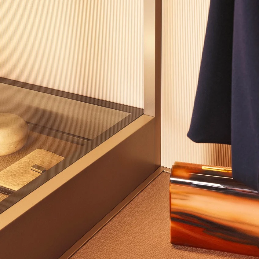 The walk-in closet reinterprets the traditional wardrobe system through its lightweight and elegant design, while retaining the durability brought by the thick side panels. The storage space without doors is open and flexible in configuration. The decoration and accessories are its highlights, and users can choose clothes poles, drawers, partitions, and pull-out trays according to their needs.
