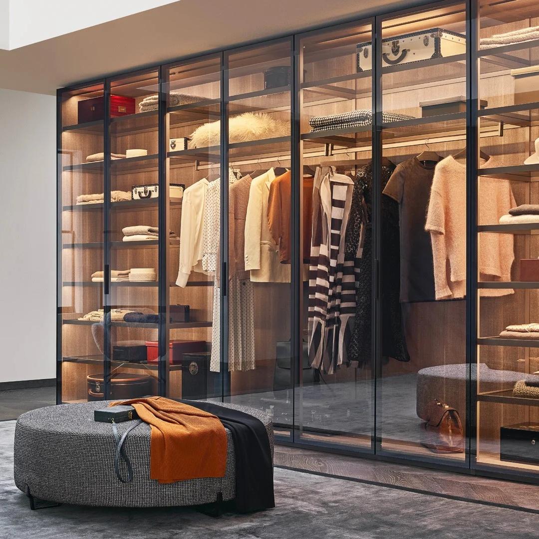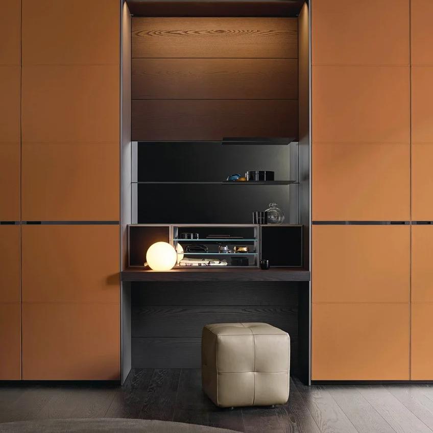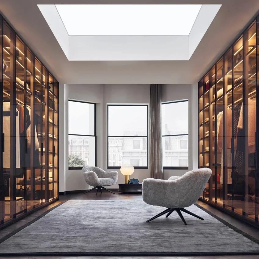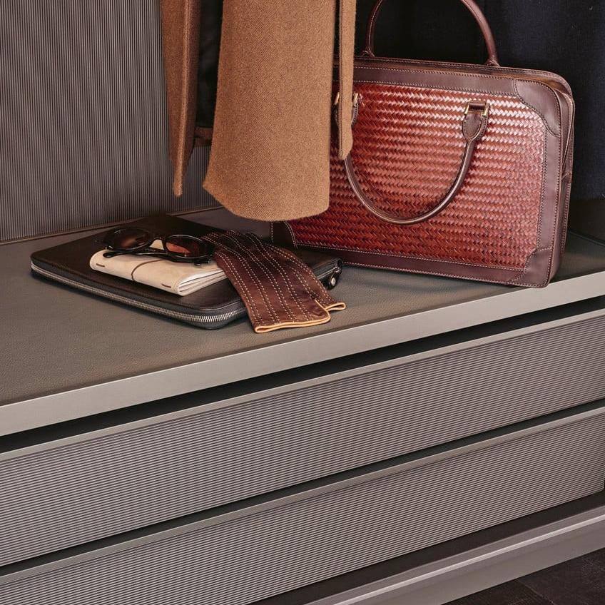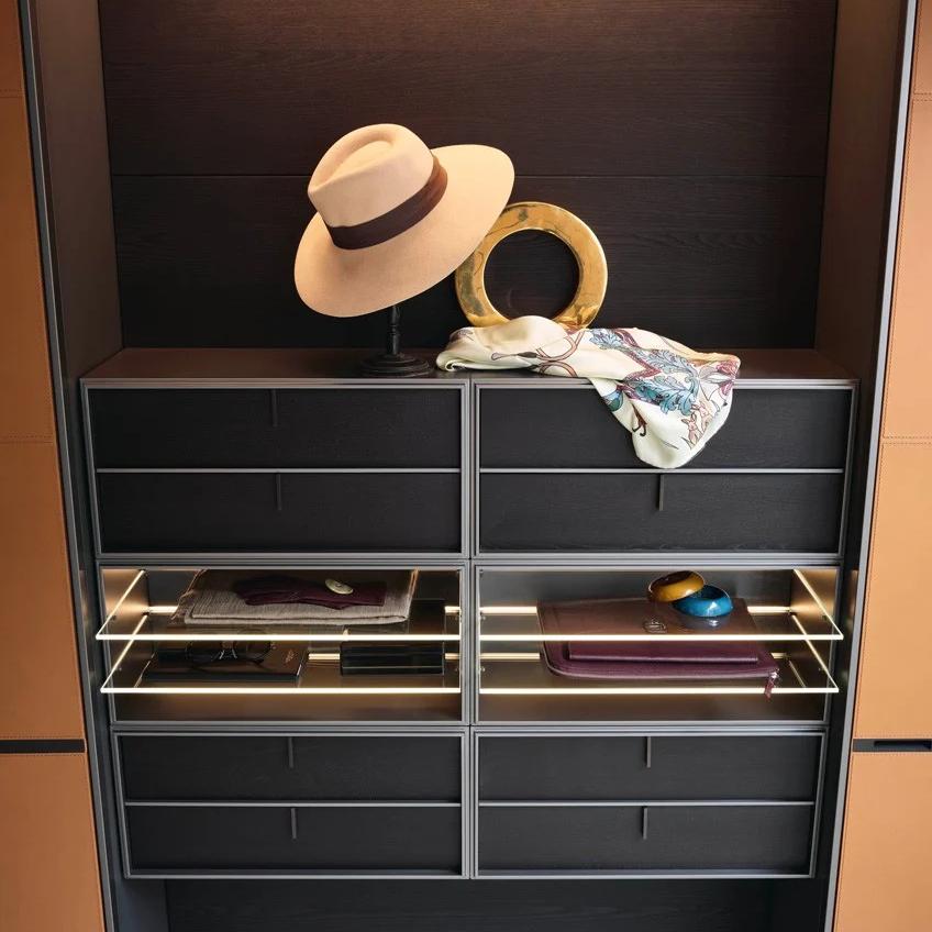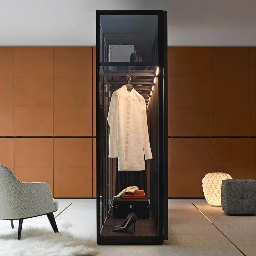 This cloakroom system constantly introduces new aesthetic and functional solutions. Its modular design is suitable for any building design, including side frames, back panels, top panels, bases, and shelves, supporting multiple door opening methods. Users can choose from precious surface finishes such as melamine to glass to create exclusive display cabinet structures. The drawer unit and accessories further enhance its adaptability, making it an evolving series that can fit into any space.