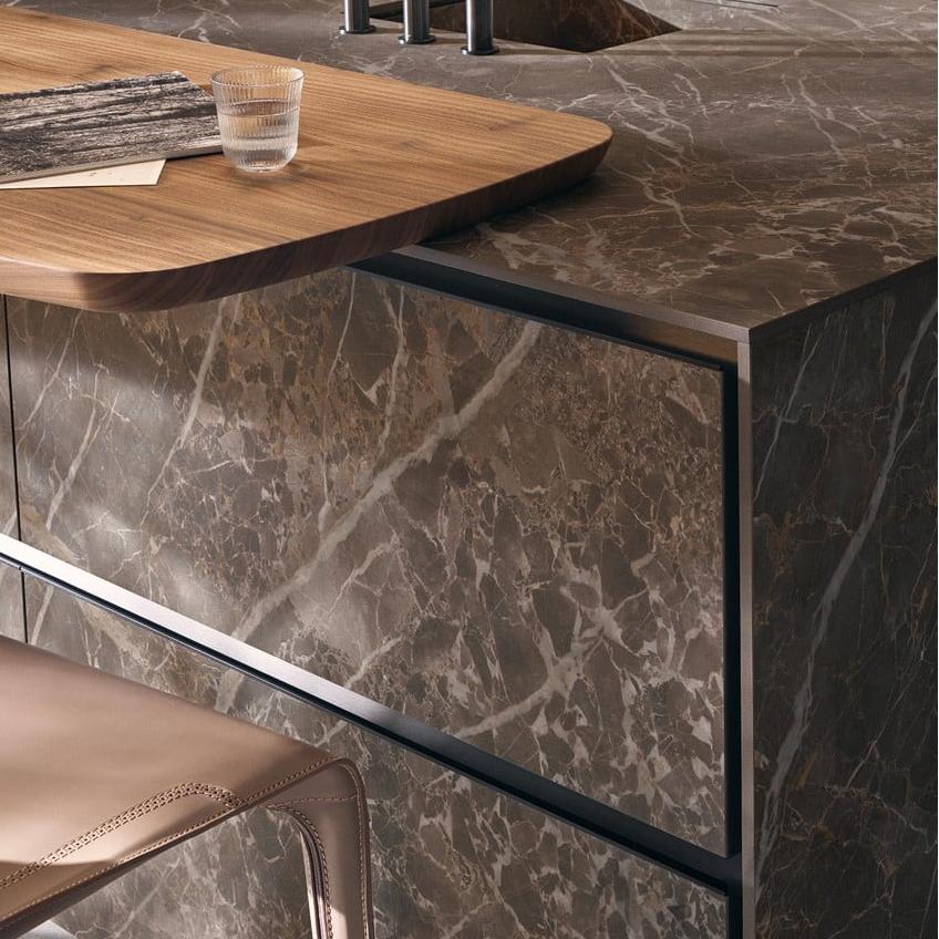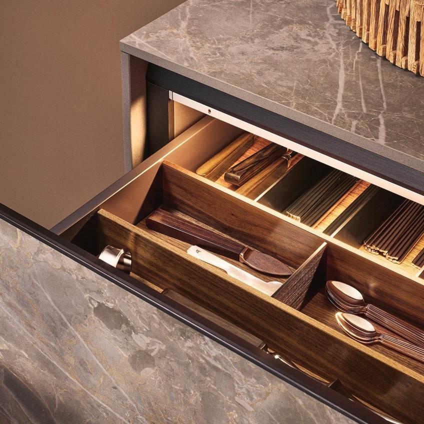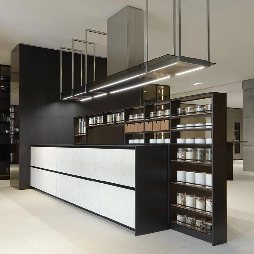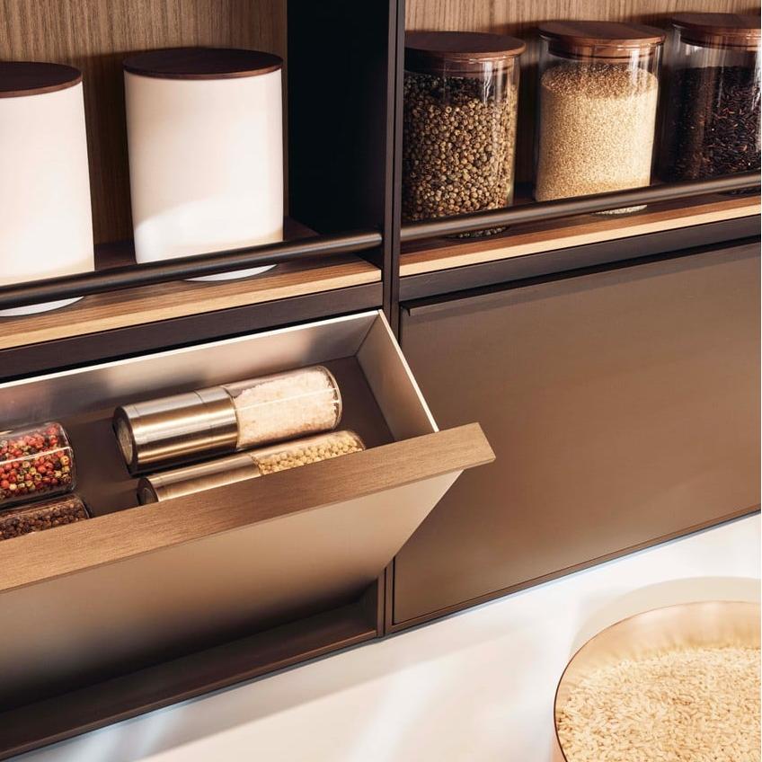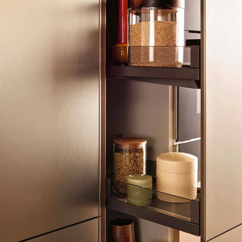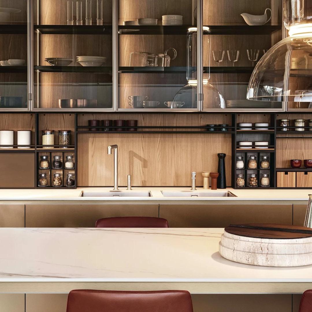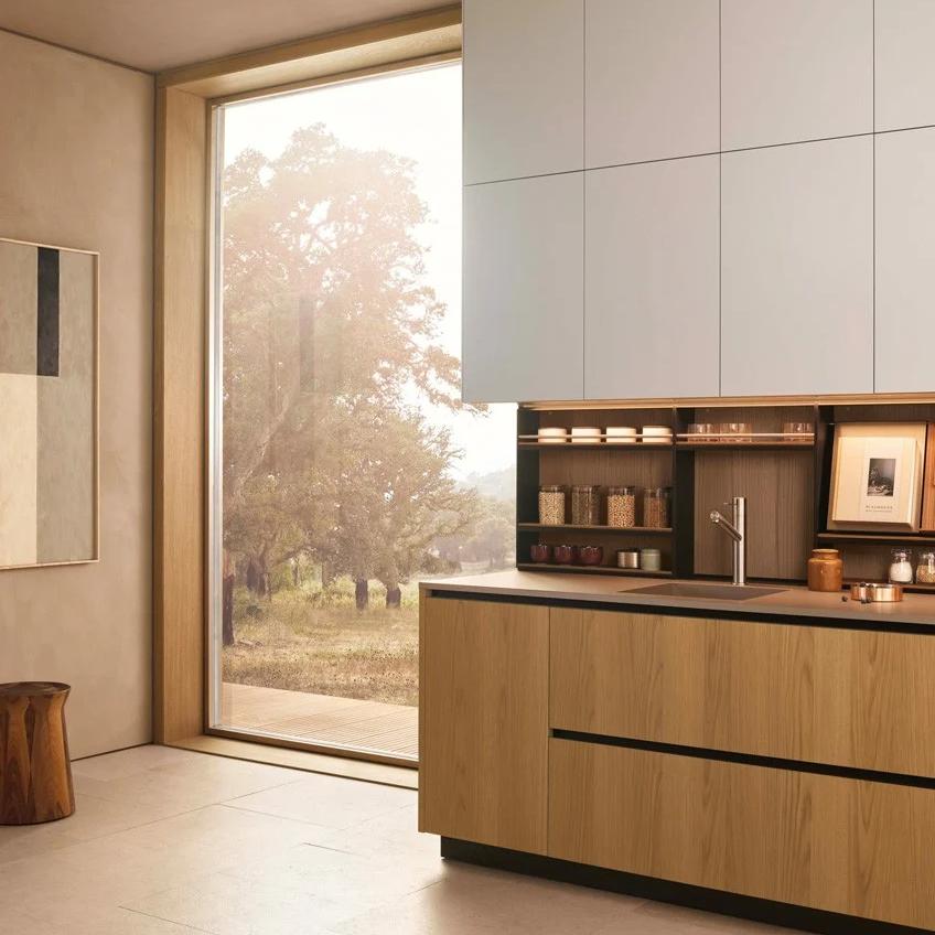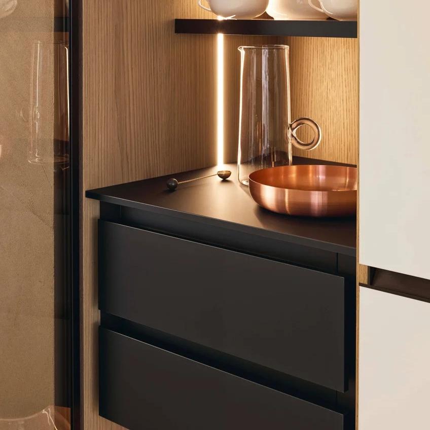 This cabinet has a more expressive line design. The newly slotted lines emphasize vertical and horizontal elements, and the upper edge of the door adopts a slanted design, paired with matching handle lines. The spacing details of the side panels make the bottom cabinet appear lighter. Transparent display doors are suitable for various cabinets, creating a sense of rhythm.