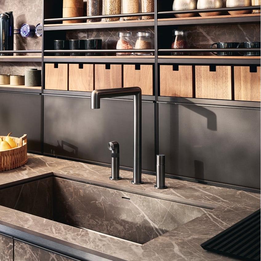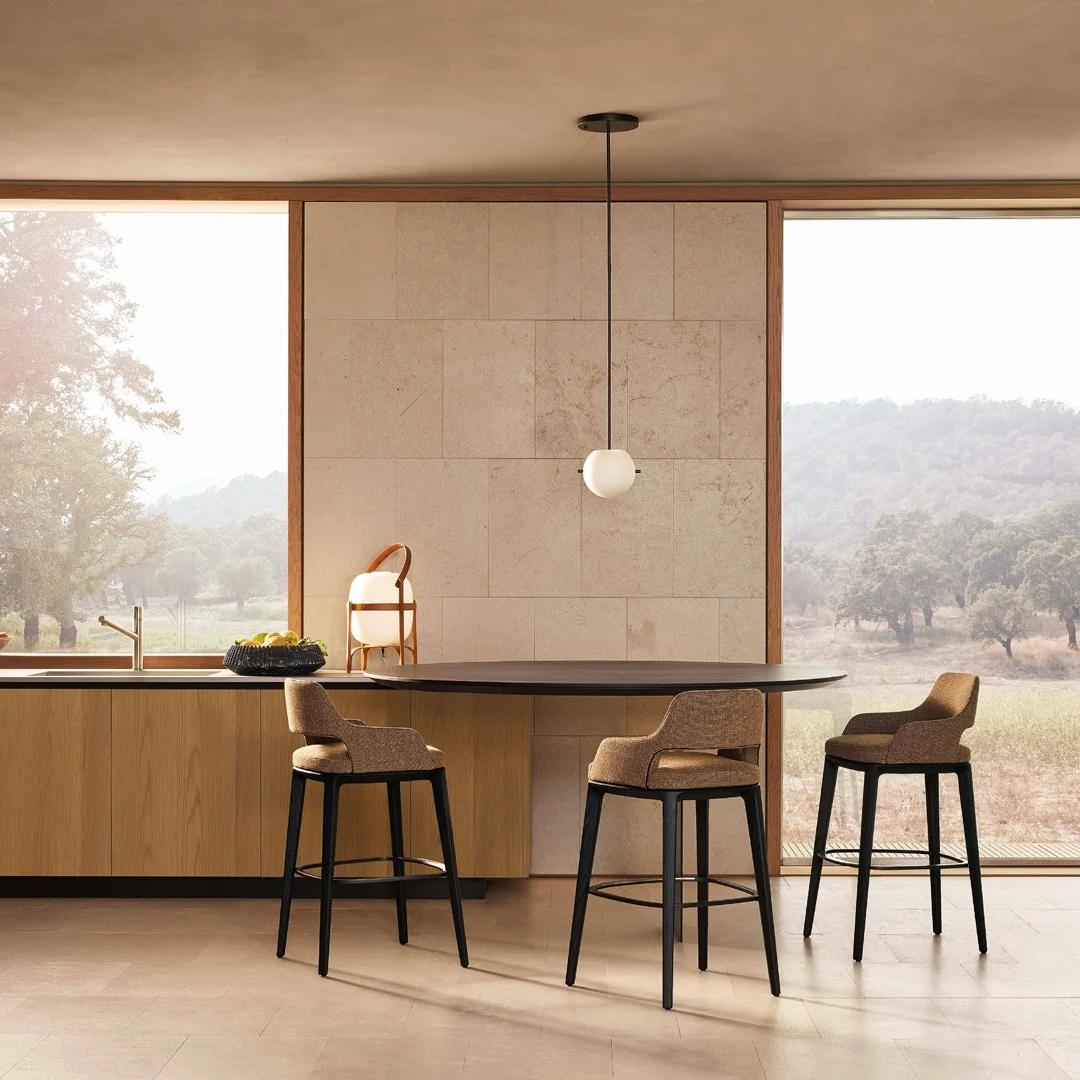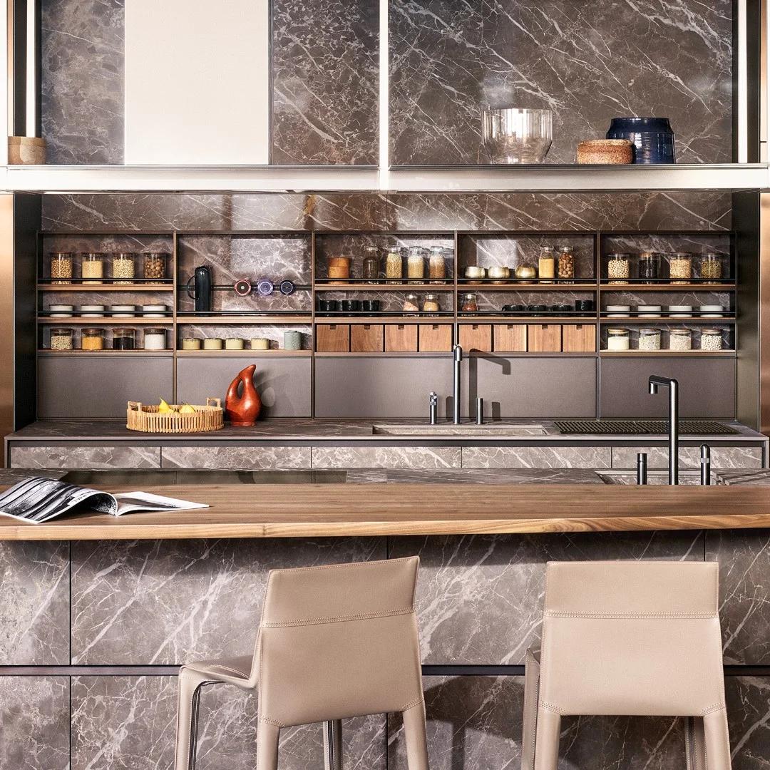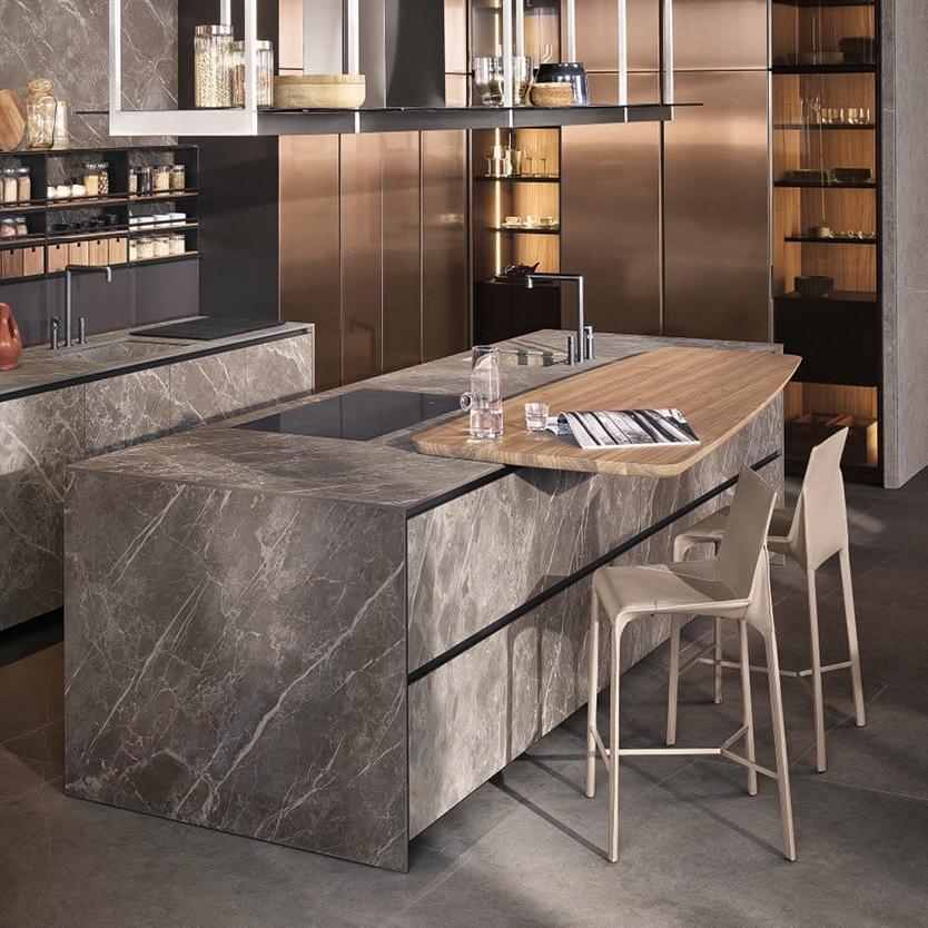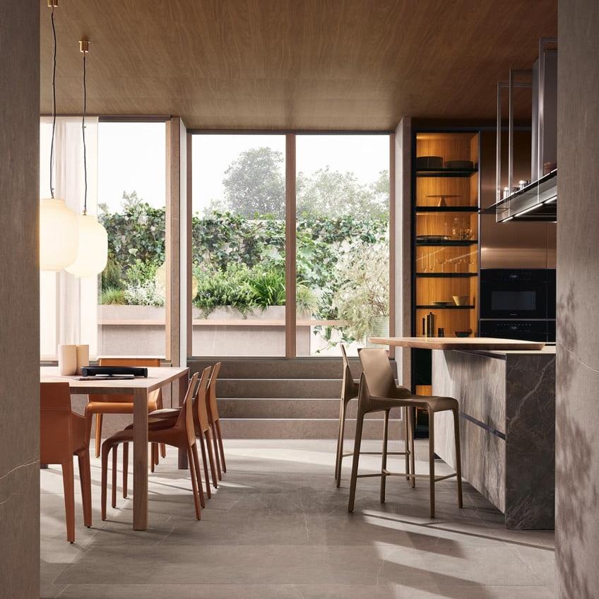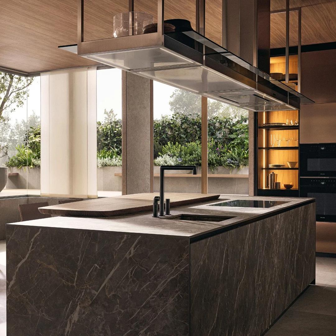 This cabinet has a more expressive line design. The newly slotted lines emphasize vertical and horizontal elements, and the upper edge of the door adopts a slanted design, paired with matching handle lines. The spacing details of the side panels make the bottom cabinet appear lighter. Transparent display doors are suitable for various cabinets, creating a sense of rhythm.