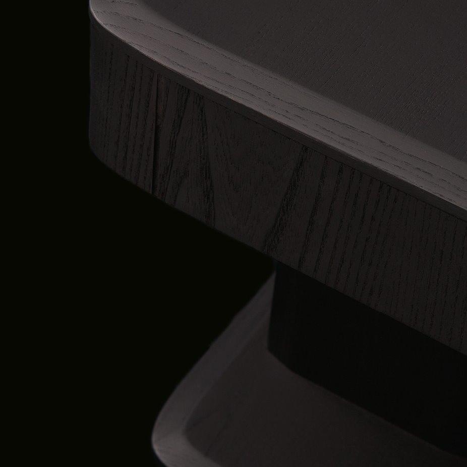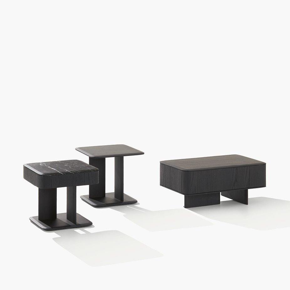 This bedside table echoes the horizontal lines and architectural inspiration of the same named bed. There are two sizes to choose from for the bedside table, which can fit inside a wider headboard and comes with a drawer decorated with delicate finishes such as marble.