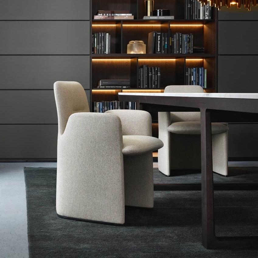 This dining chair is an elegant chair, and its name and visual appearance imply the concept of warmth and comfort. Thanks to its large proportion and soft lines, it is very suitable for placement around a desk or can be placed separately next to a desk.