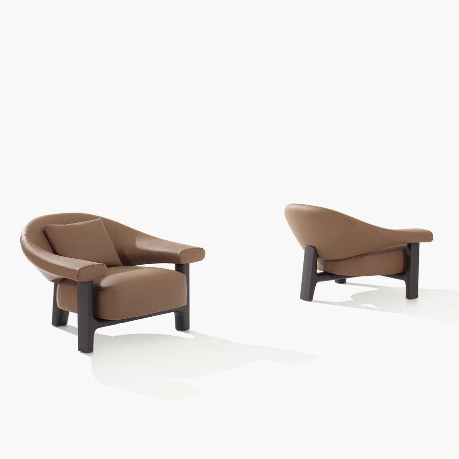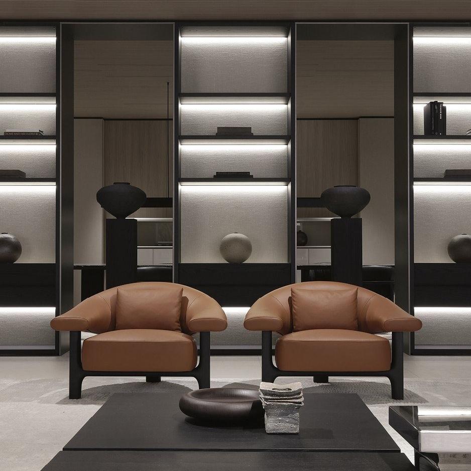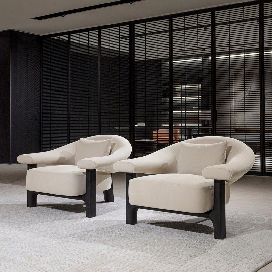 This leisure chair is inspired by medieval aesthetics, blending smooth curves with a solid structure. The sofa and armchair are equipped with wooden bases and organic shaped soft cushions, and their sculptural backrests are elegantly folded like Mobius straps, seamlessly connected to the armrests.