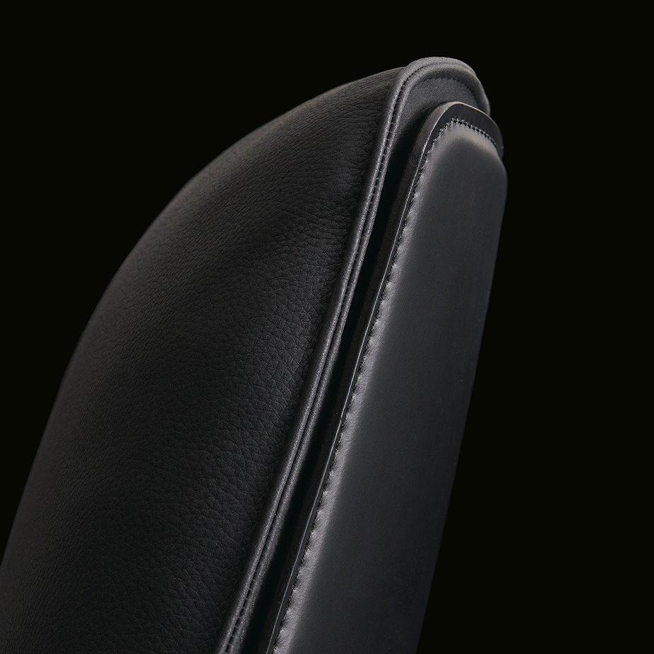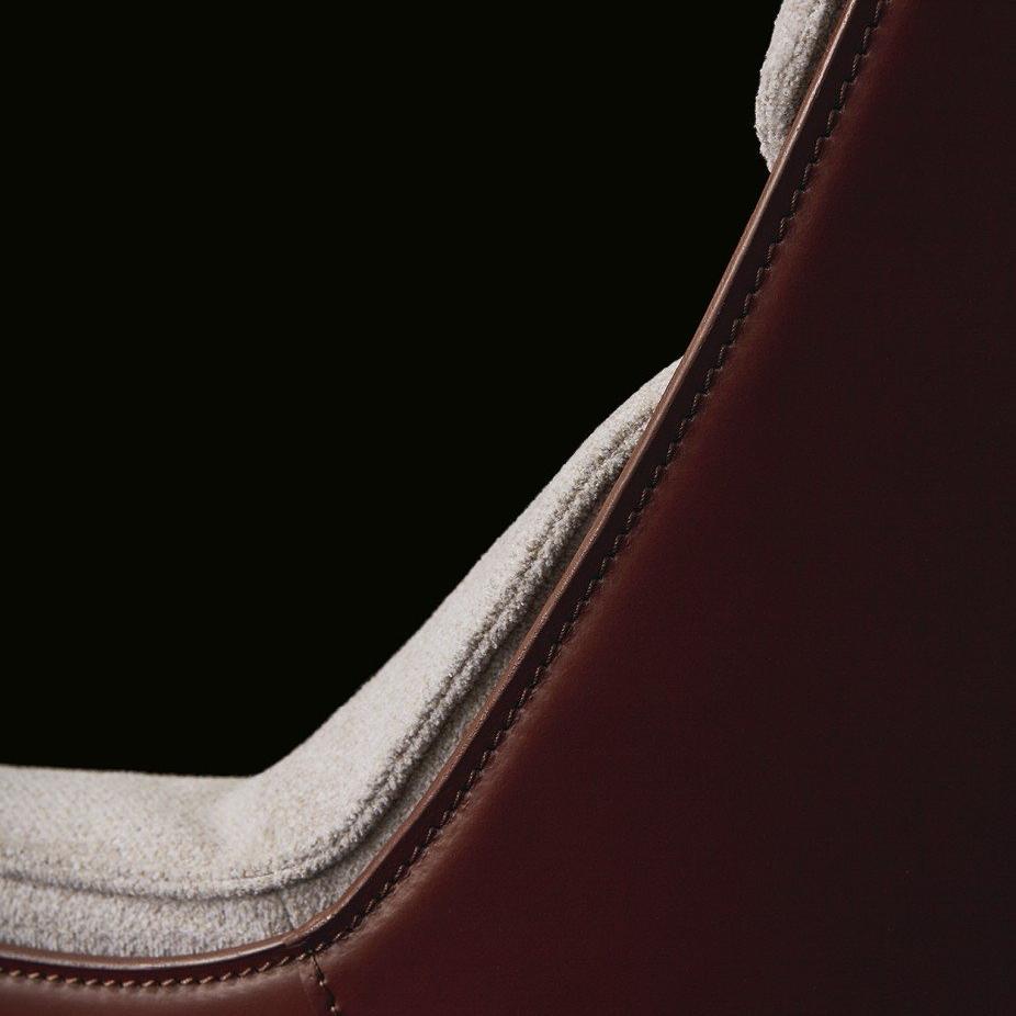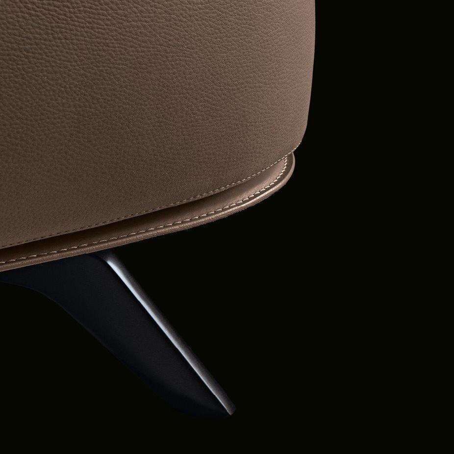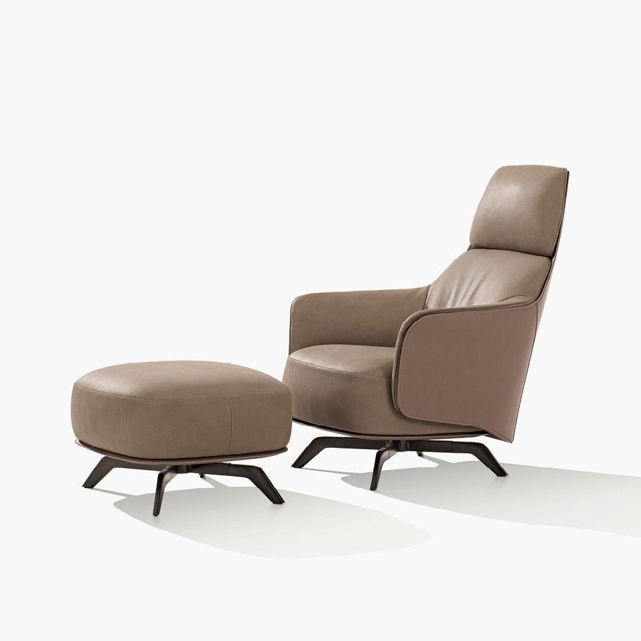This armchair is equipped with a higher backrest, presenting soft lines, enveloping shapes, and a wider volume. This armchair is equipped with a rotating mechanism and perfectly blends the external leather finish with the internal filling cover layer. To make the armchair more comfortable, a matching stool can be selected.