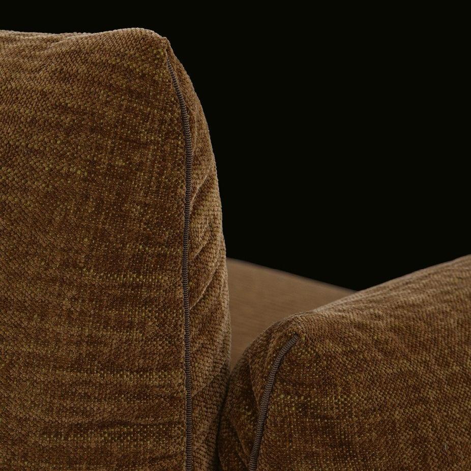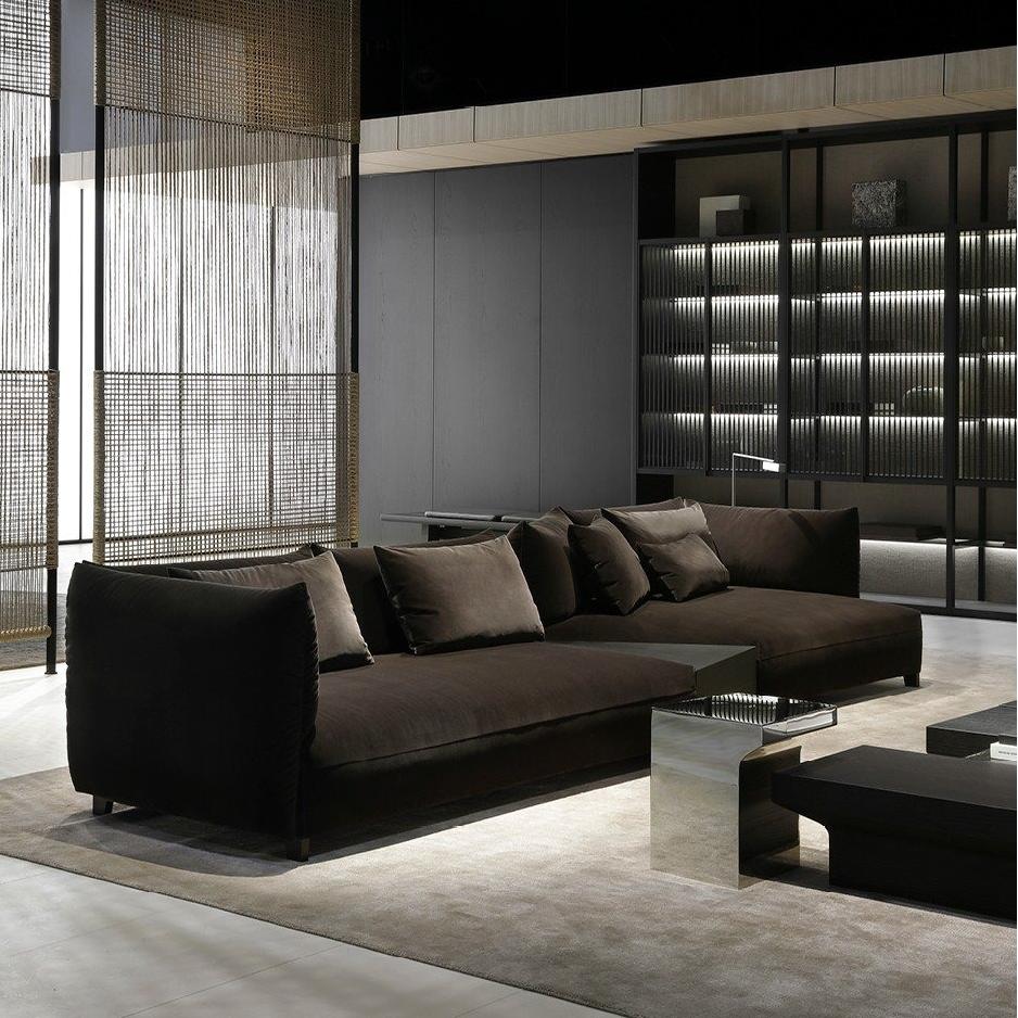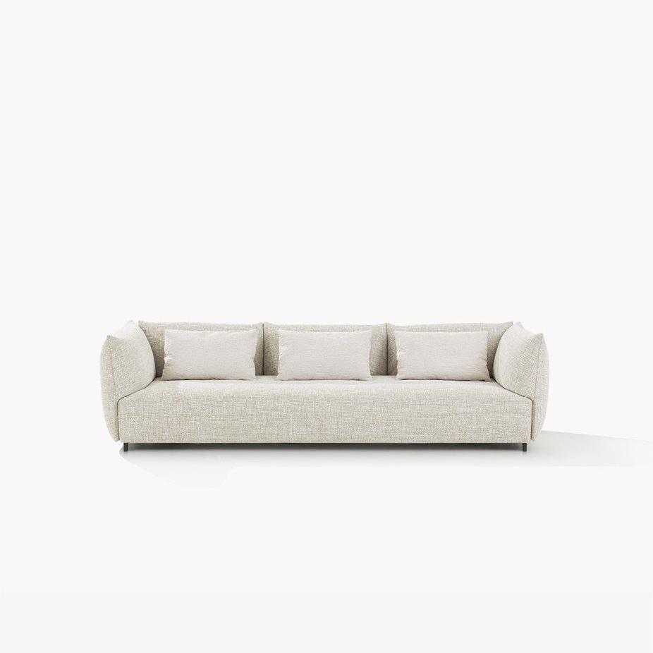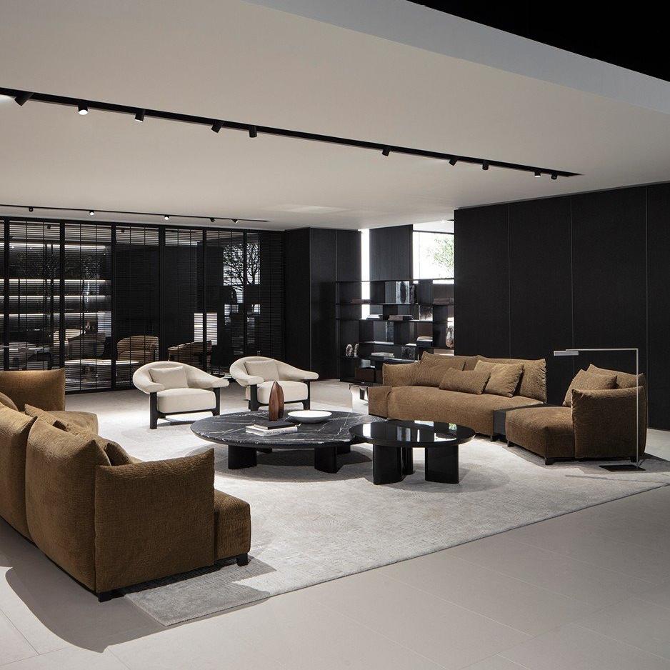 This sofa showcases a minimalist aesthetic. Its simple lines complement the large volume, and the design inspiration comes from the fashion industry, presenting perfect proportions and exquisite details. The sofa offers the option of same color or contrasting rolled edges, and personalized configuration is achieved through circular or linear modular components.