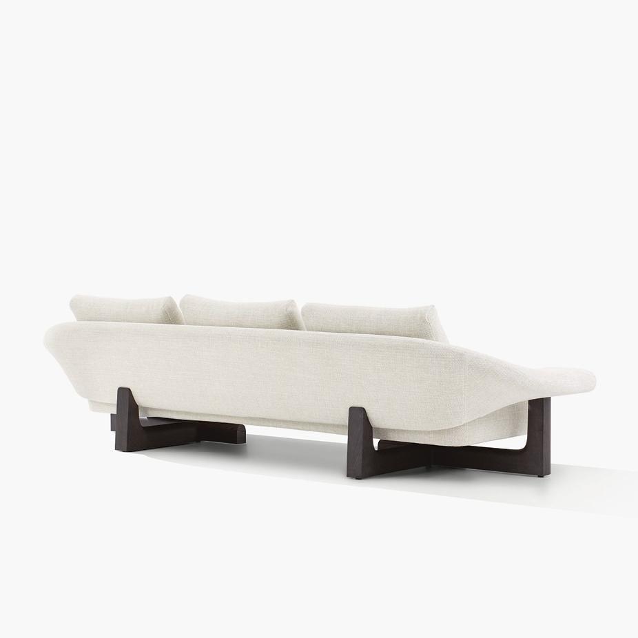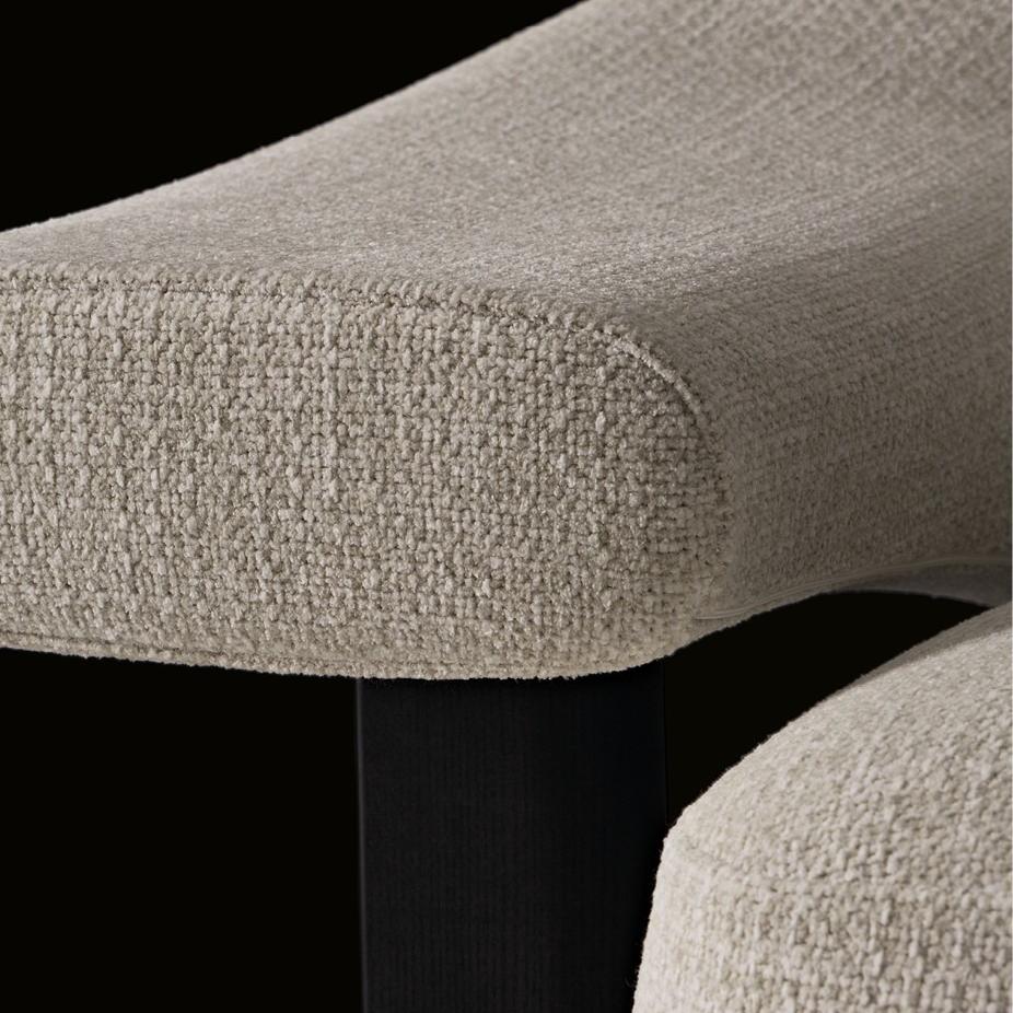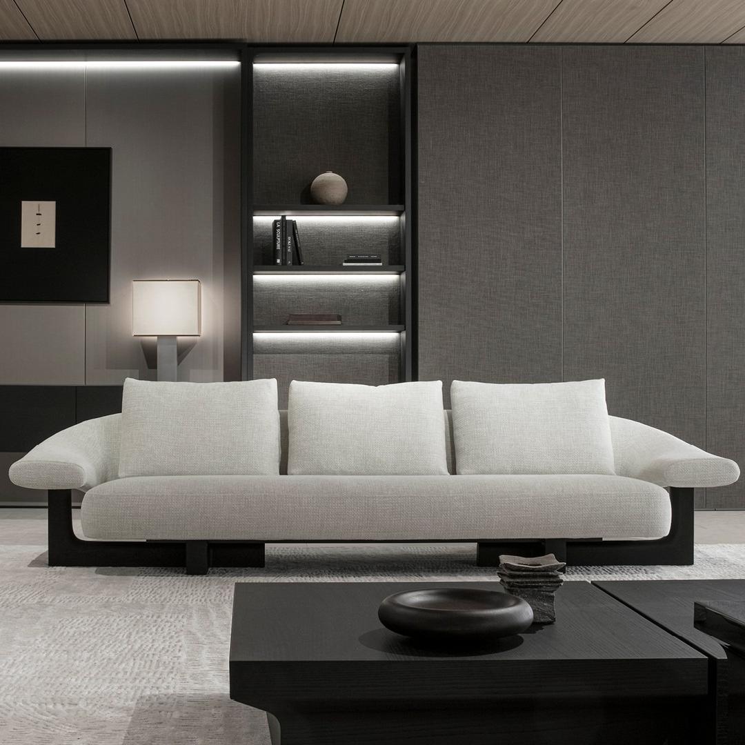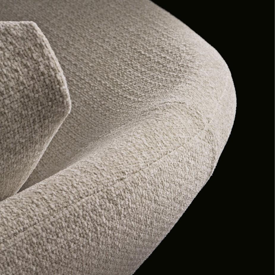 This sofa blends medieval aesthetics, showcasing smooth curves and solid structure. The sofa and armchair feature a wooden base paired with suede organic soft cushions, and a sculptural backrest that folds elegantly like a M ö bius strap, seamlessly connecting to the armrests.