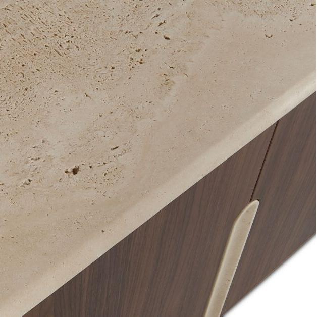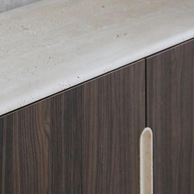 This modern minimalist style side cabinet features a high-quality marble textured countertop and wooden textured cabinet doors, showcasing an elegant texture. The cabinet design is simple and elegant, with smooth lines. The metal support legs of the side cabinet are lightweight and stable. The interior space is spacious and can accommodate various items, meeting your storage needs.