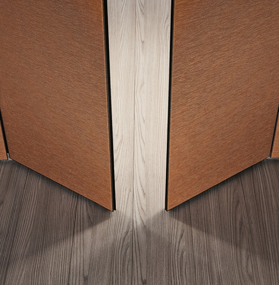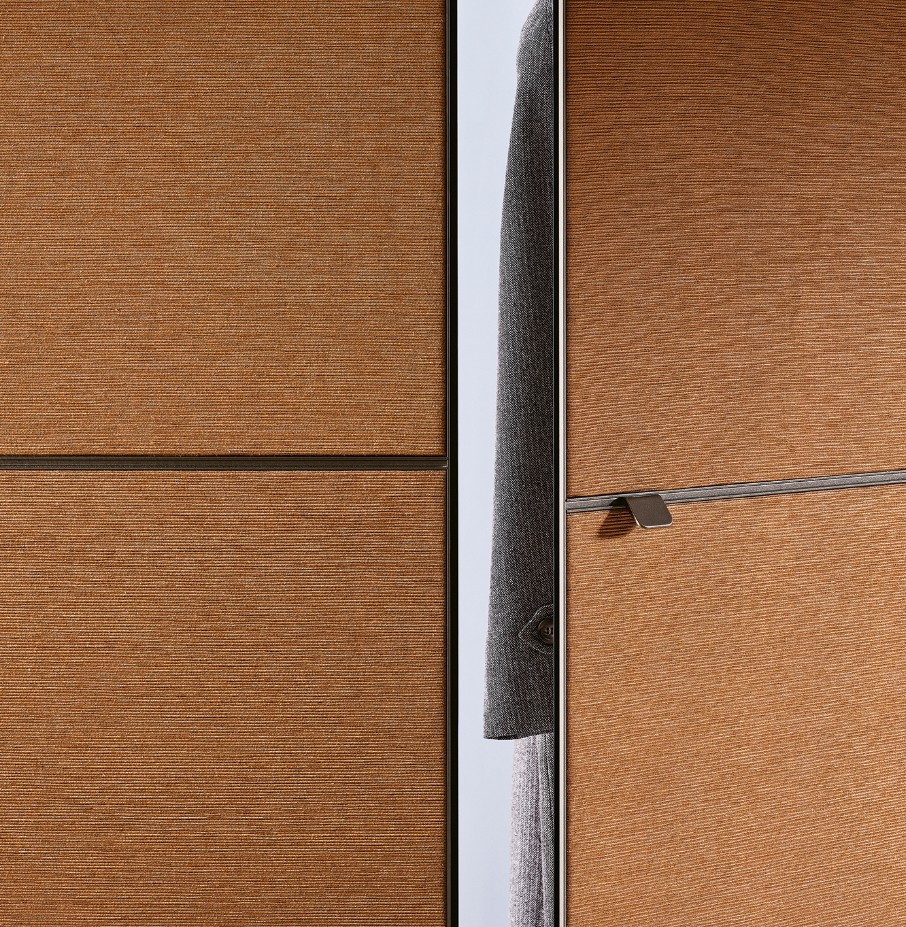 This wardrobe adopts a warm orange brown color scheme, paired with textured cabinet doors, with a simple and stylish style. The interior design is practical, with a hanging area, a folding area, and shelves. The metal coat rack on the right adds a sense of hierarchy. The minimalist space integrated with the wooden ceiling and light grey floor is a storage choice that combines aesthetics and practicality.
