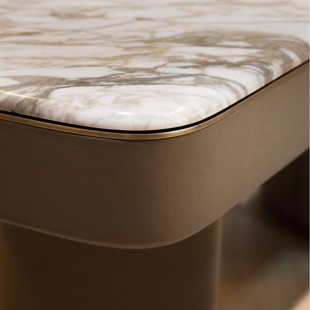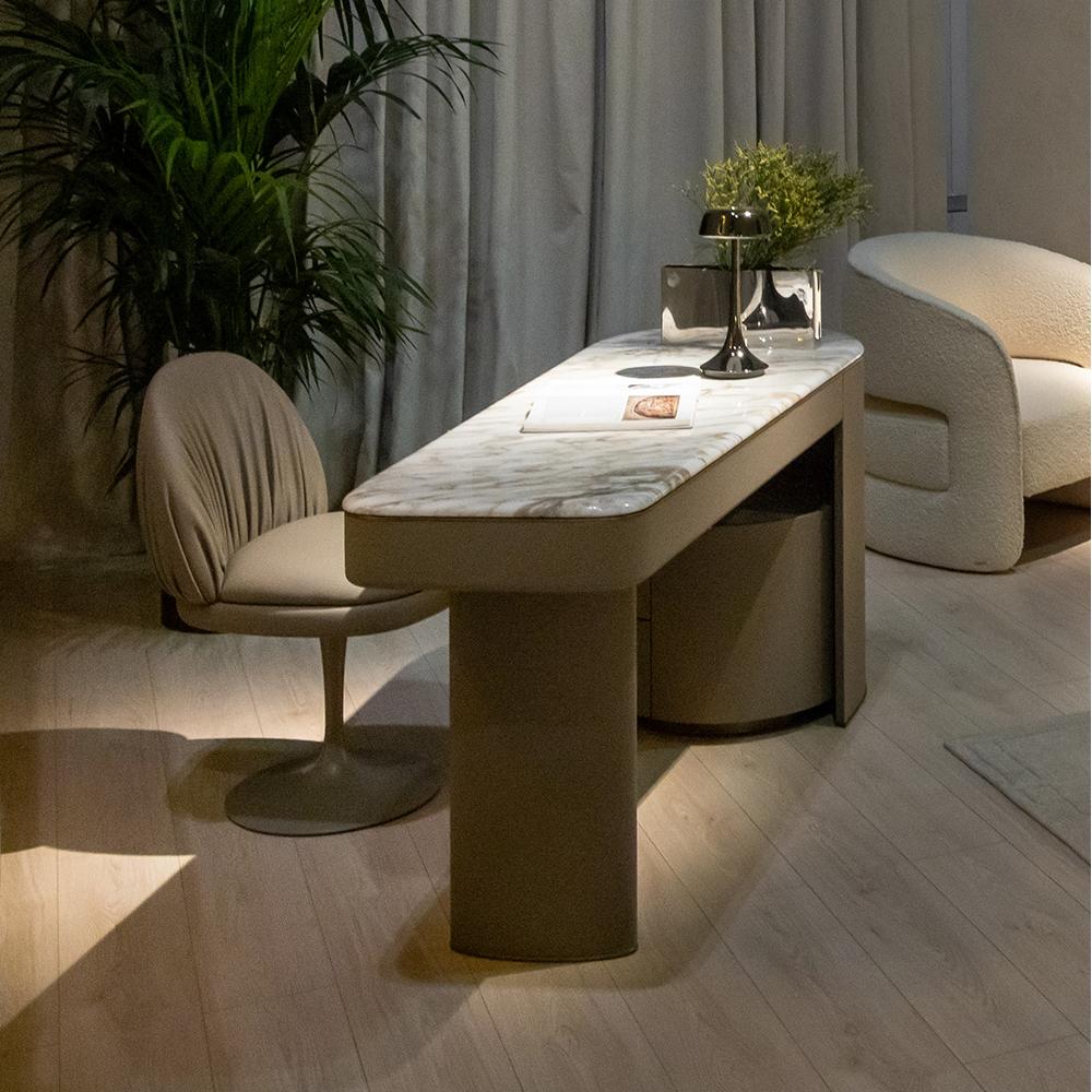 This dressing table features an elegant marble countertop and smooth metal support, outlining a modern and minimalist luxury style. The marble texture is like a natural artwork, paired with exquisite metal edging, showcasing high-end taste.