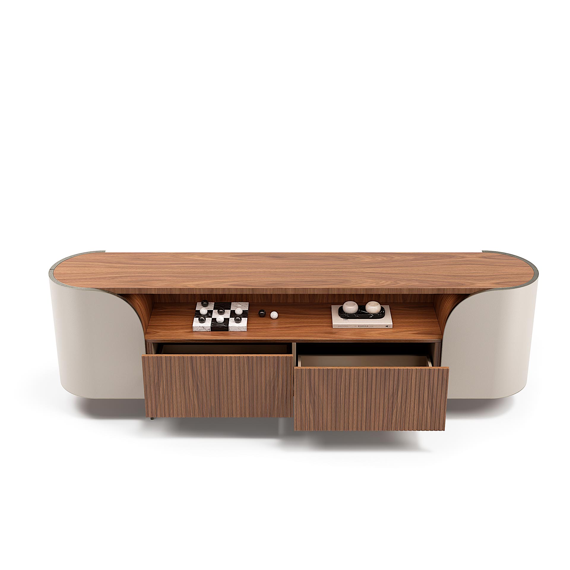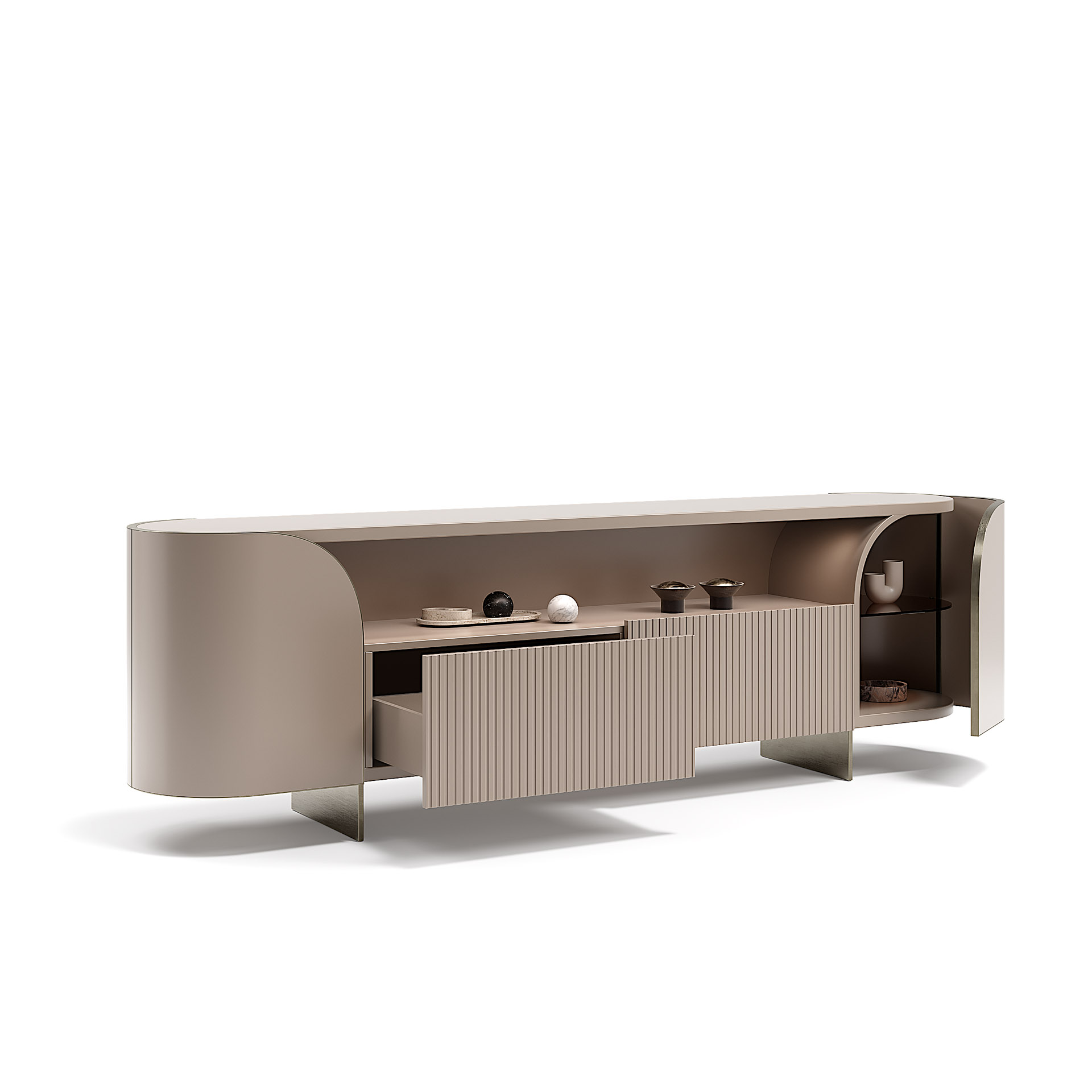 This modern style side cabinet cleverly combines beige and brown wood textures to outline the beauty of elegant curves, injecting a touch of light luxury into the home space. Its unique open and closed storage design can not only neatly store items, but also display exquisite ornaments, easily meeting your storage needs.