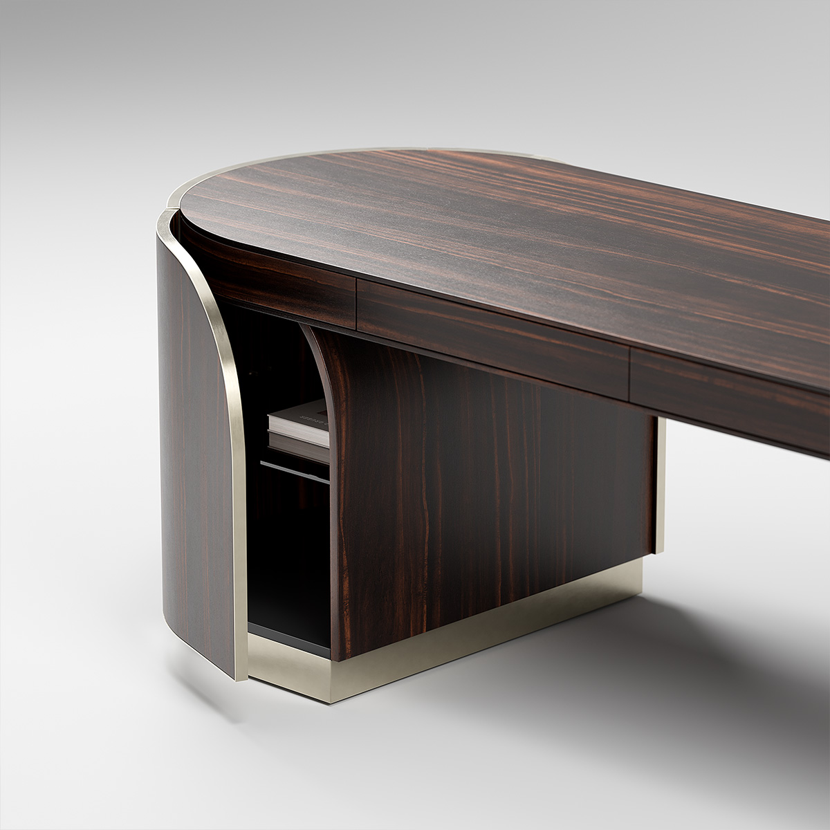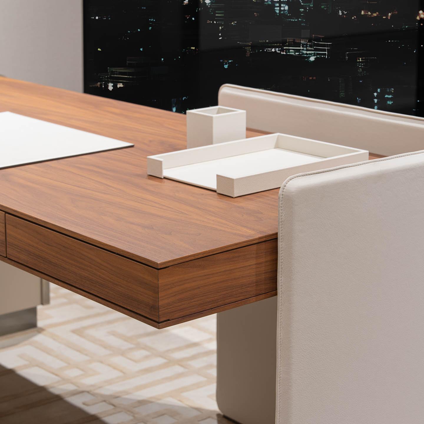 This modern office desk, with its unique curved design and elegant wooden tabletop, not only provides spacious workspace but also adds a modern touch to the office. The metal frame structure of the office desk is sturdy, ensuring long-term durability. The built-in drawers and storage space keep your office supplies organized and maintain a clean working environment.