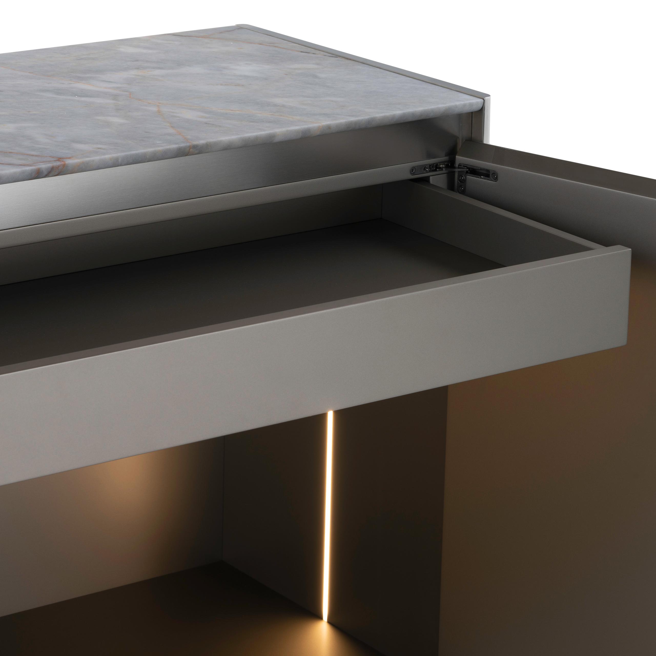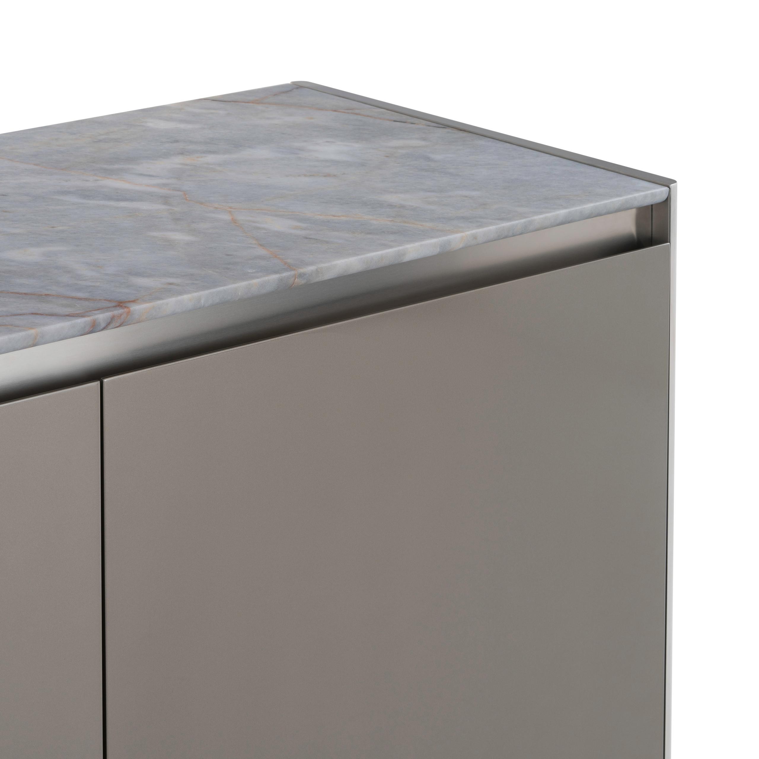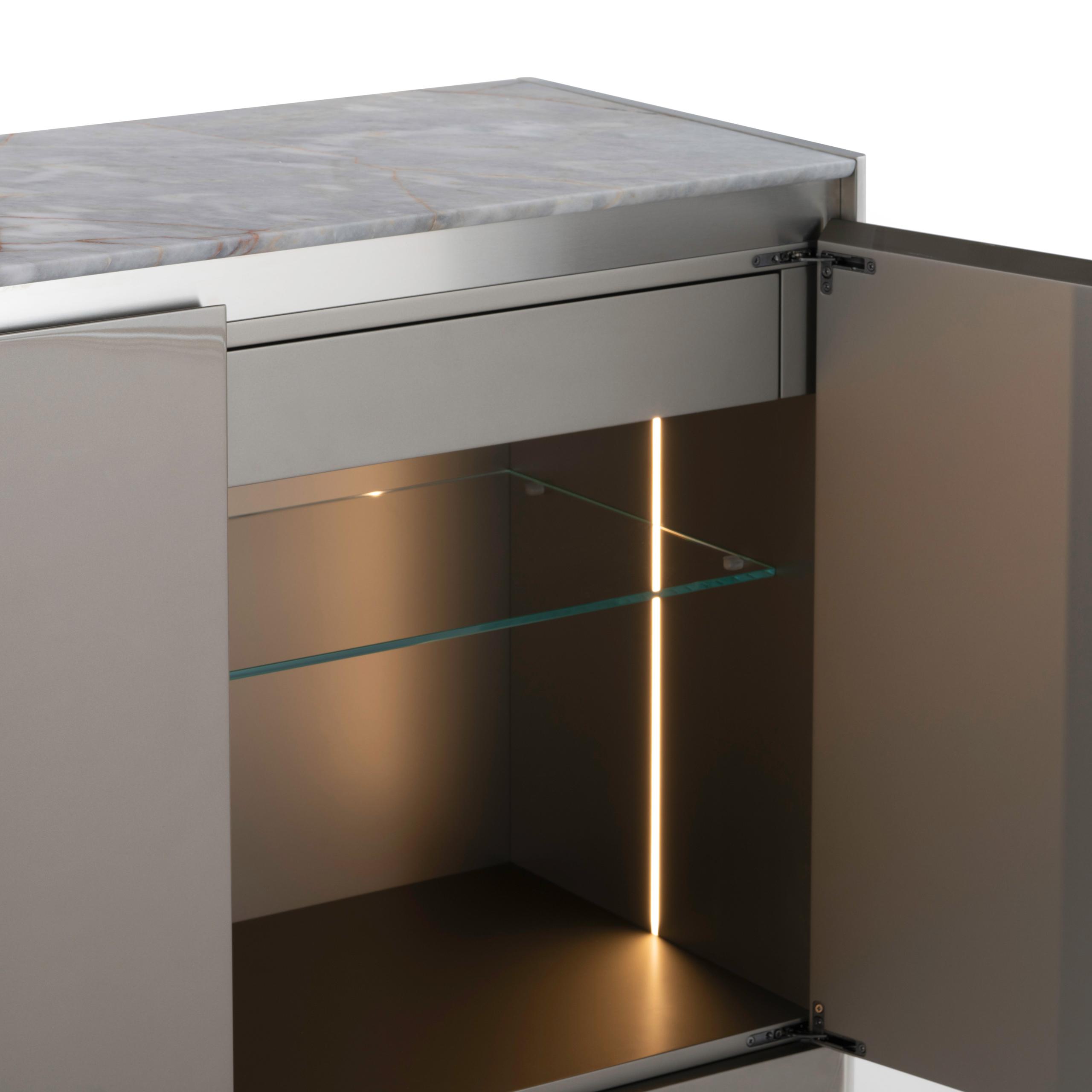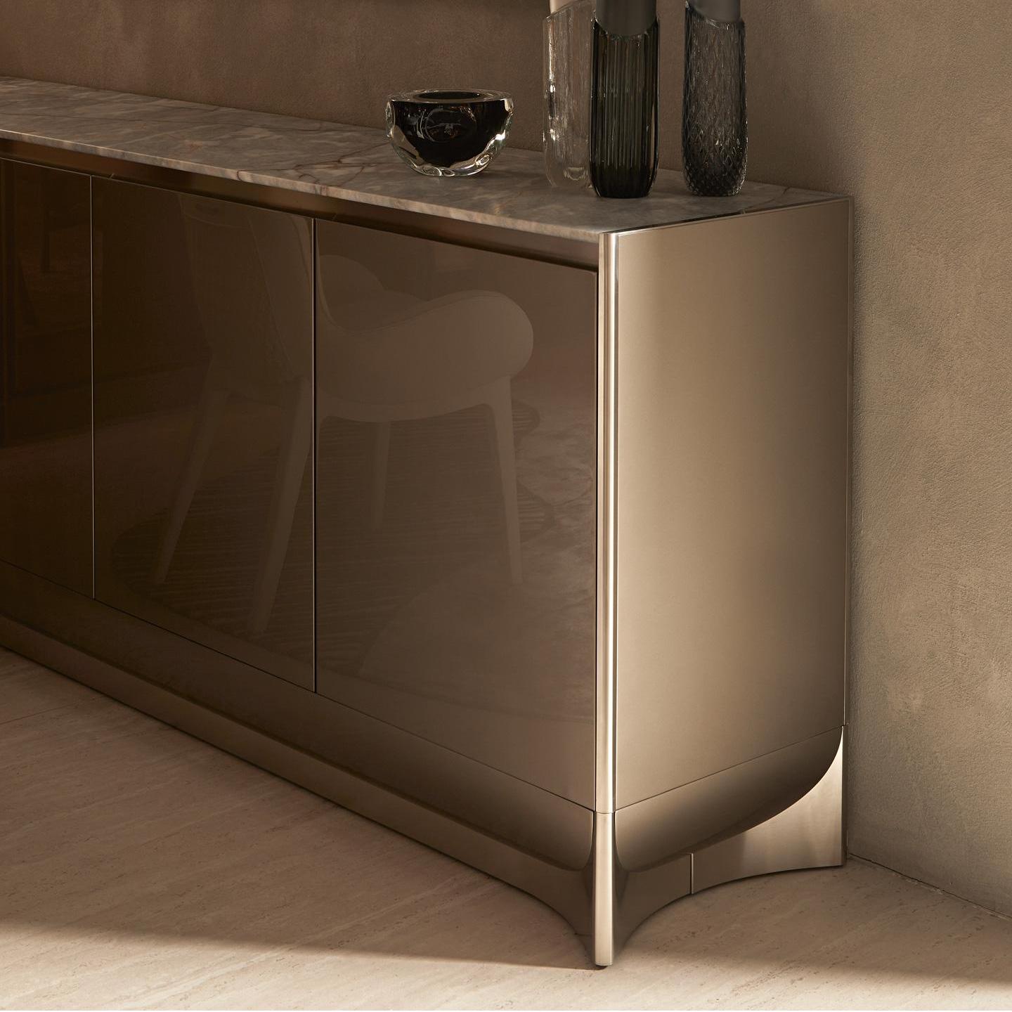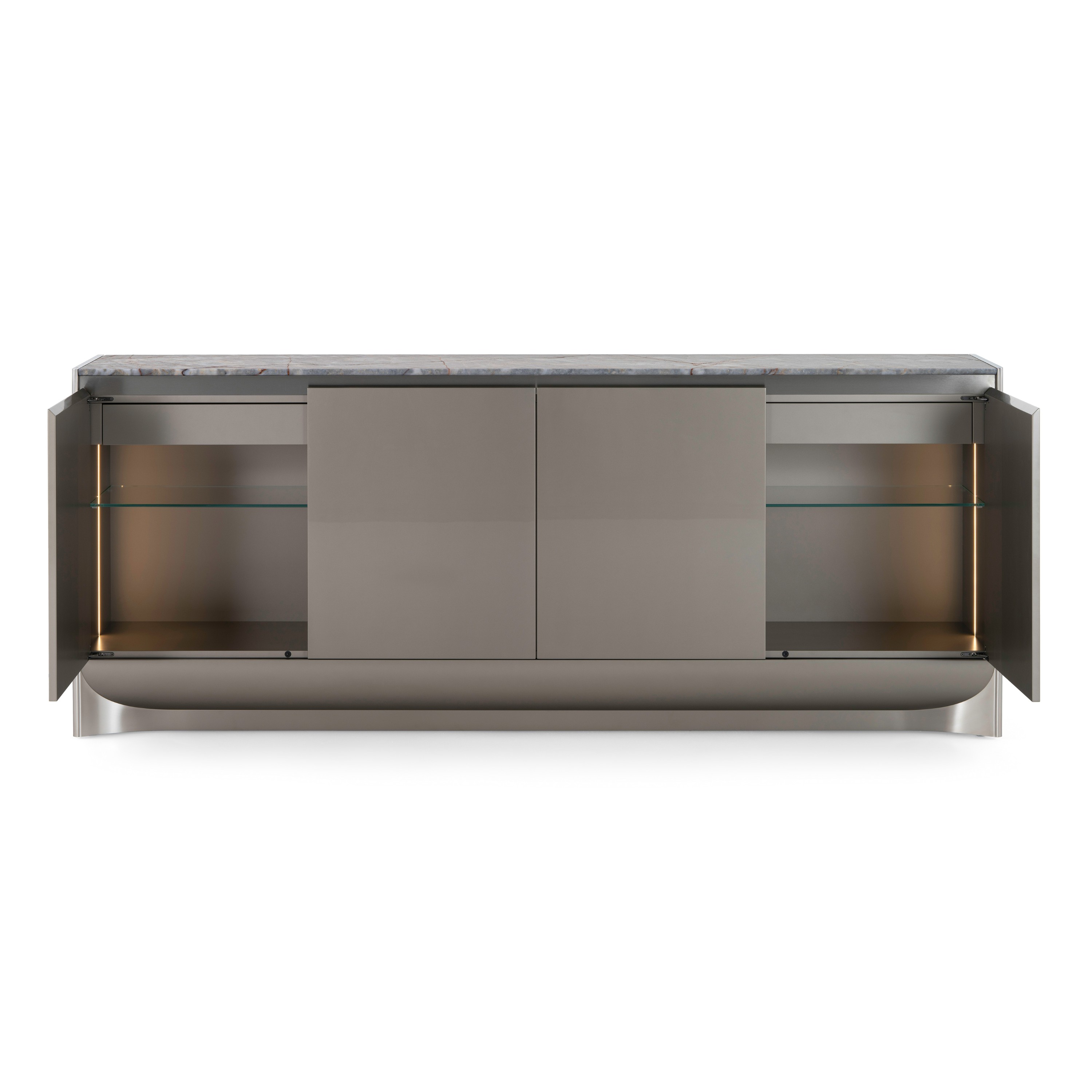 Sideboard in MDF and multilayer, with shaped marble top, available in glossy or open-pore matte finish. Glossy lacquered 100 gloss fronts and sides, satin steel plinth extending into vertical profiles up to the top. Interior in coordinated matte finish includes two drawers and glass shelves. Optional integrated LED lighting available.