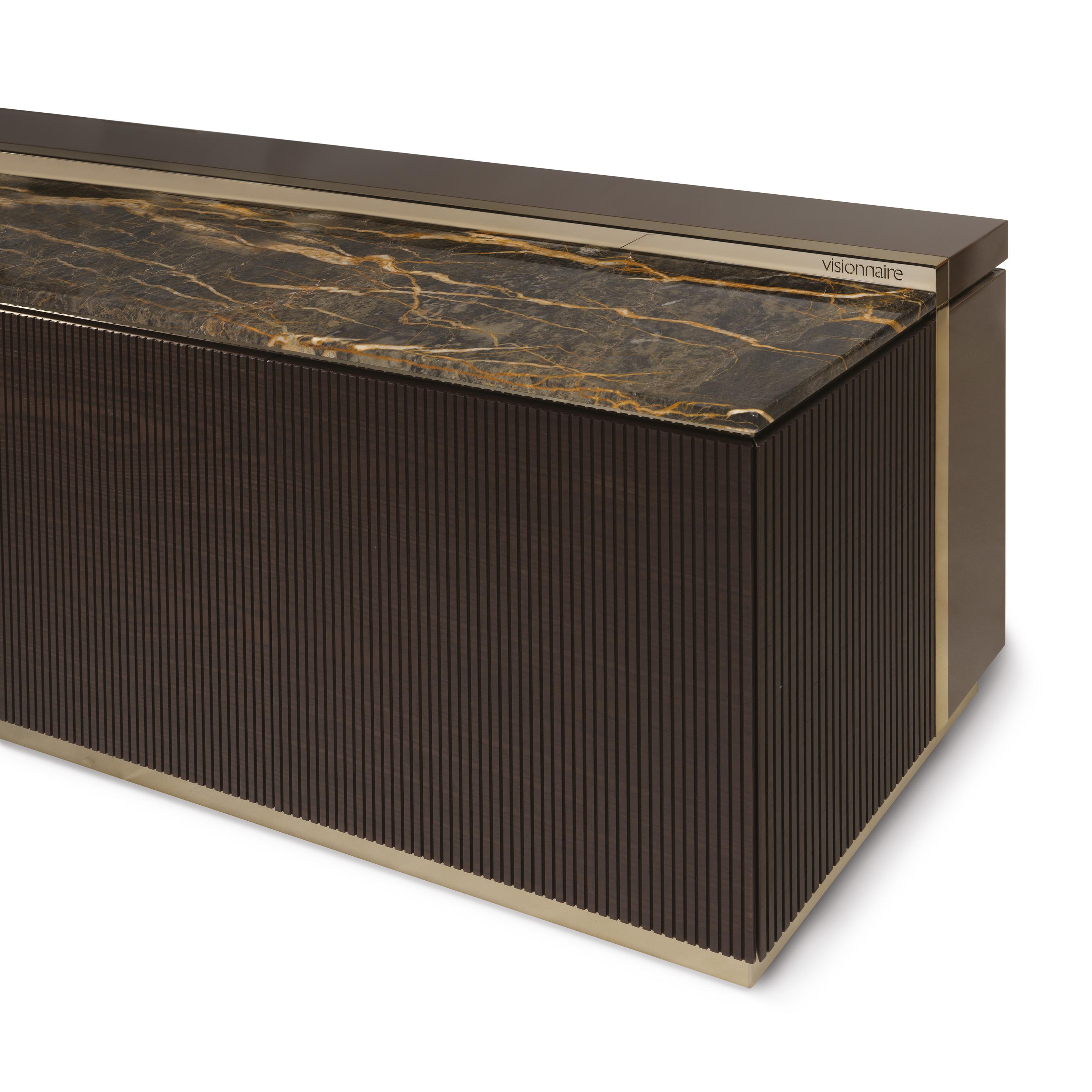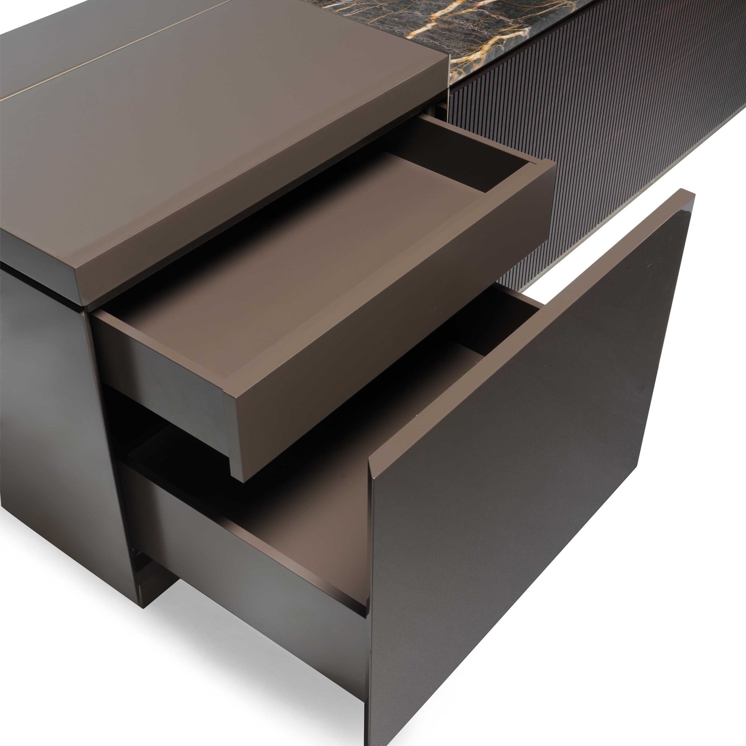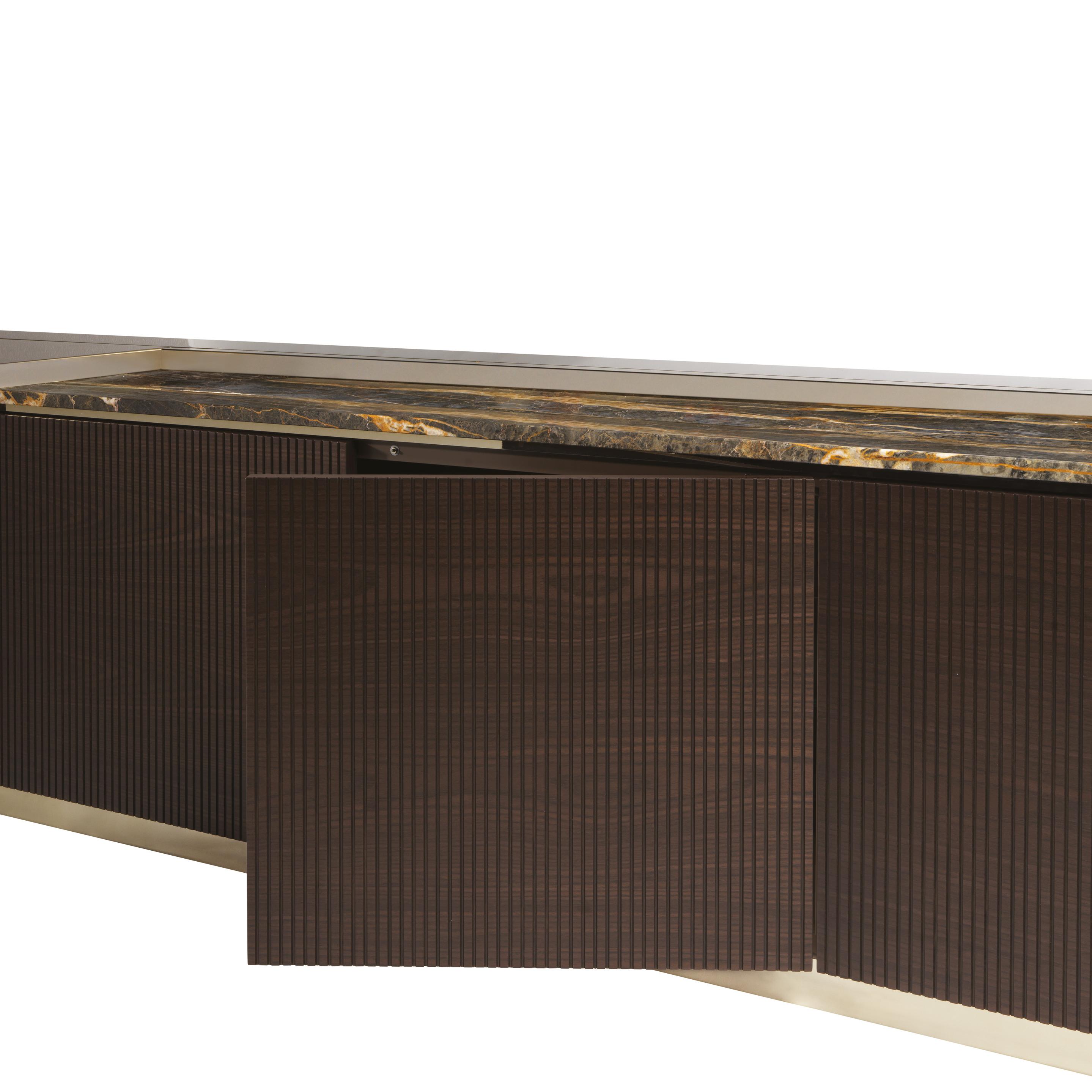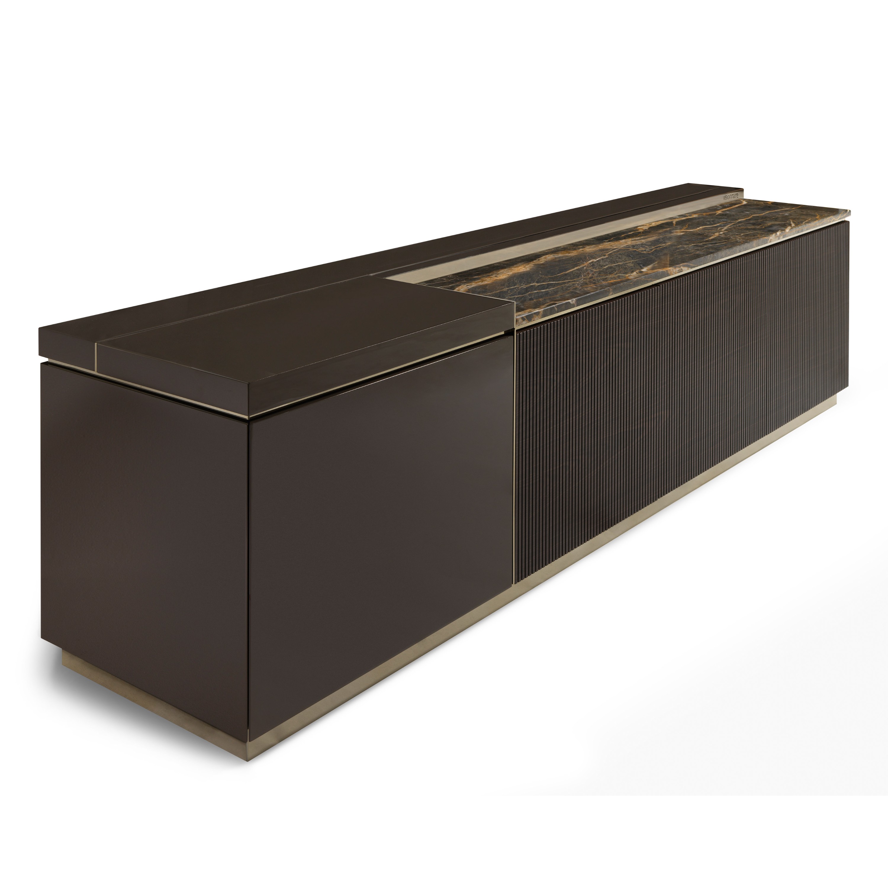 Low cabinet with wooden structure, veneered and lacquered in RAL/NCS colors with matte or glossy finish. The three doors, carved with a fluted pattern, match the cabinet’s finish. The top is partially covered in marble and framed by polished or satin metal profiles, available in the collection’s selected finishes.