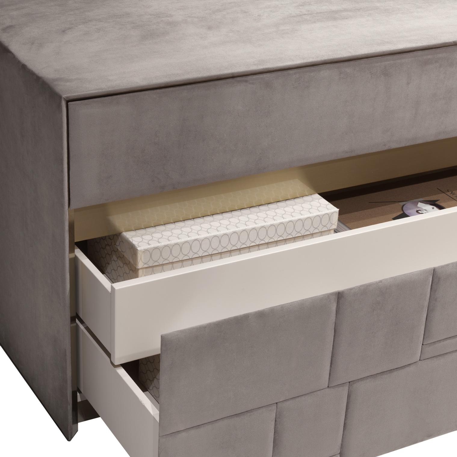 Dresser with MDF structure, upholstered in quilted leather or fabric with a geometric pattern. Light padding adds volume to the panels, which continue on the drawer fronts defined by recessed grips with satin steel inserts. Matte lacquered interiors, plywood drawers with soft-close slides. Plinth clad in metal, available in selected finishes.