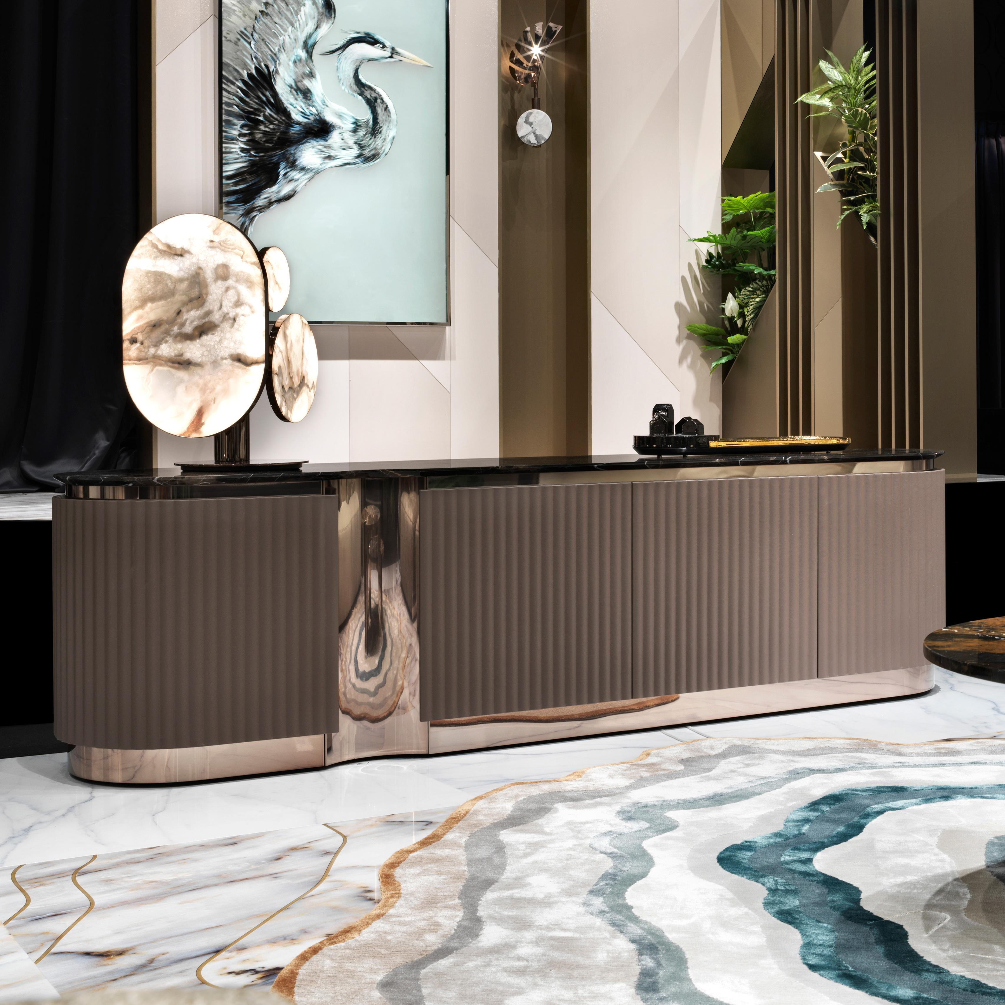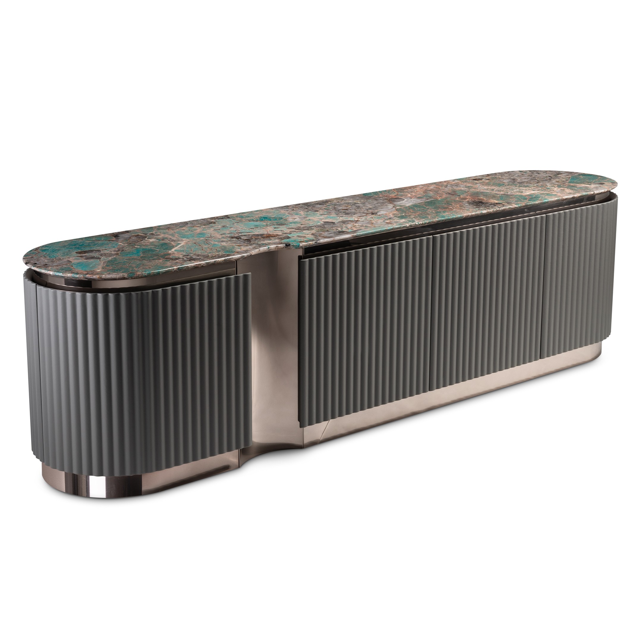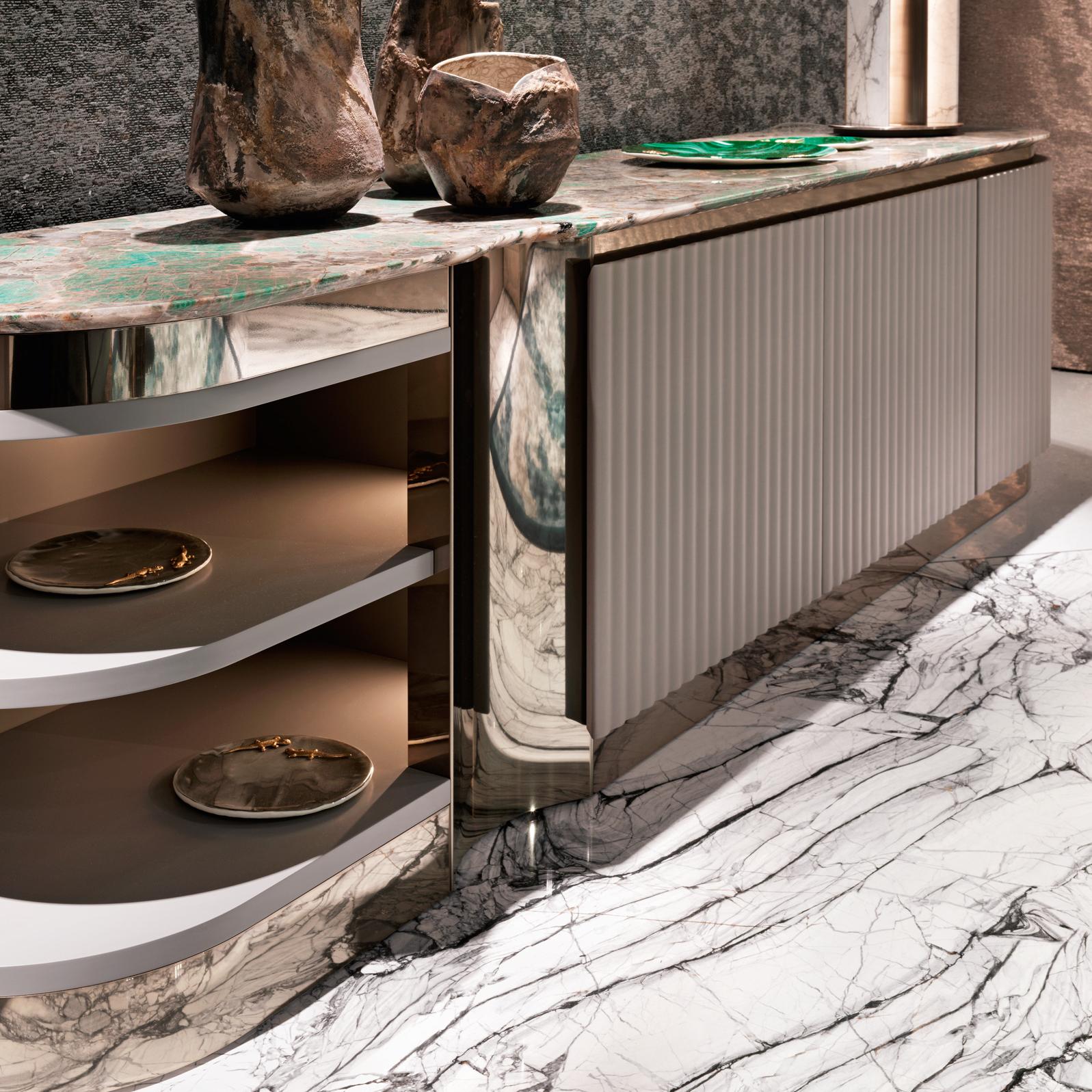 Low cabinet with four doors, wood structure with curved polished stainless steel profiles. The base, lower trim, and uprights are clad in concave and convex portions of curved polished stainless steel. Doors and sides feature relief surfaces, available in glossy lacquer, Soft Leather, or burl veneer with 100 gloss finish. Beveled marble top, matte lacquered interiors, and optional LED lighting in side compartments.