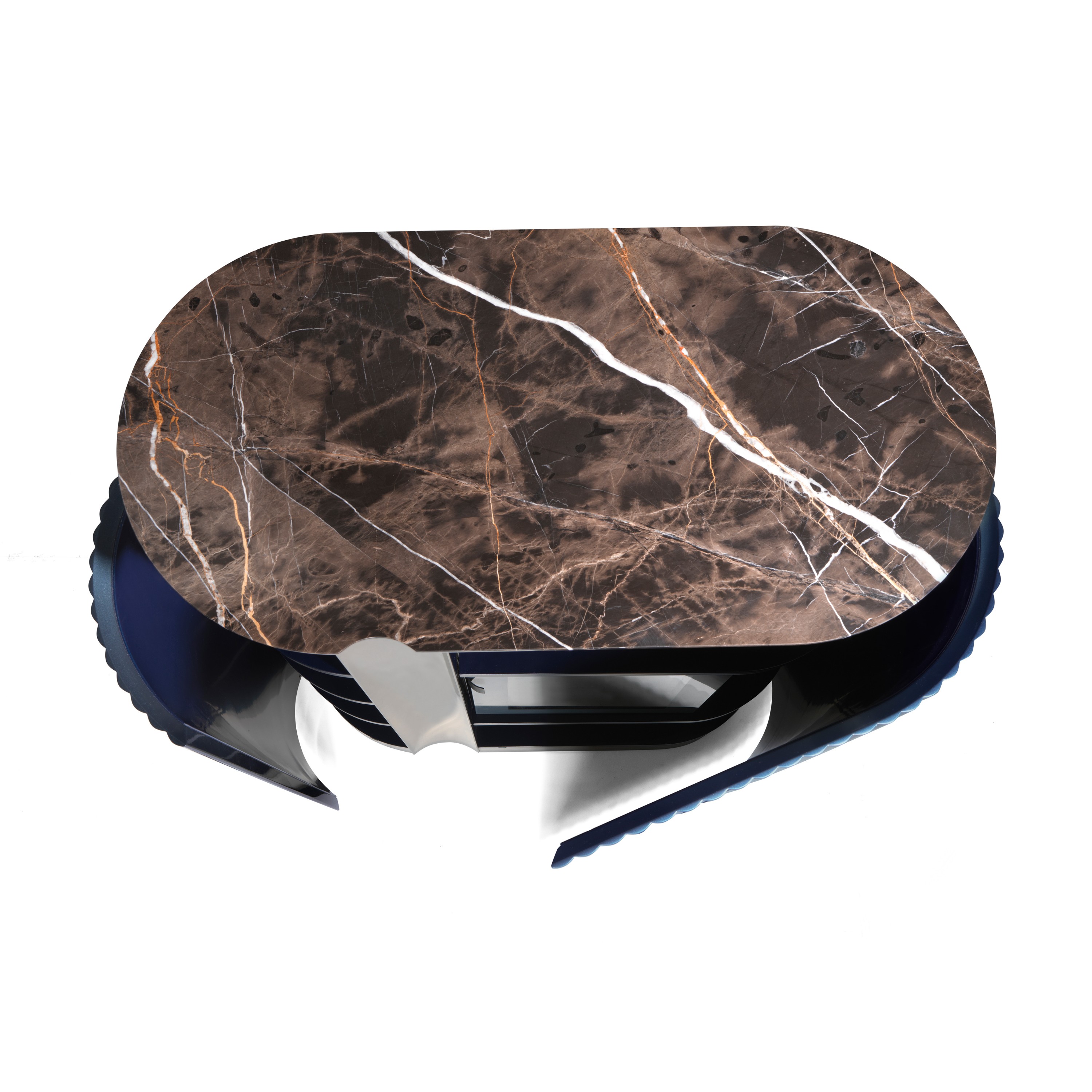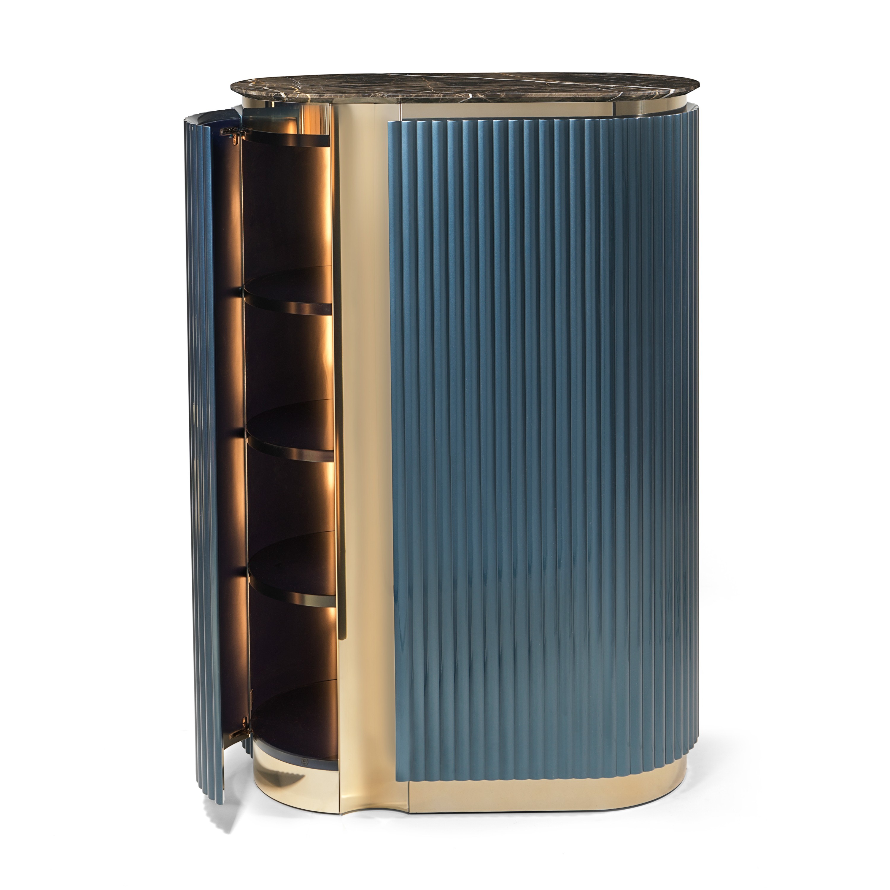 Tall bar cabinet with two curved doors, wooden structure with curved polished stainless steel profiles and base. Doors and side panels are fluted in low-relief, available in glossy or metallic finish. The interior is matte lacquered with a polished marble top and beveled edge. Optional LED interior lighting and 35-liter minibar available.