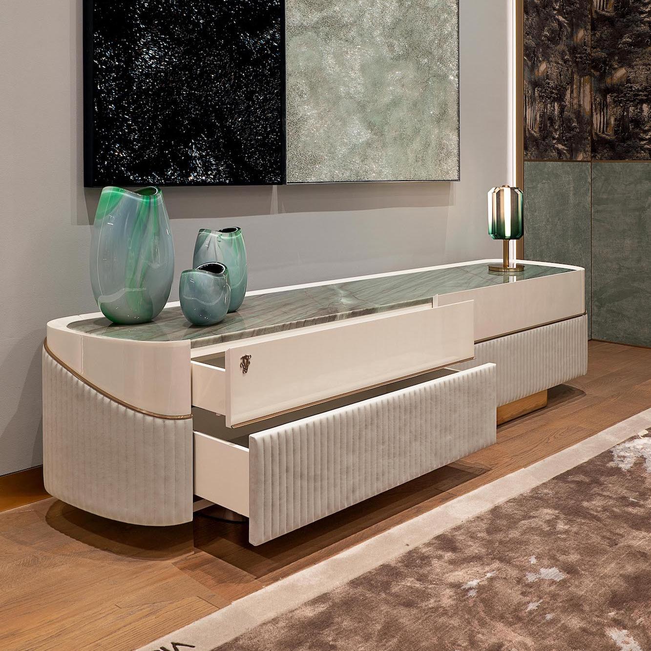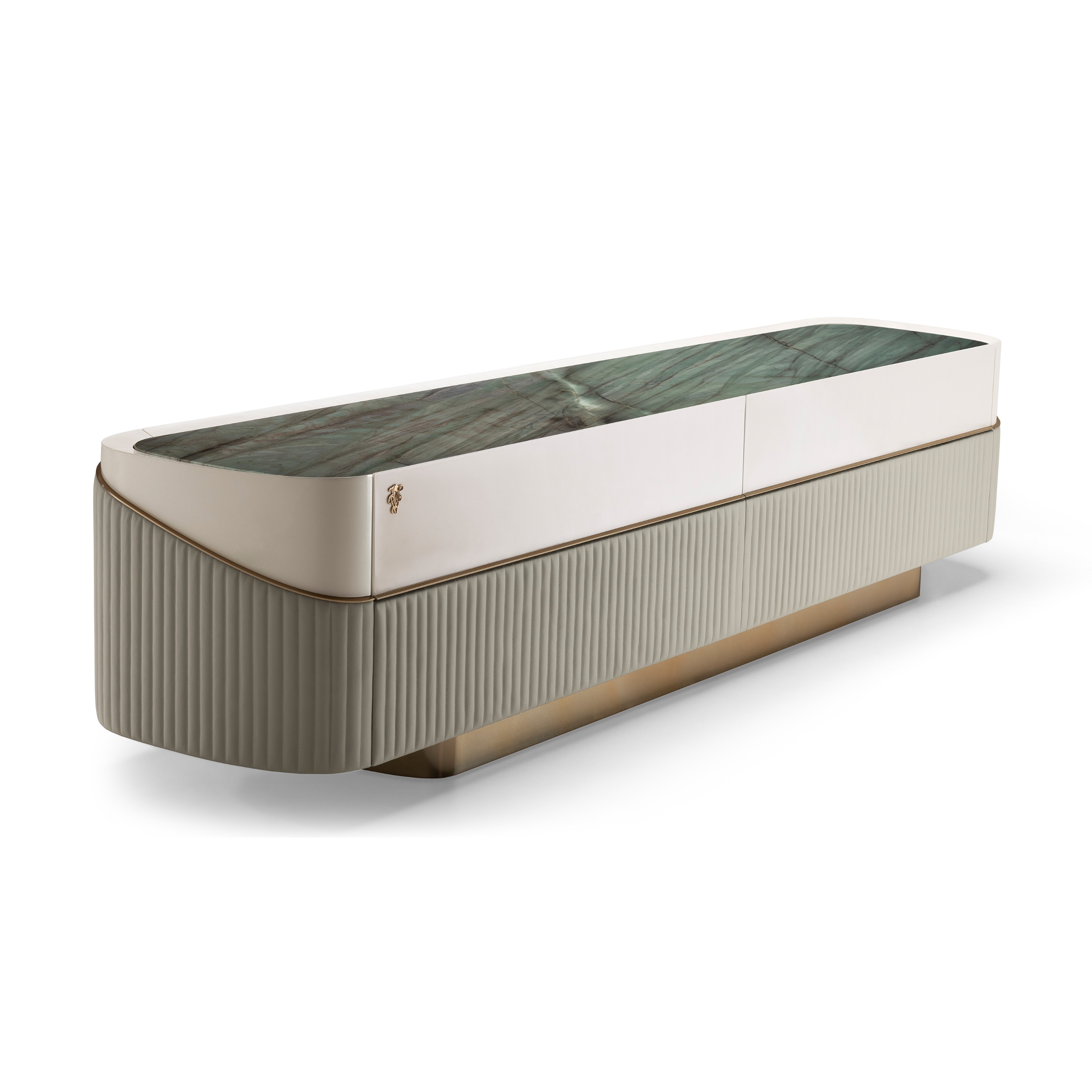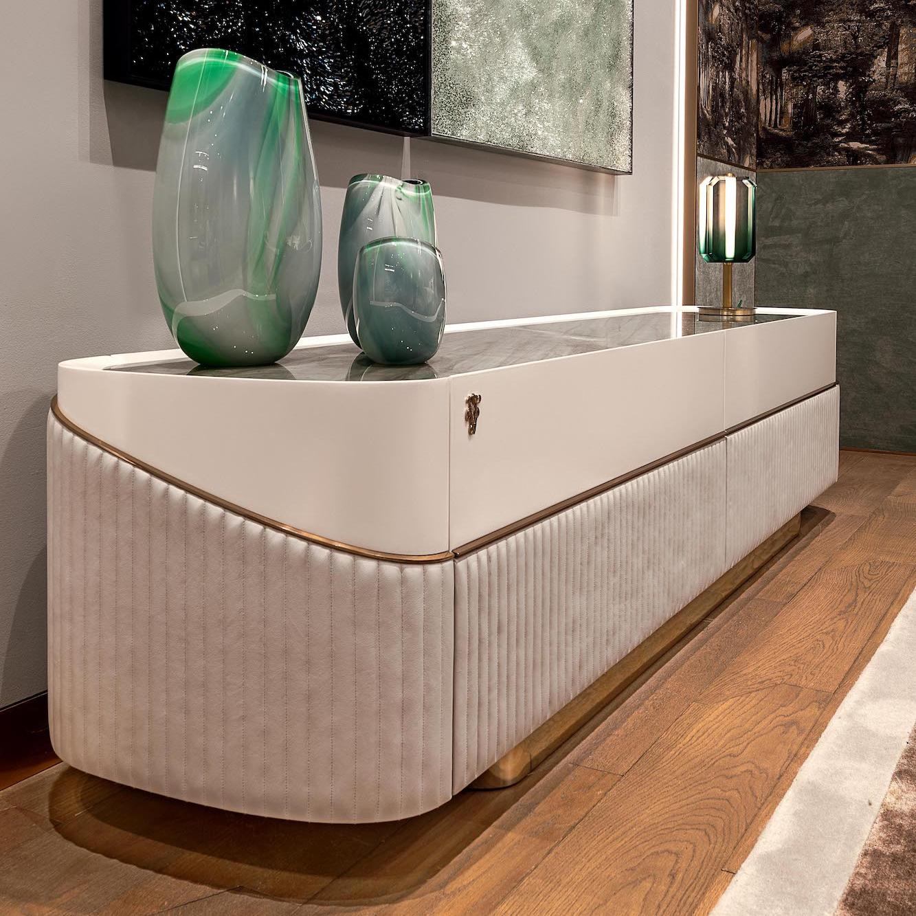 Four-drawer dresser with shaped shell and curved sides, defined by a dual finish: glossy RAL lacquer on the upper part and quilted “canneté” leather or fabric on the lower portion, divided by an angled polished stainless steel profile. Inset marble top, base or feet in polished metal.
