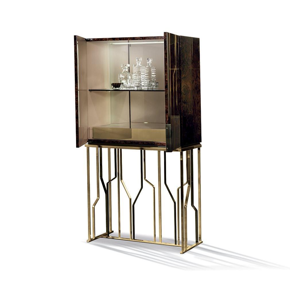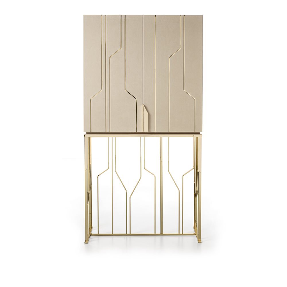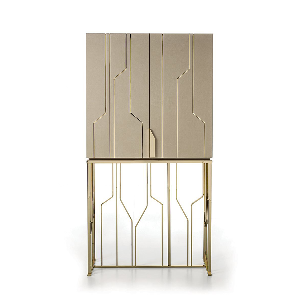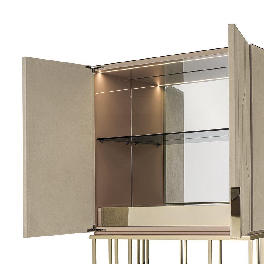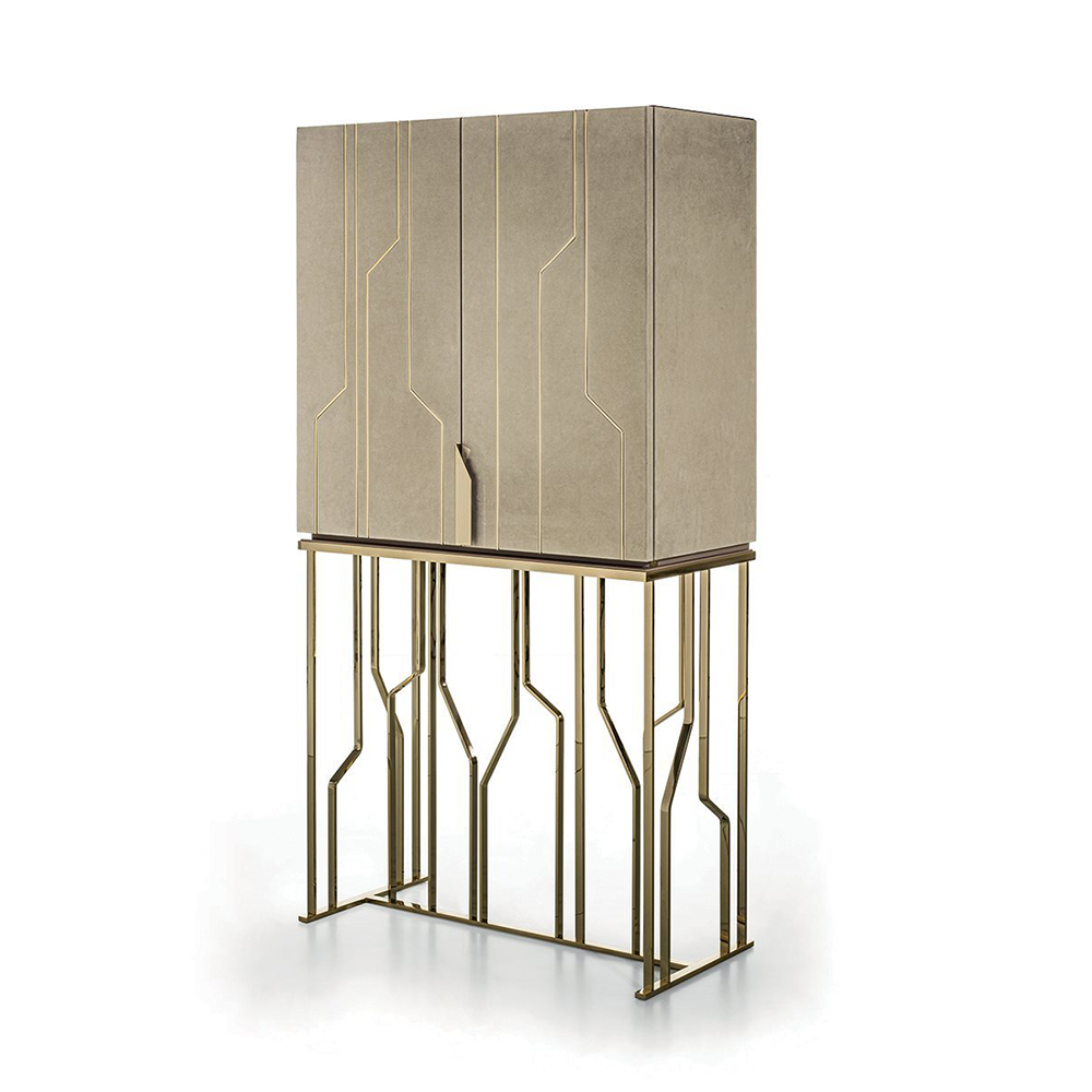 This display cabinet combines modern aesthetics with luxurious texture. The upper and lower layered design is both practical and has artistic display functions, suitable for storing alcoholic beverages or ornaments. The geometric shape of the base brings a sense of stability, while the lightweight visual effect enhances the sense of spatial hierarchy.
