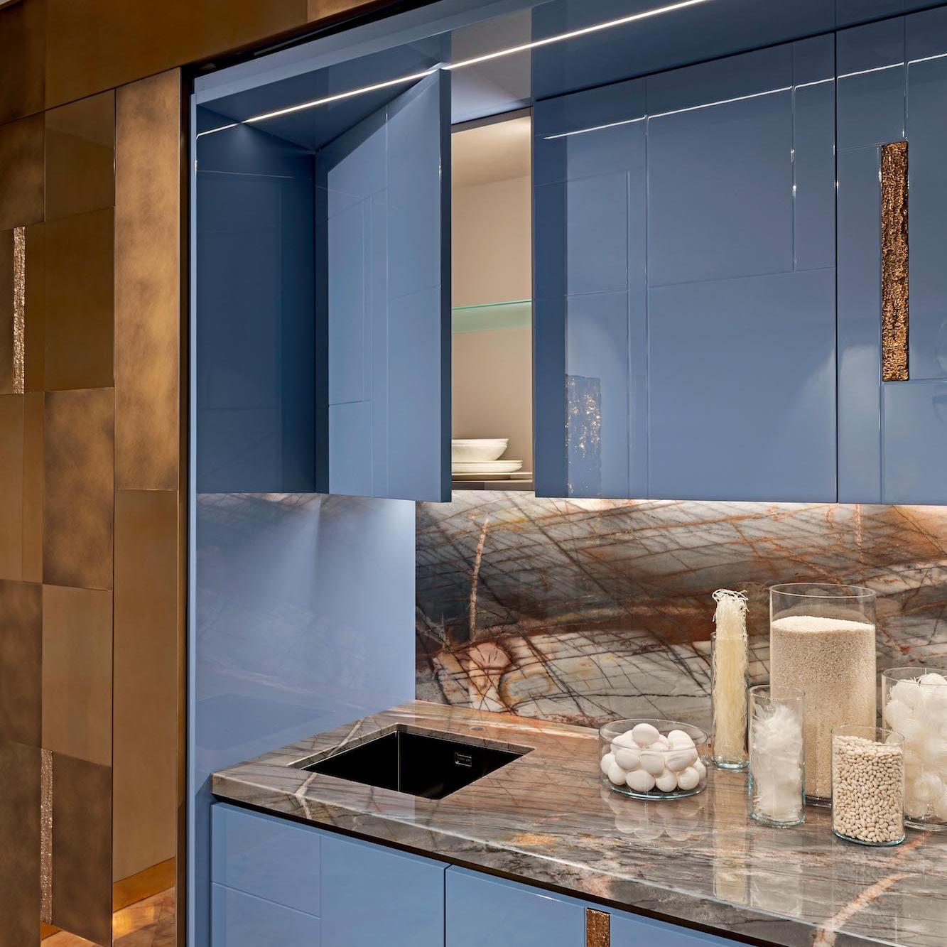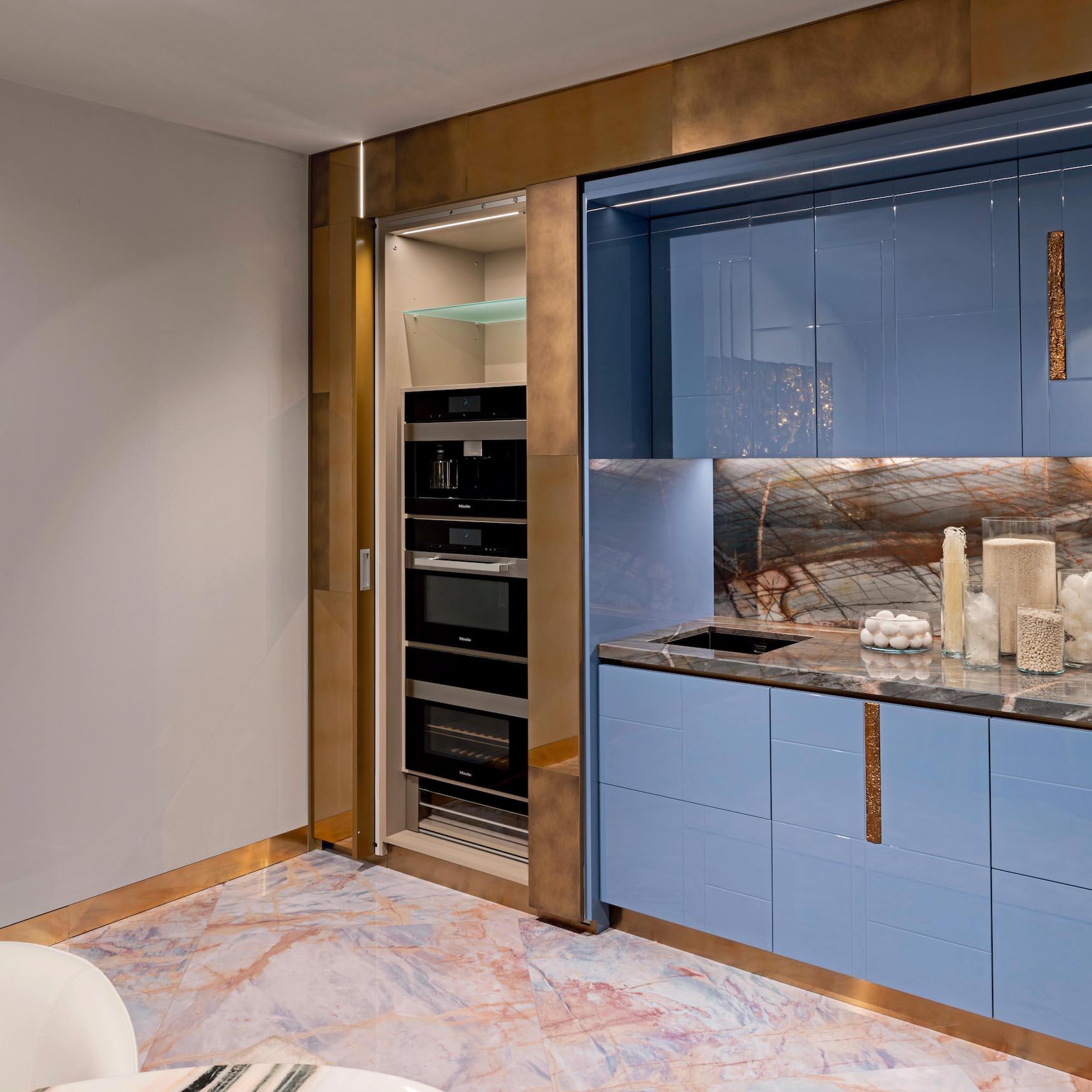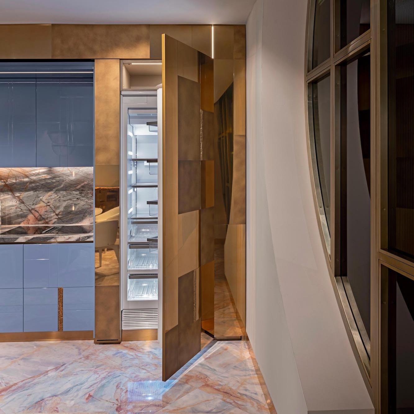 The kitchen adopts a hidden design, equipped with carved high gloss painted wooden doors and cast aluminum "bark" texture inserts. The functional area includes marble countertops and baffles, with built-in integrated sinks and stoves. The niche hiding system behind the steel patch wall is equipped with an electric opening and closing device, which combines practicality and concealment as a whole.