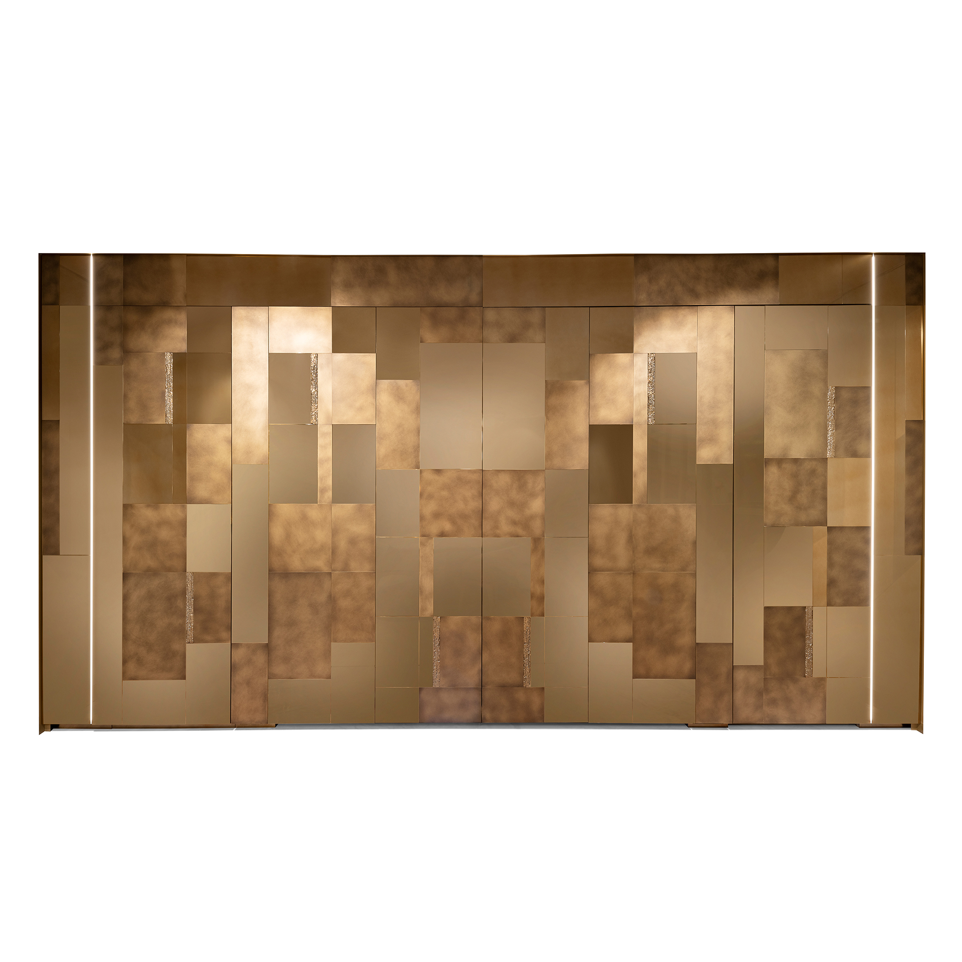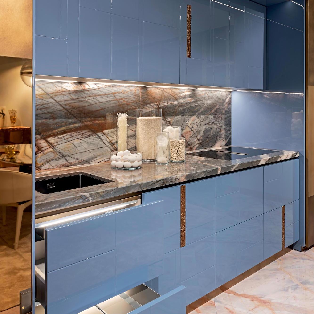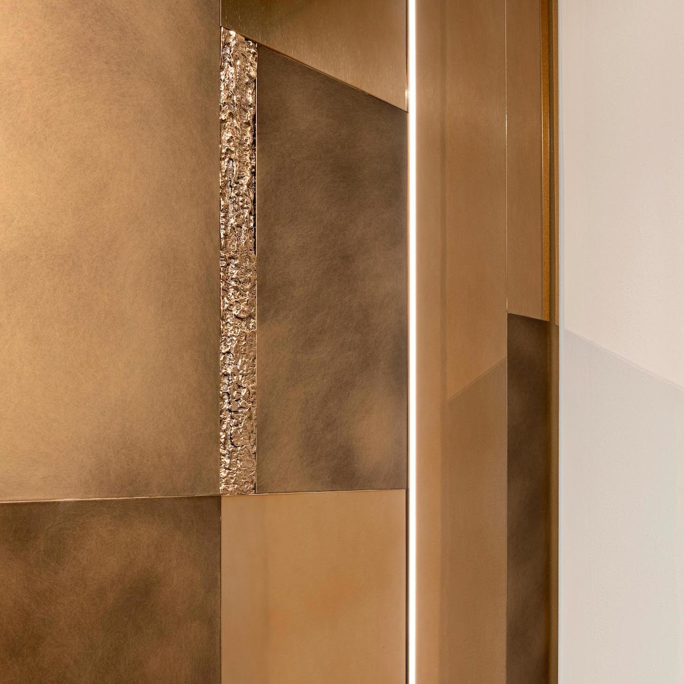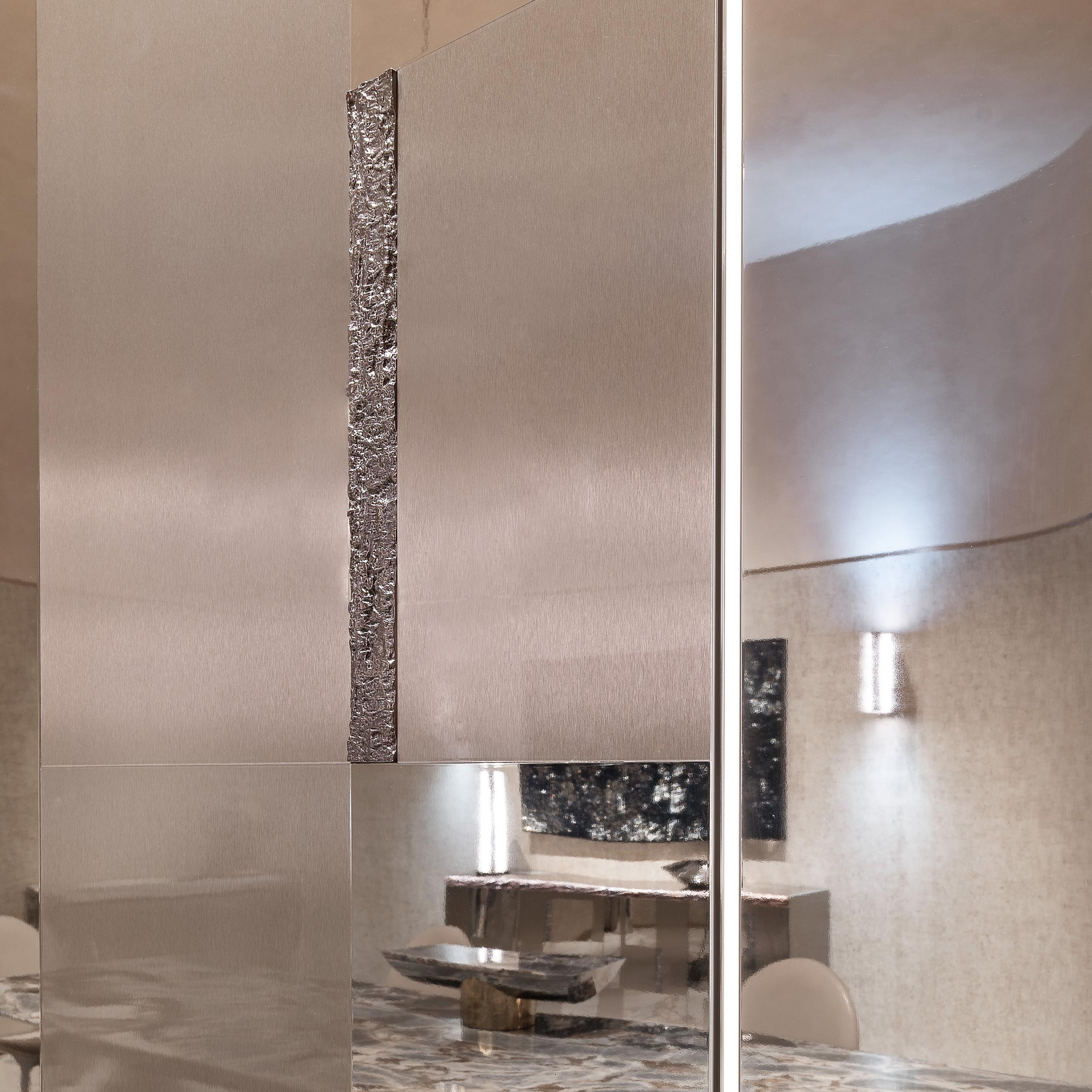 The kitchen adopts a hidden design, equipped with carved high gloss painted wooden doors and cast aluminum "bark" texture inserts. The functional area includes marble countertops and baffles, with built-in integrated sinks and stoves. The niche hiding system behind the steel patch wall is equipped with an electric opening and closing device, which combines practicality and concealment as a whole.