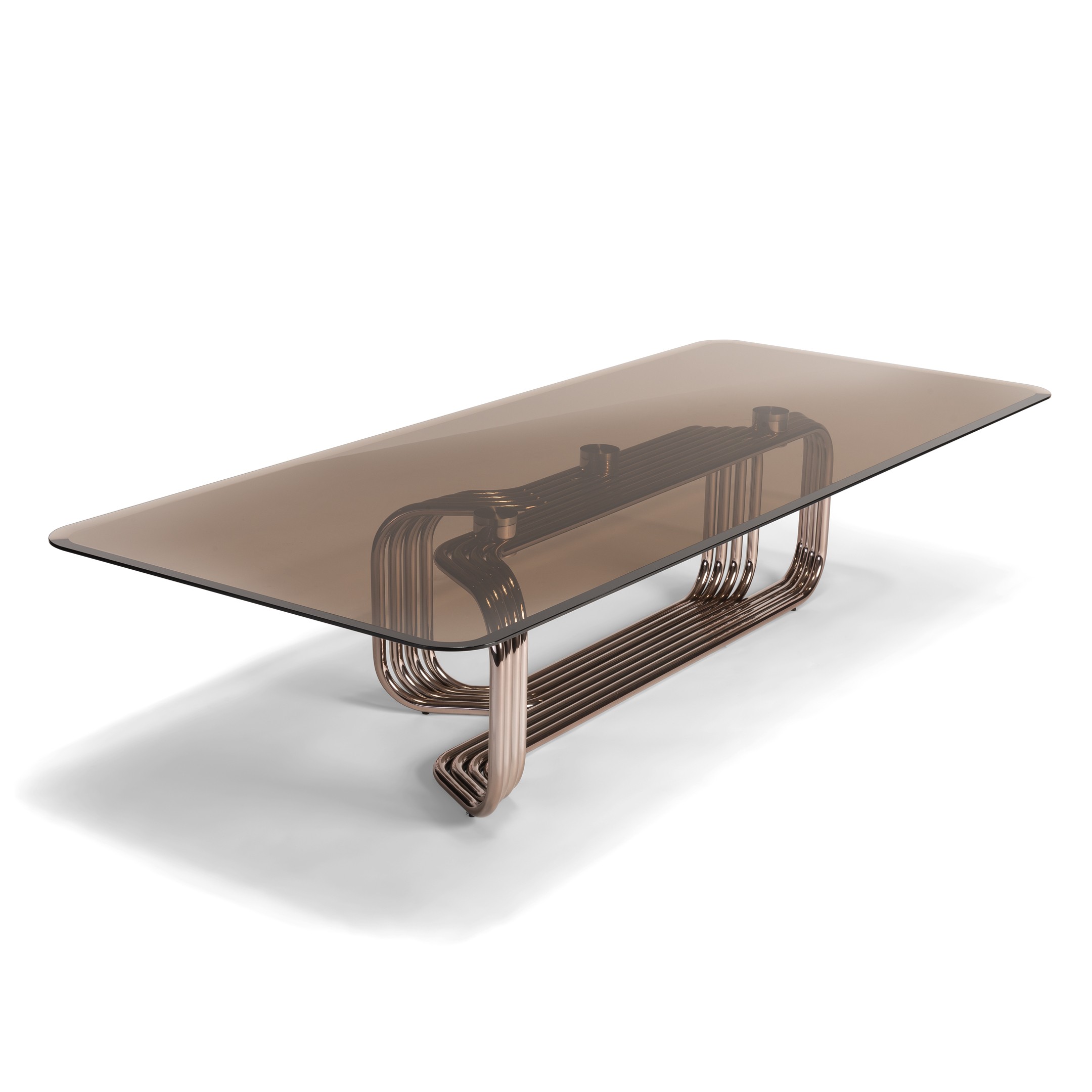 Low table with a sculptural single-element frame made of curved, intertwined chrome metal tubes. Available with a beveled glass top in fumé, bronze, or extra-clear variants, or with a beveled marble top paired with a steel under-top. Metal components come in selected finishes.