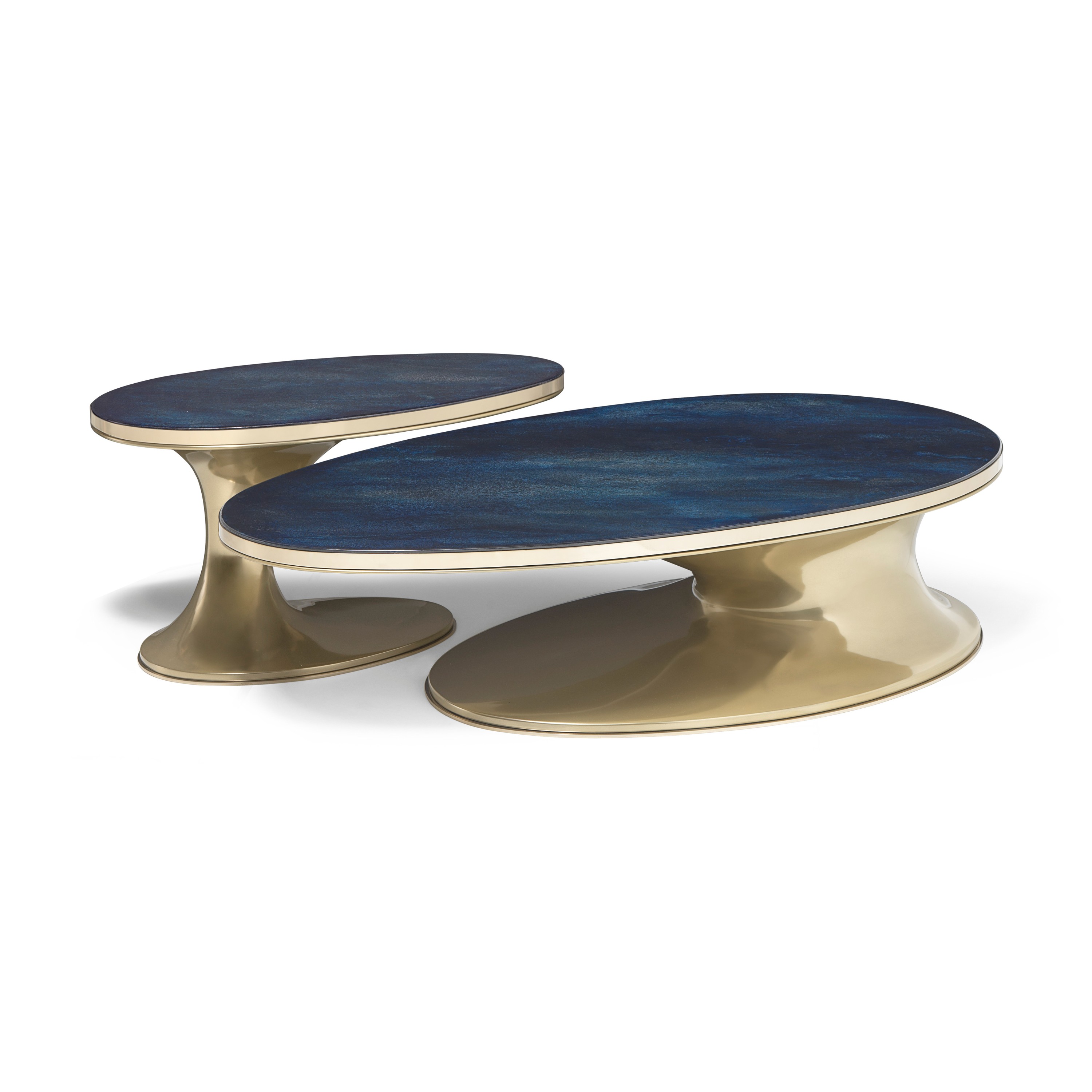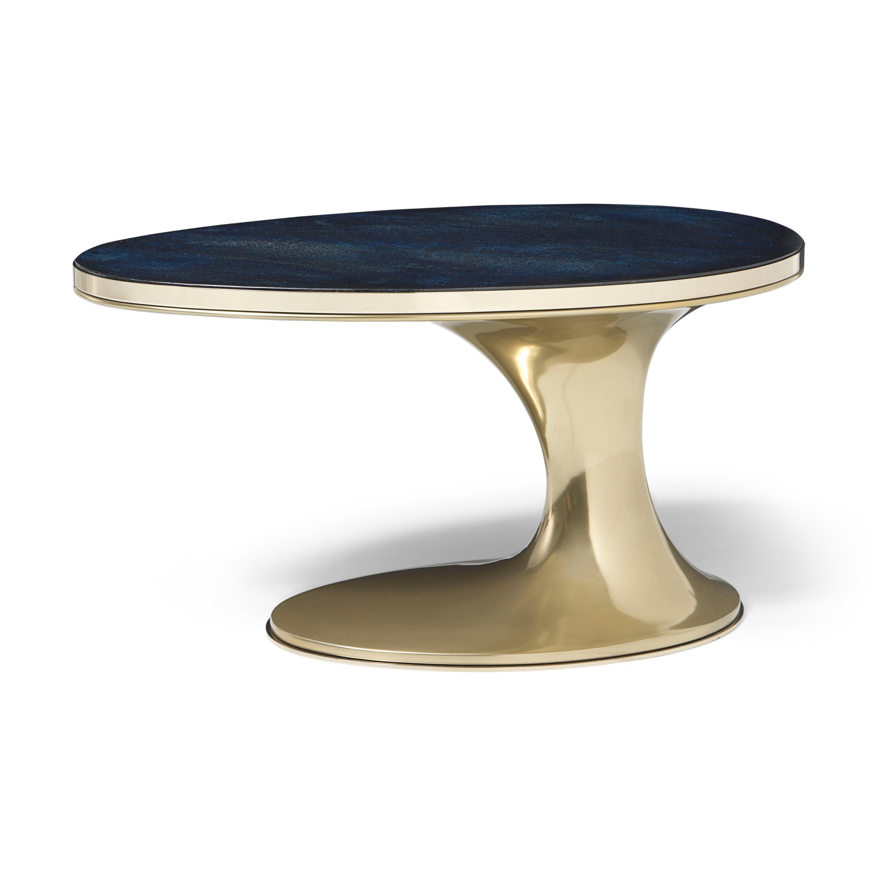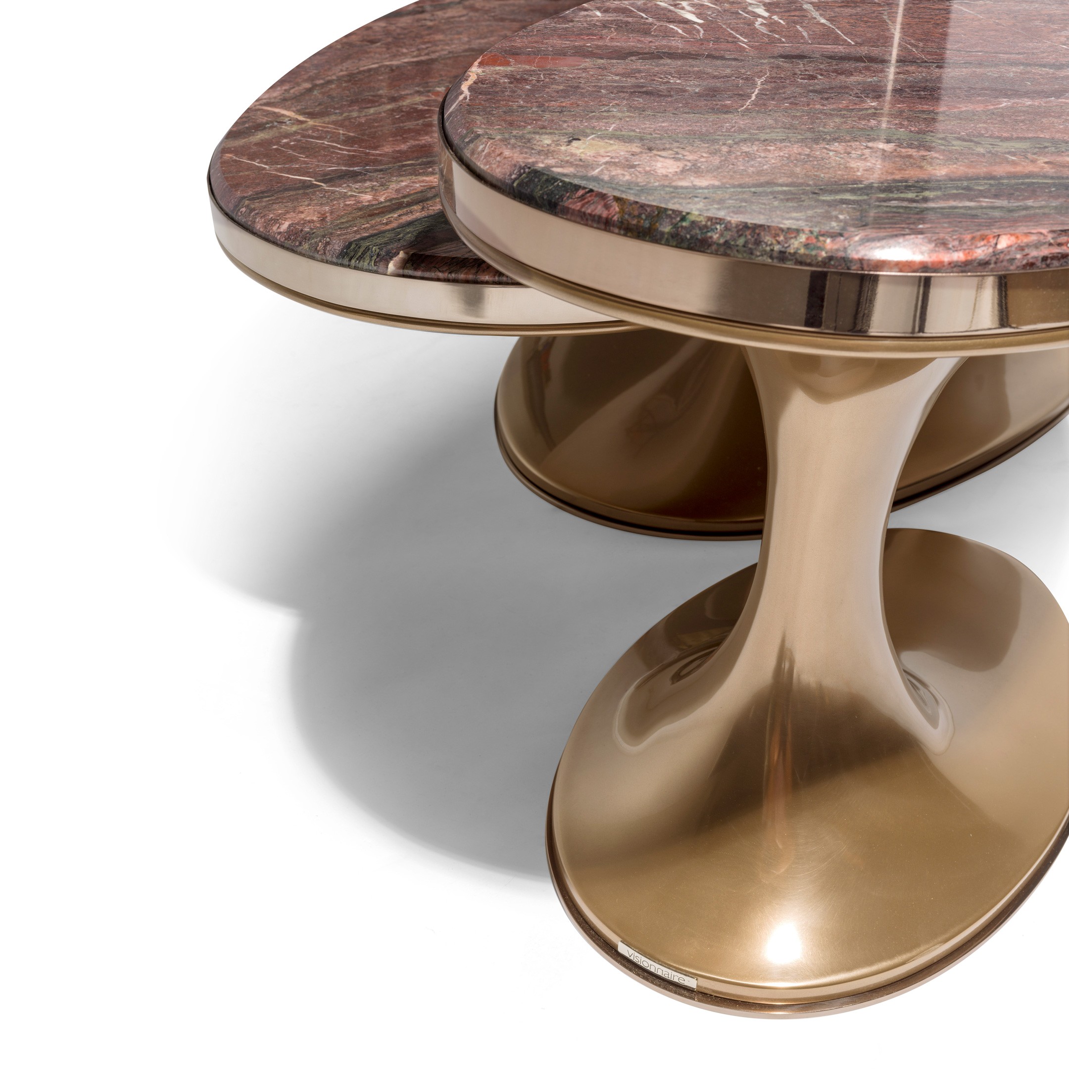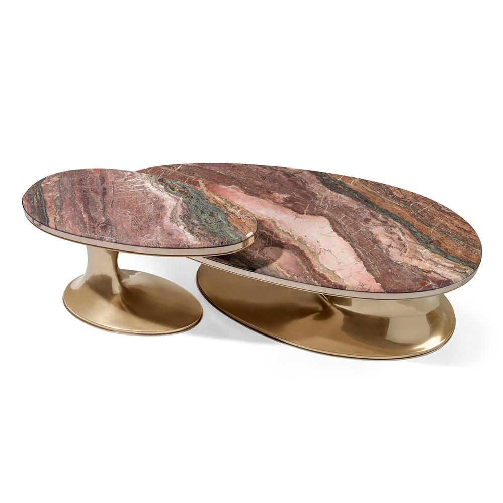 Low table with an organic-shaped base in nautical resin, finished with glossy metallic paint in bronze, gold, or manganese tones. The recessed top is available in polished marble or artistic resin from the collection. The upper edge and base are framed by polished stainless steel elements, offered in selected metal finishes.