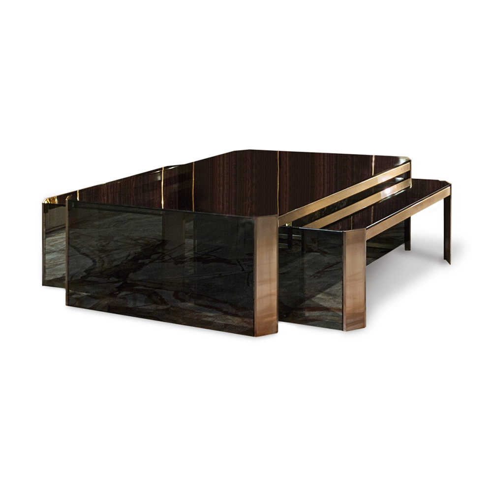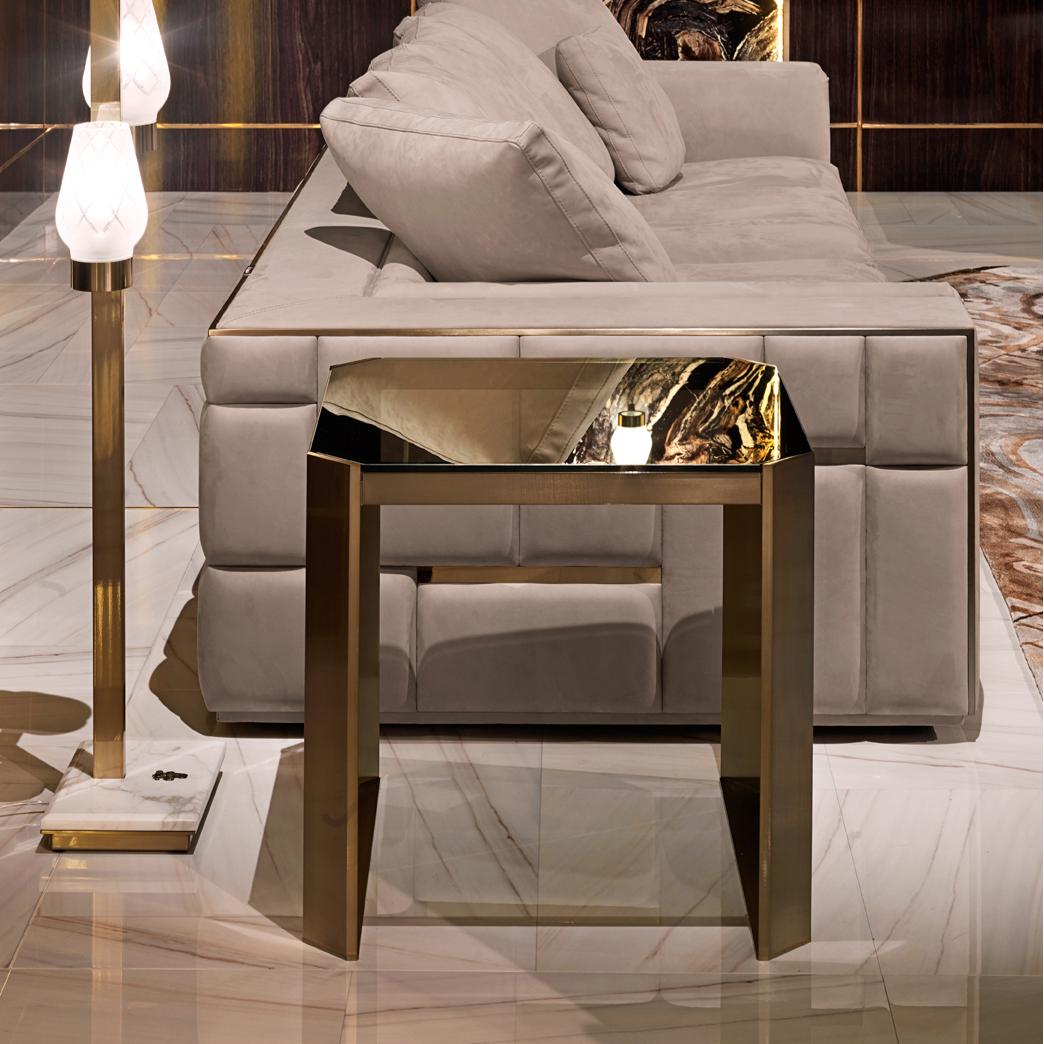 Side table with satin-finished stainless steel structure, defined by four thick, angled legs featuring deep satin finishing and an engraved logo. The top and sides in shaped smoked glass are UV-welded, with beveled edges that enhance transparency and reflection effects. Metal parts are available in the collection’s finish selection.