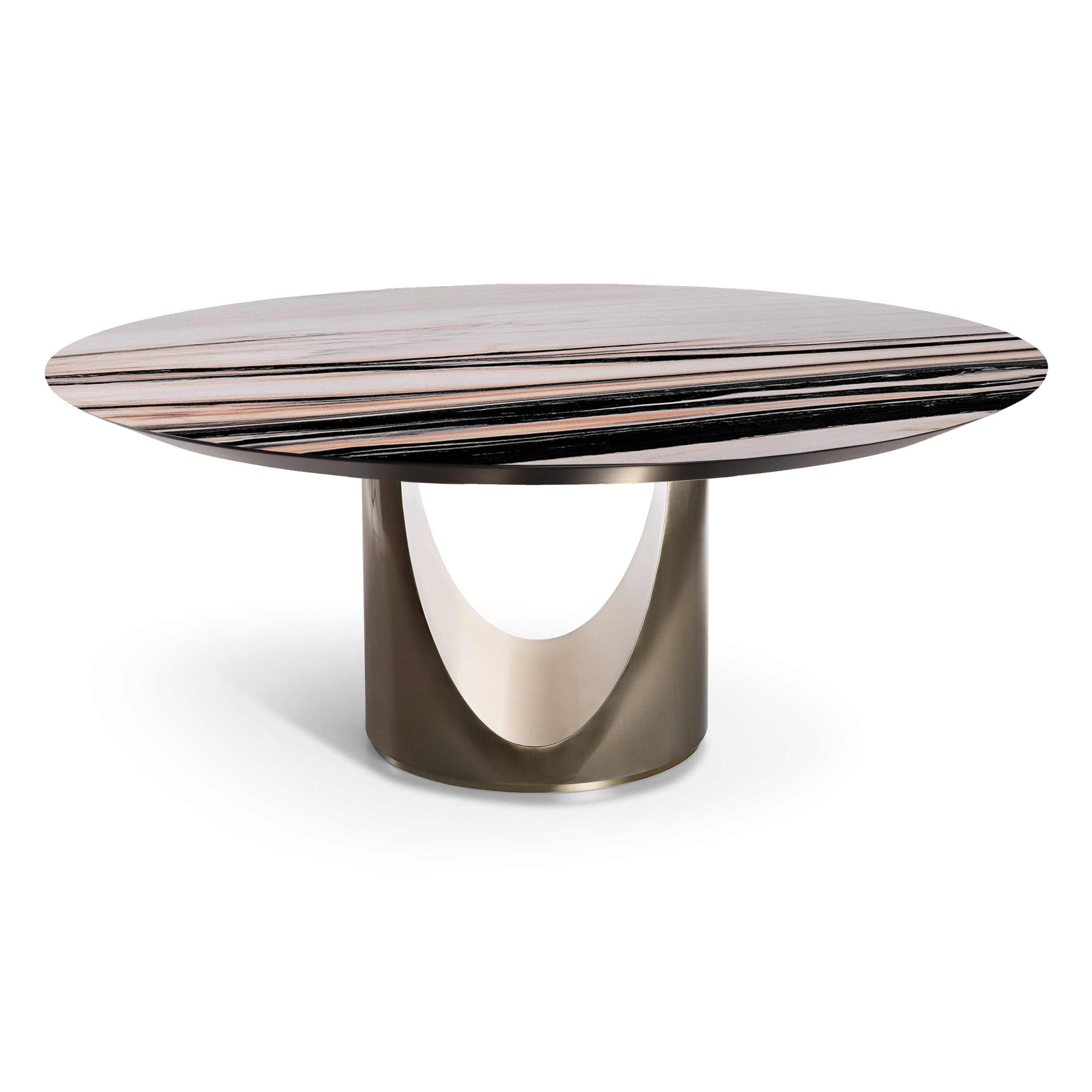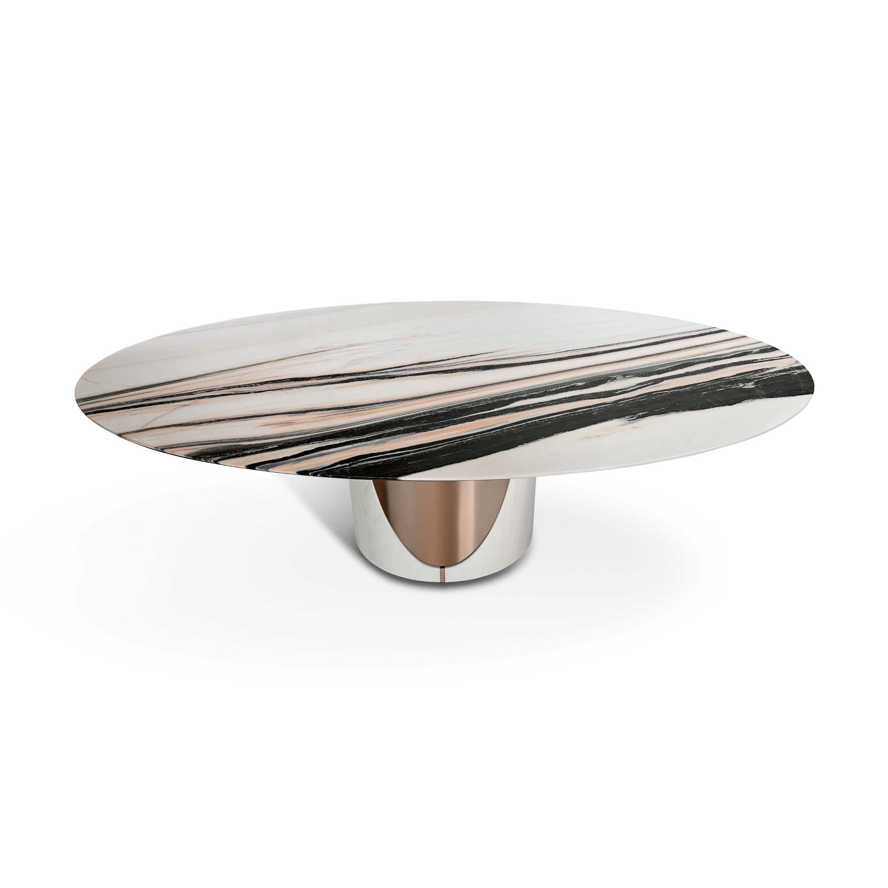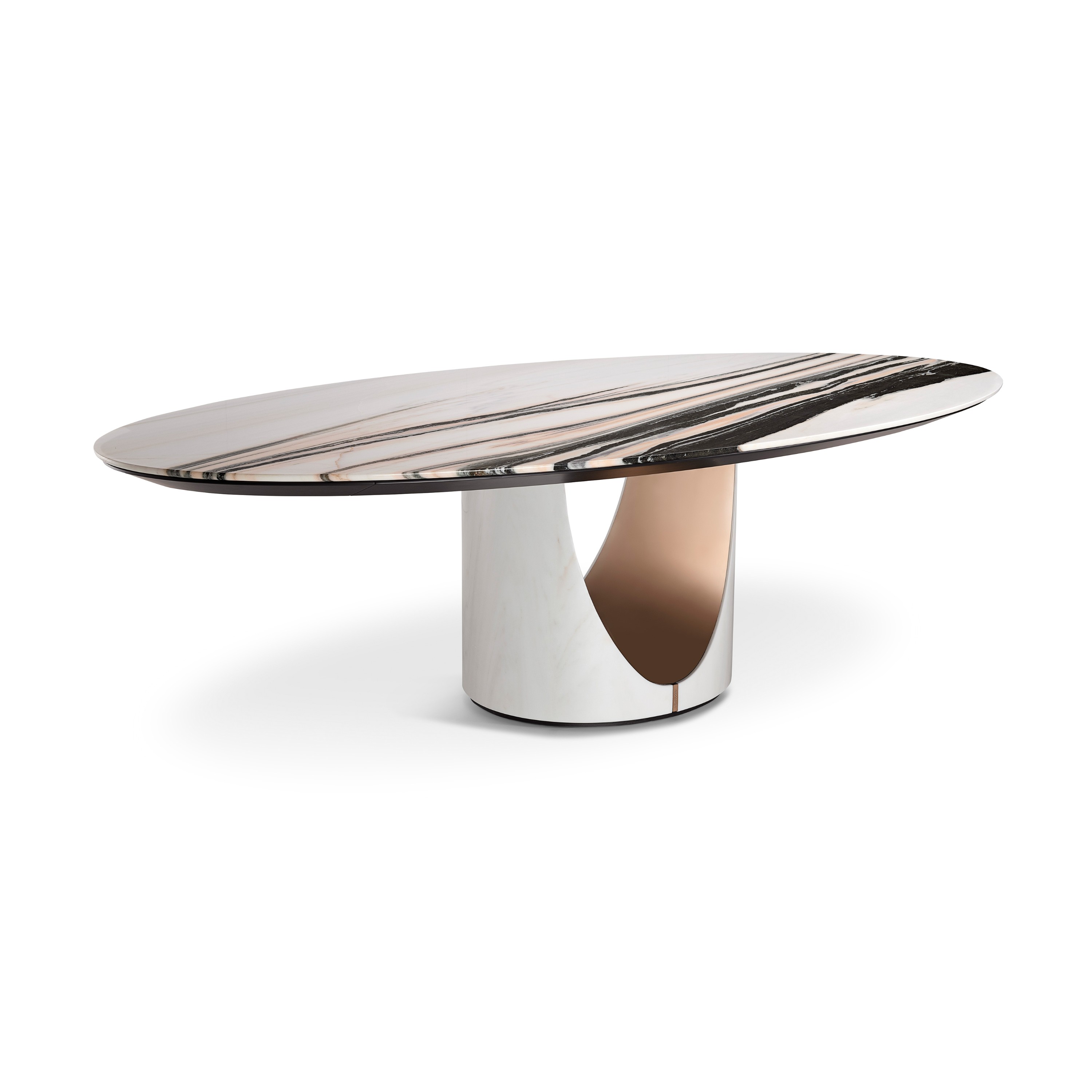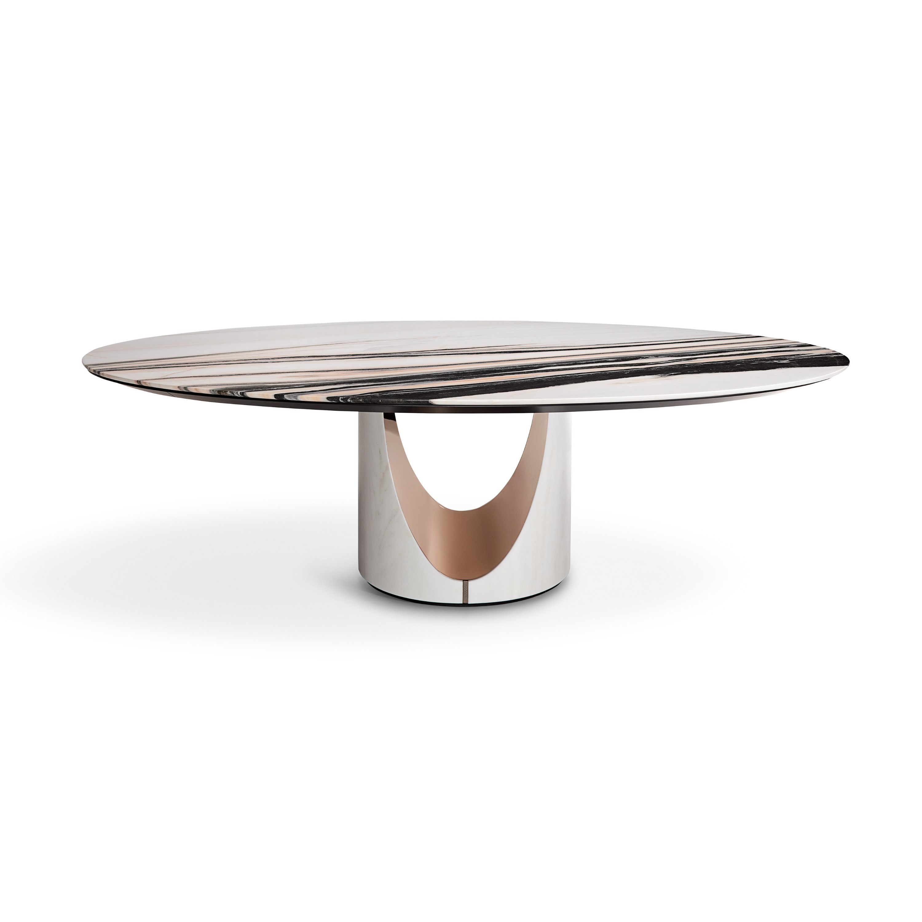 Dining table in marble with round or elliptical top and sculptural base composed of two cylindrical marble elements, carved from a block in a reversed arch shape and hand-polished. The interior of the arch is finished in polished stainless steel, while an aluminum bar with logo separates the two volumes. The top, with a half-round edge, rests on a lacquered wooden under-top. Metal parts are available in selected finishes.