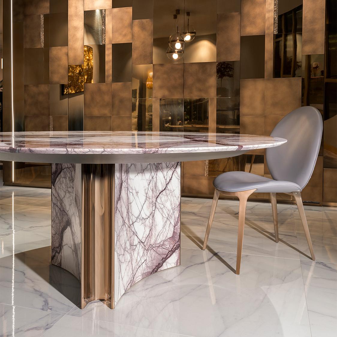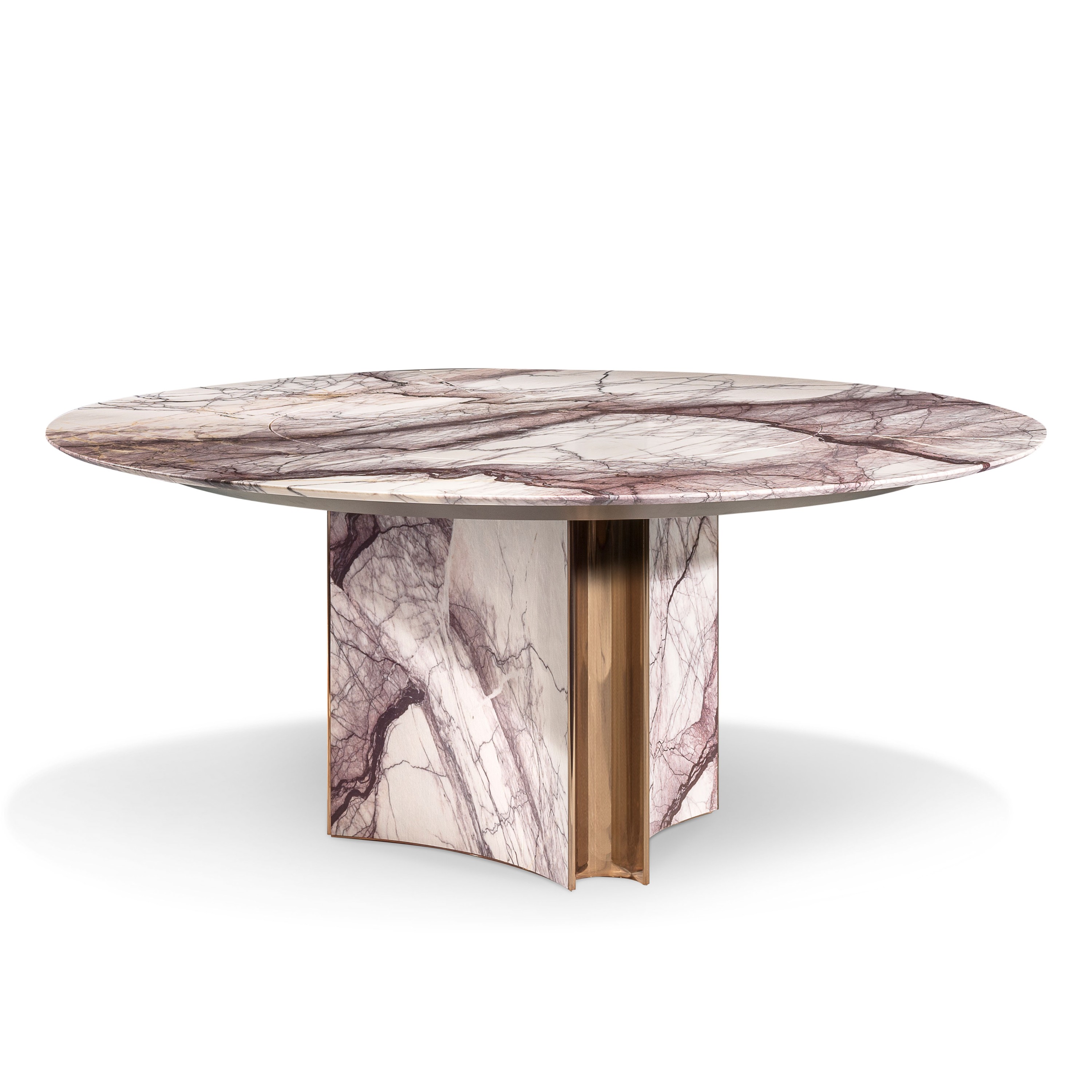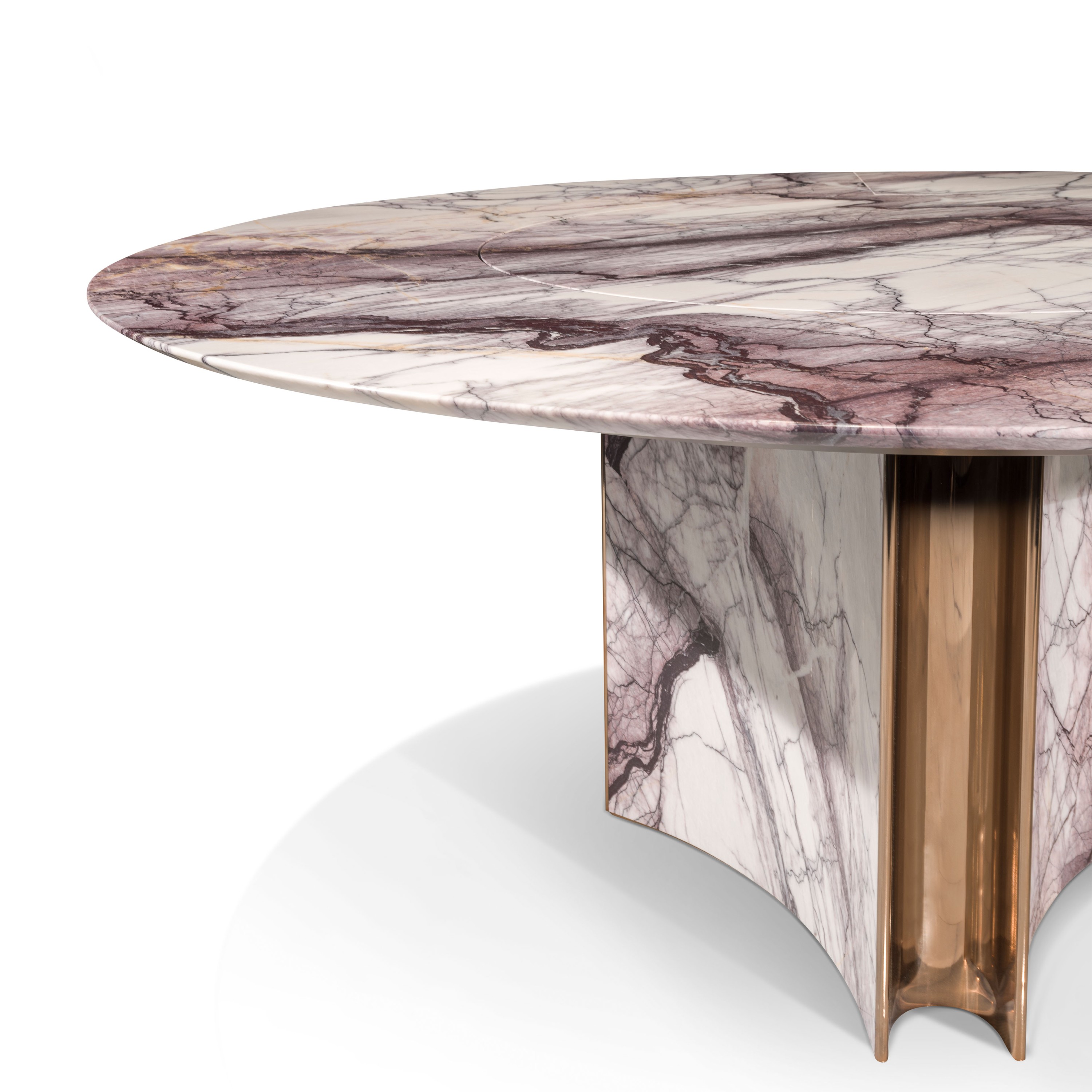 Dining table with round marble top featuring negative bevels, divided into three polished sections with integrated flush Lazy Susan. The under-top is finished in matte lacquered wood. The base is covered with three concave curved marble surfaces framed by curved polished stainless steel decorative profiles. Also available with a three-sided concave steel base and marble top.
