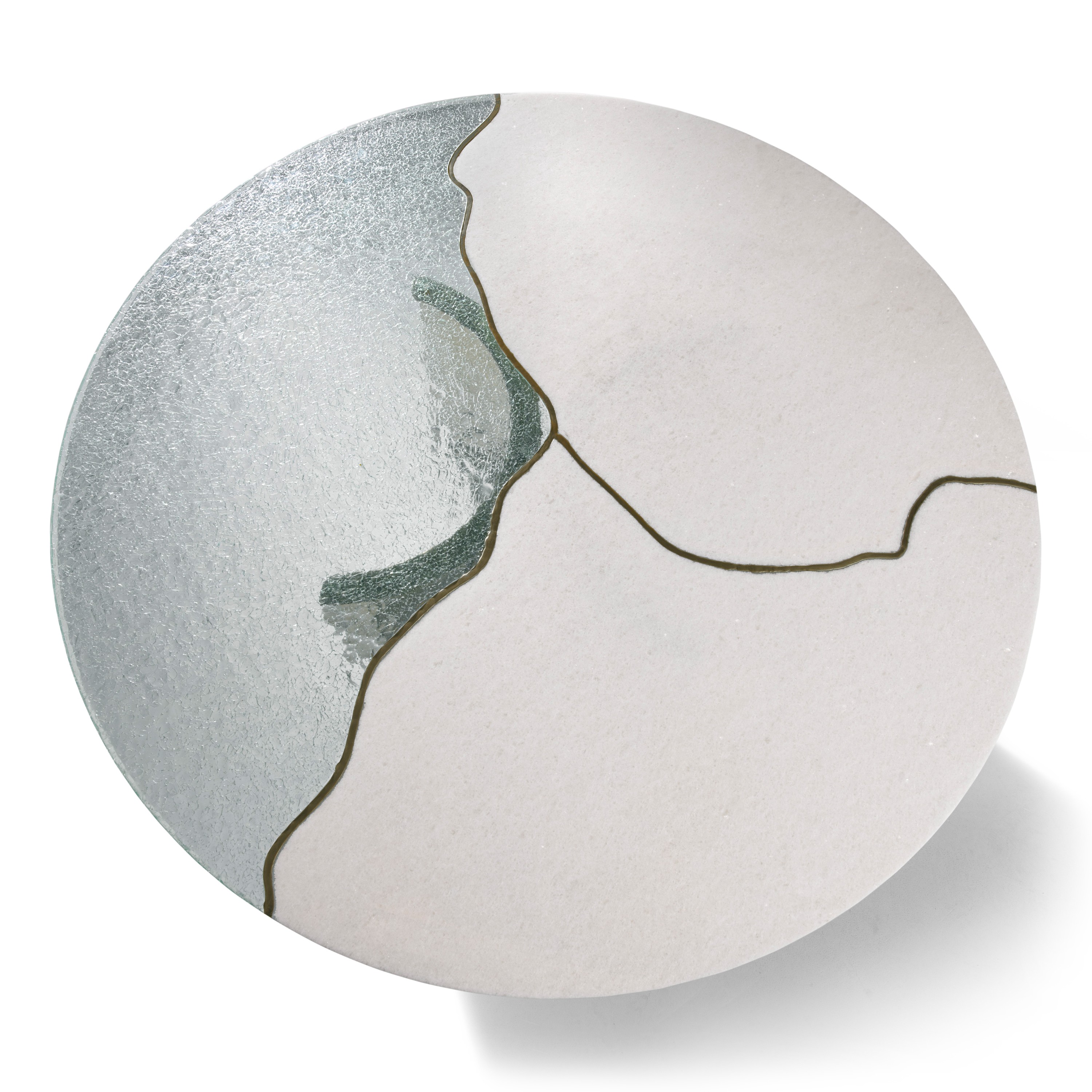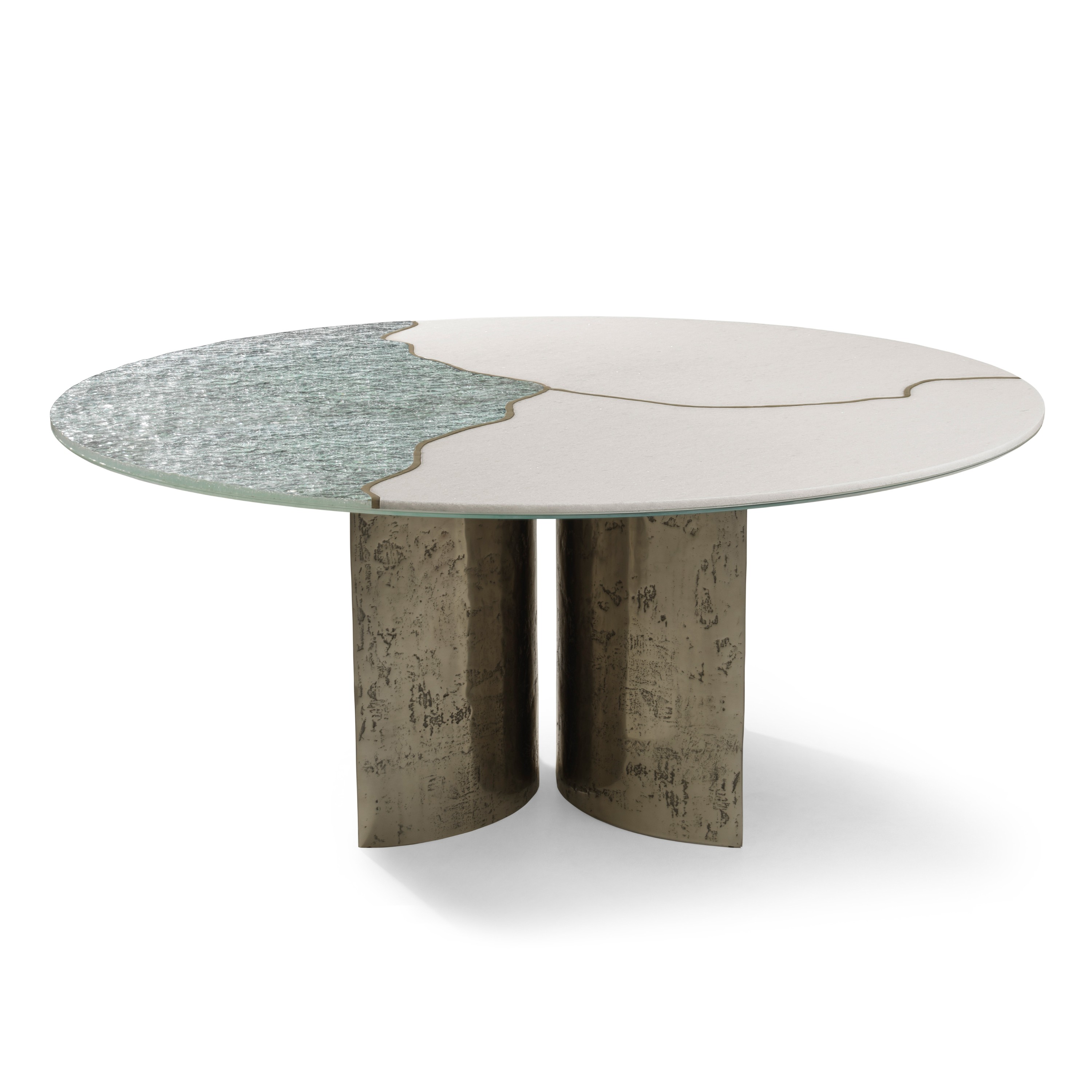 Dining table in artistic glass and marble. Float glass undertop supporting a portion of glass made with the “cotissi” sandwich technique. Marble portion made by cutting and matching with joint finishing using hand-polished brass metallic resin, according to the japanese restoration technique kintsugi. Supporting structure in cast aluminium with hand-made texture, polished and pigmented by hand, fixed to the top by means of UV-welded stainless steel plates. The base finish is available in the metallic finishes selection.