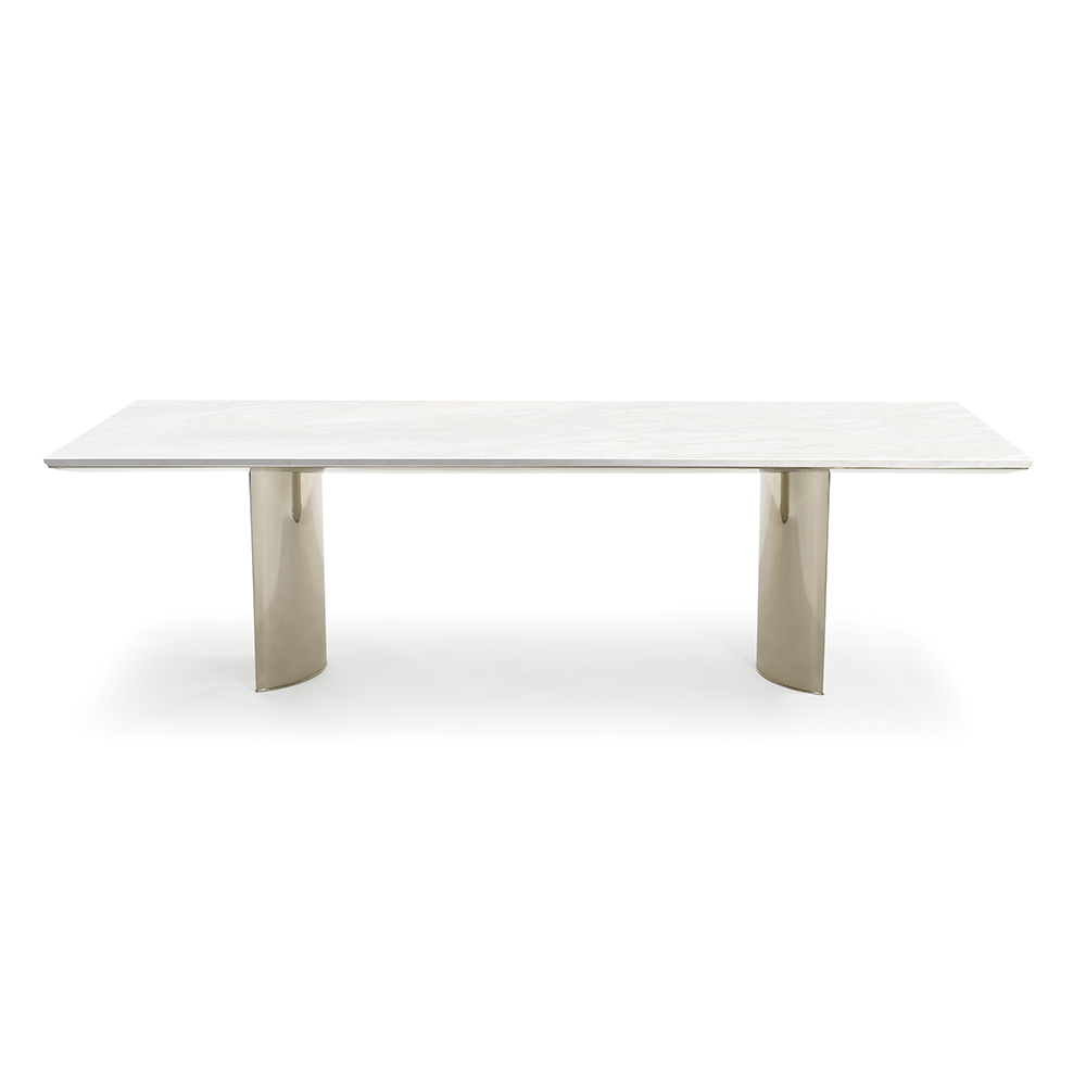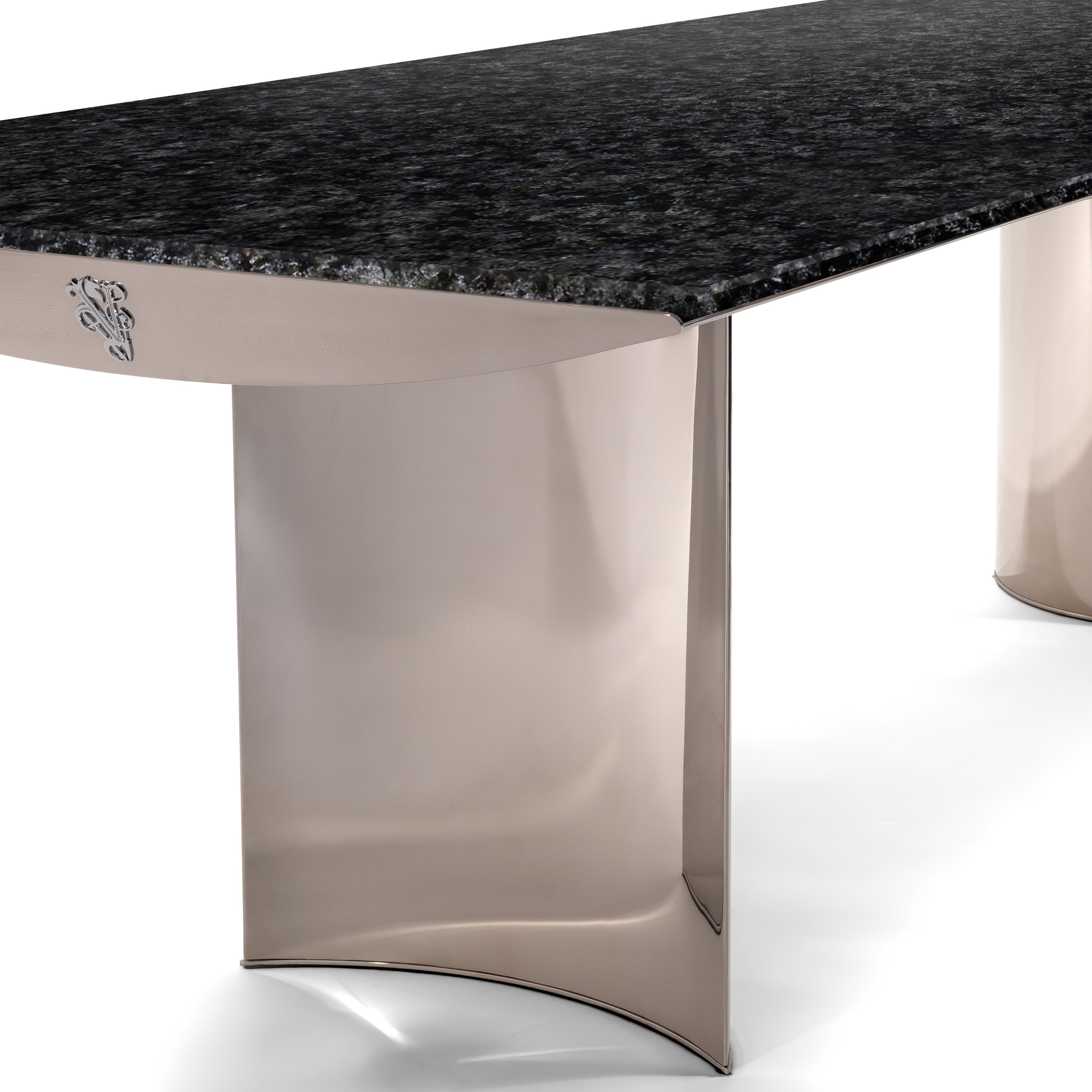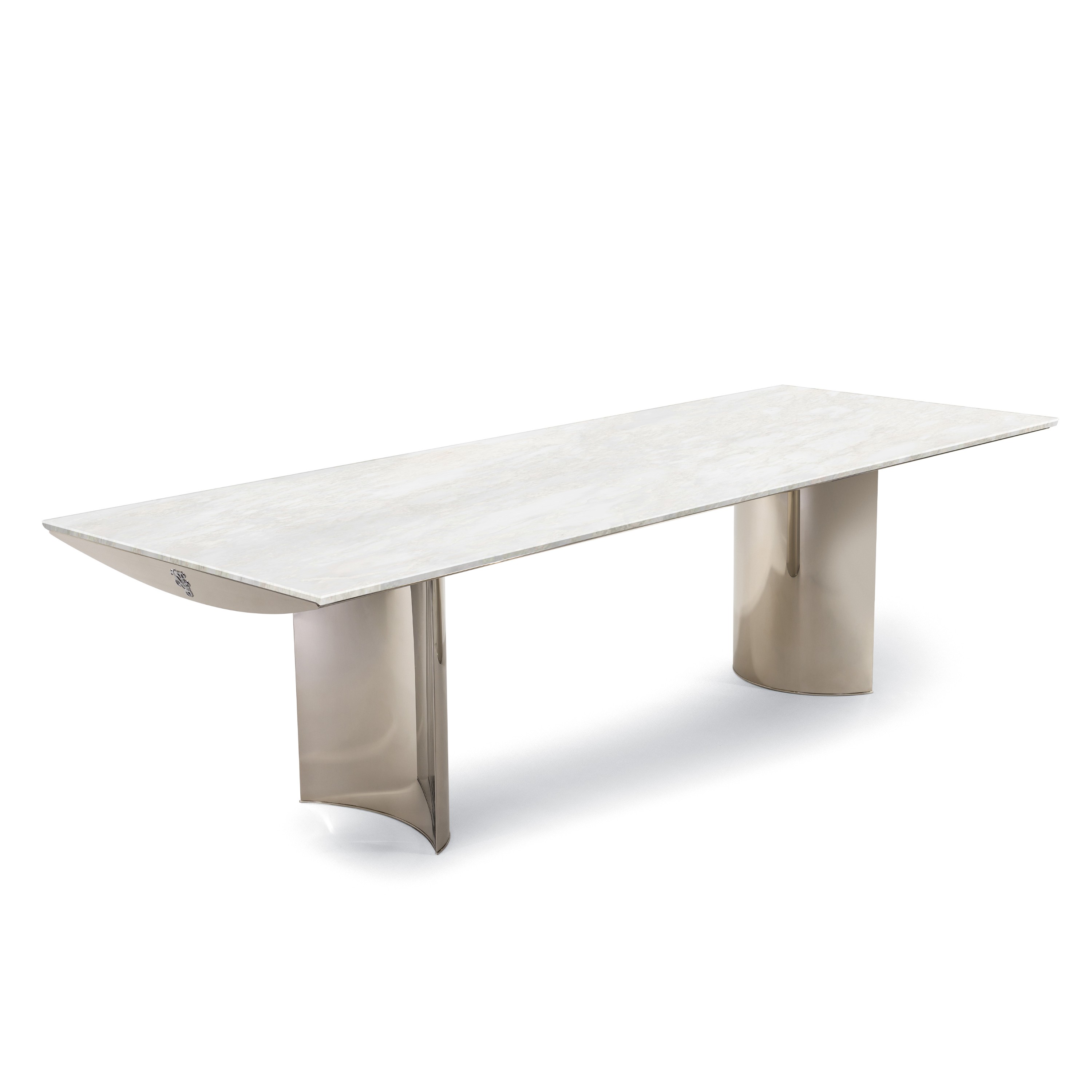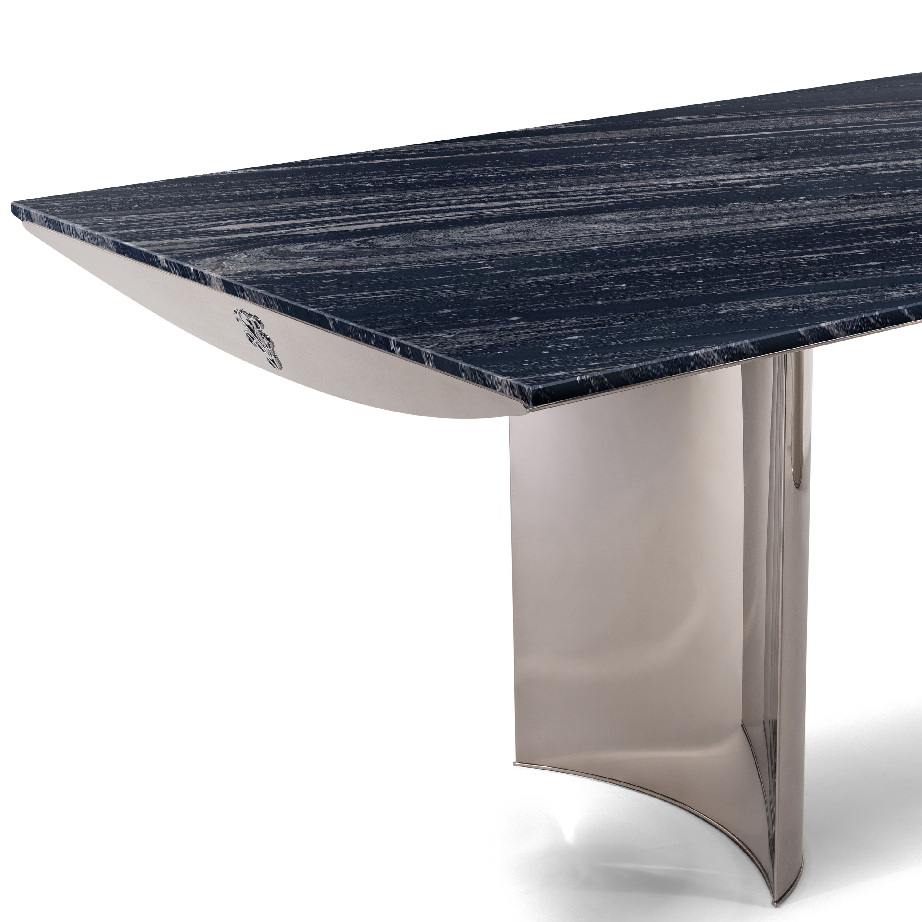 Dining table with marble top featuring negative beveled edges and a lacquered wooden under-top. The polished stainless steel base is curved on three sides, embracing concave outer surfaces of curved marble, sculpted and hand-polished. Also available in other version with high-gloss wood top and legs, and large-size variant with double base and central insert.