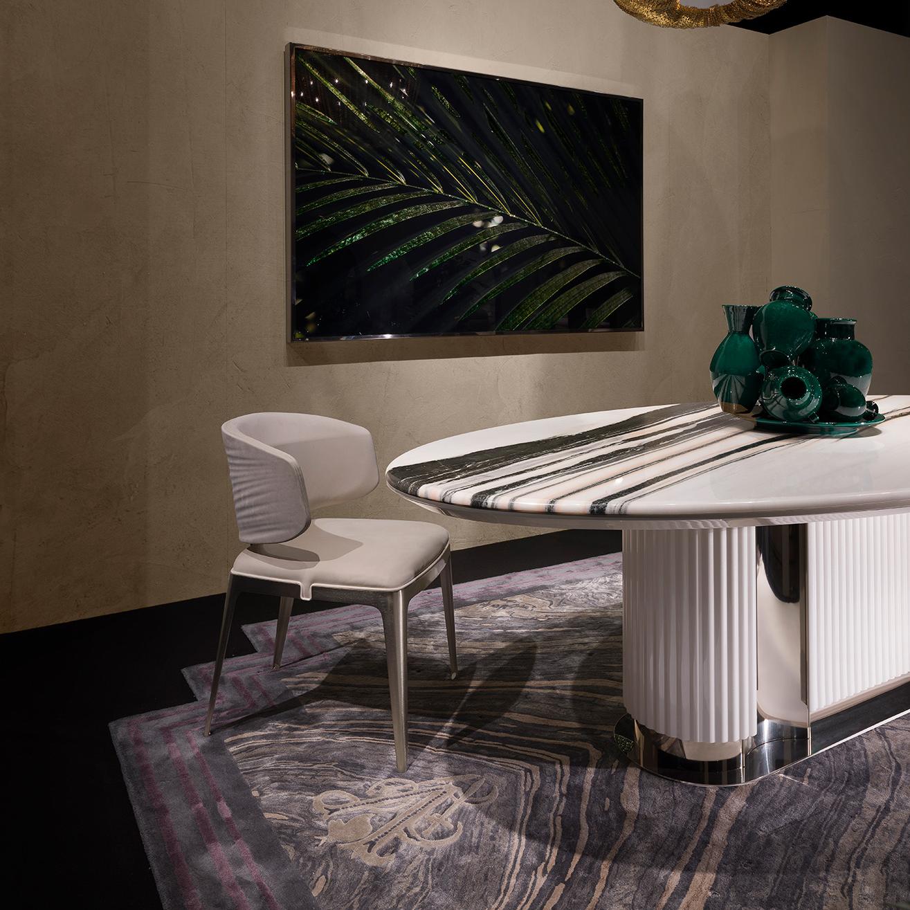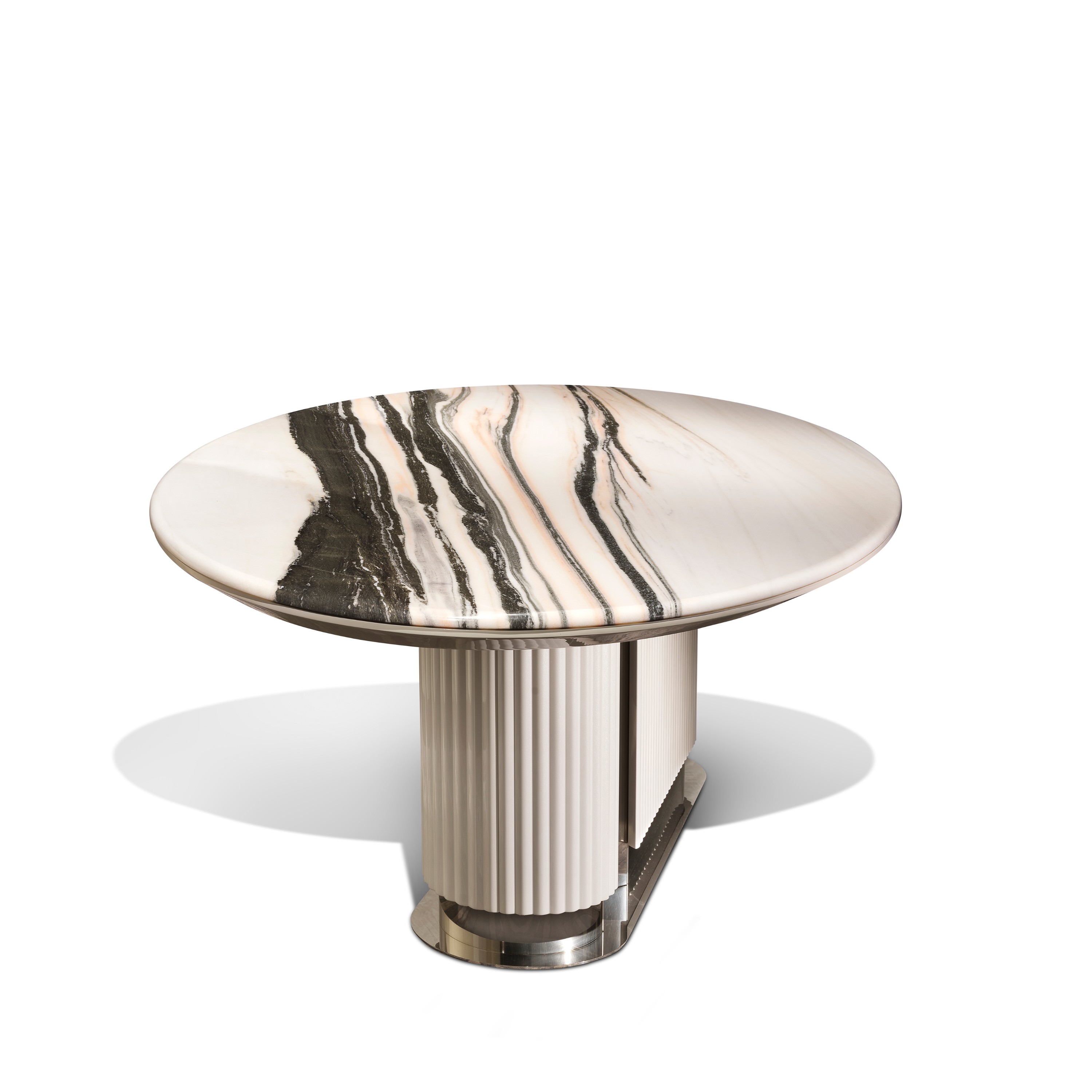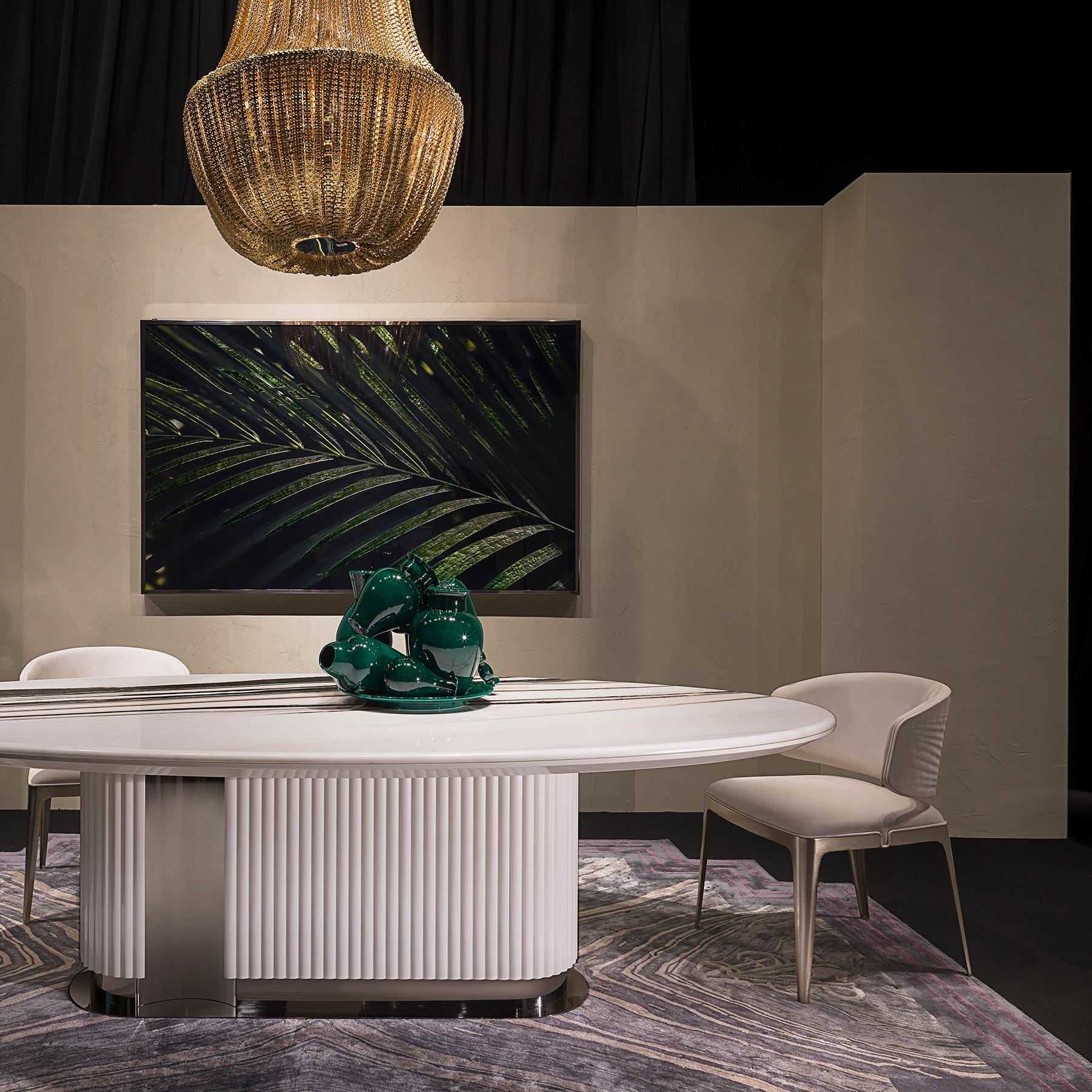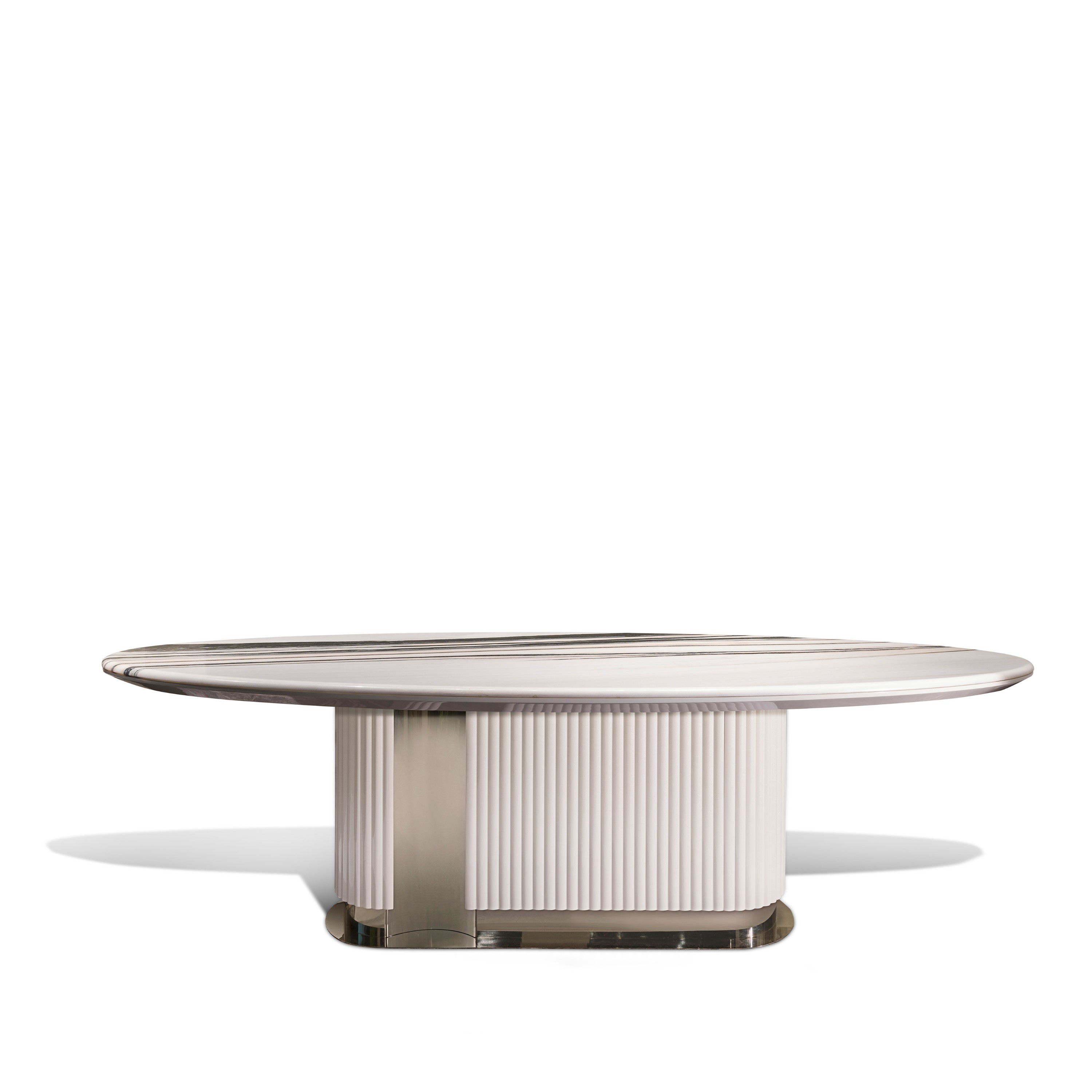 Dining table in marble with oval top, half-round edge, and high-gloss lacquered MDF under-top. The base features vertical panels sculpted with a fluted bas-relief pattern, available lacquered or upholstered in leather. Curved concave and convex polished stainless steel profiles complete the design. Also available in a slim version with a reduced-section central base and stainless steel support plate for lighter, more versatile proportions.