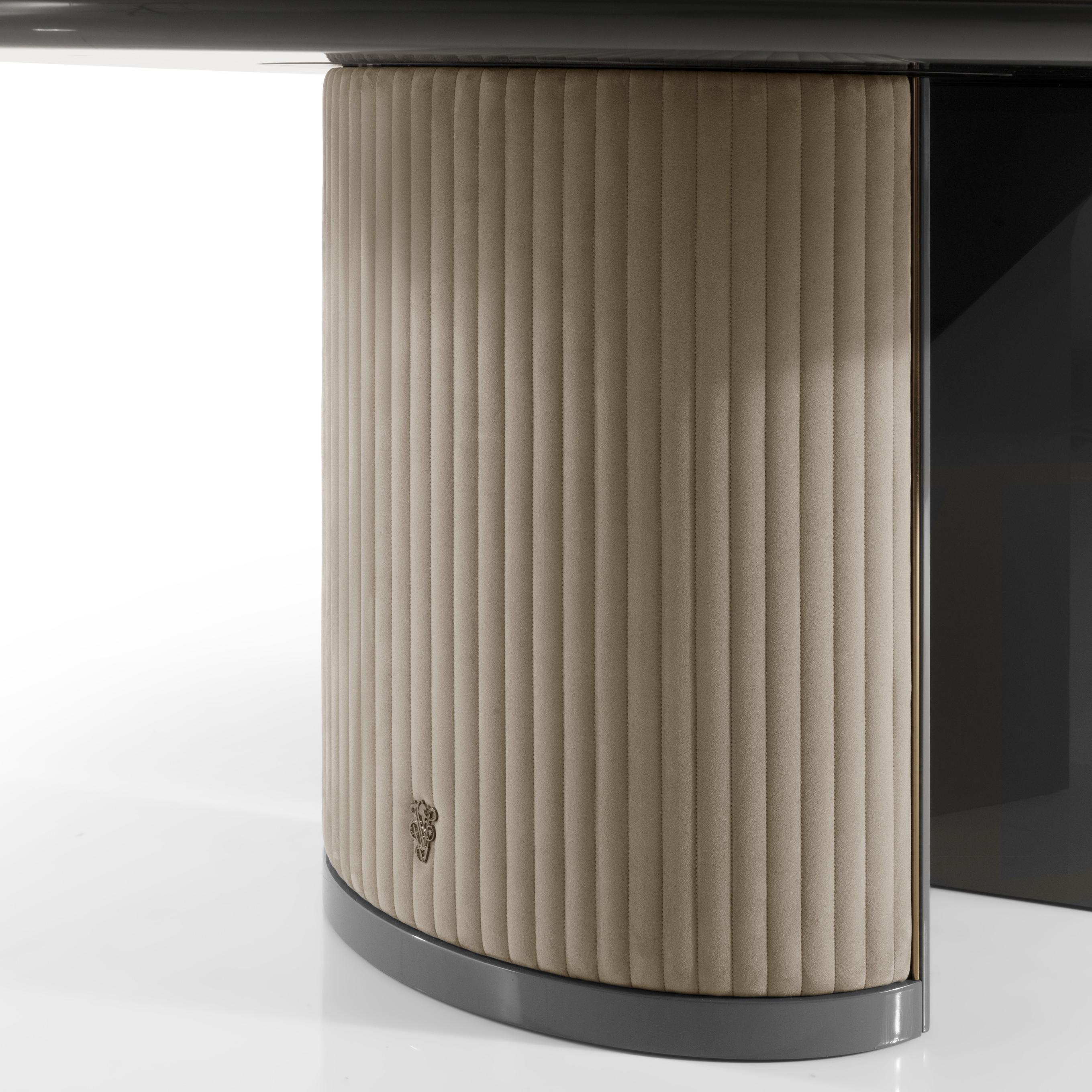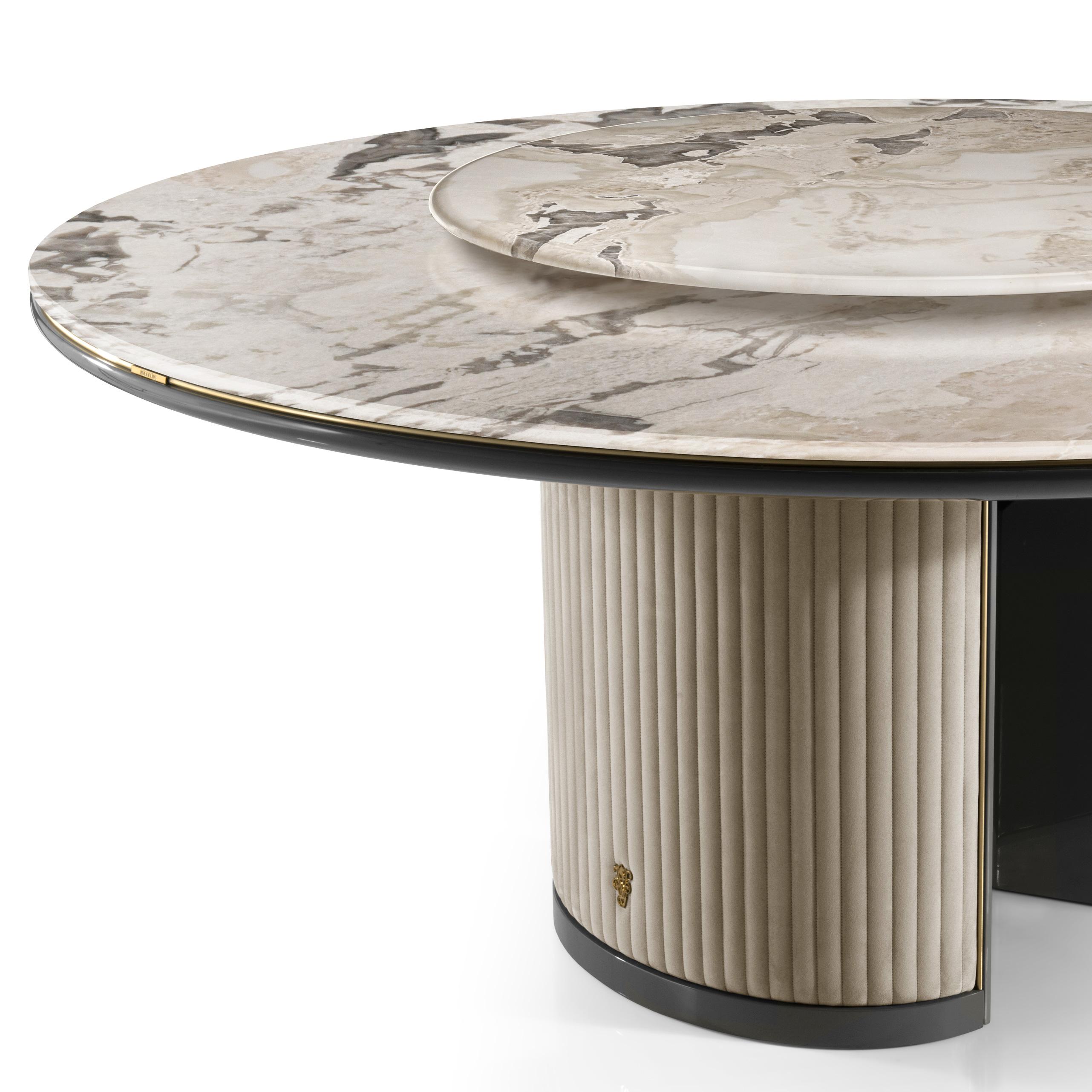 Dining table with polished marble top and shaped edge, lacquered wooden under-top with metal profile and decorative chromed brass buckles featuring an engraved logo. The base consists of two faceted supports upholstered in fluted quilted leather or fabric. Marble Lazy Susan placed on top. Metal parts available in satin finishes.