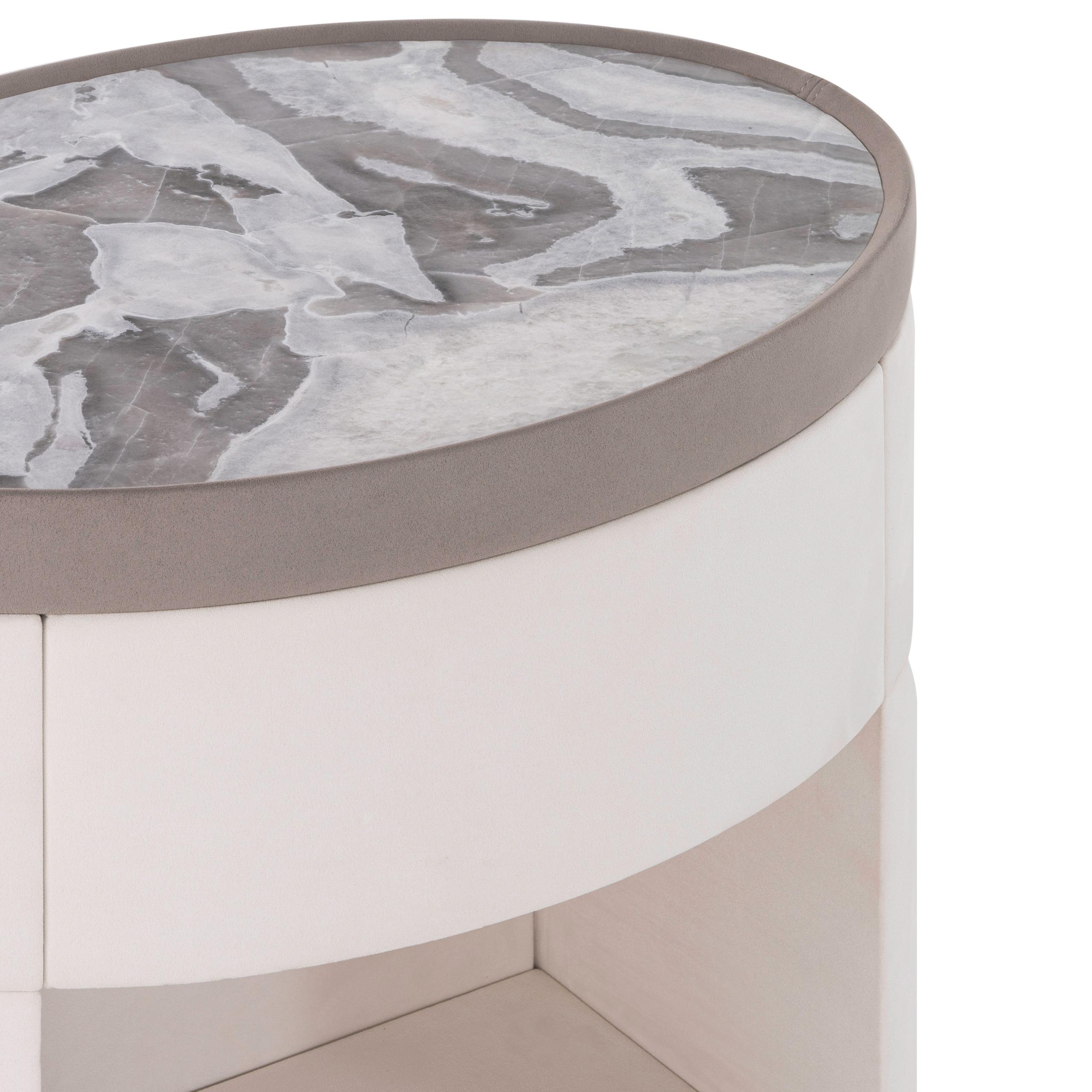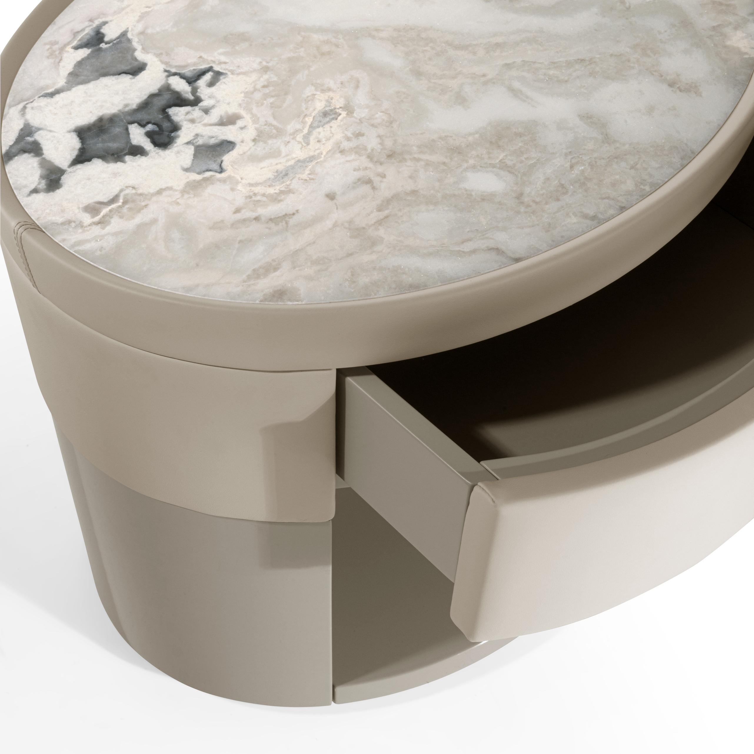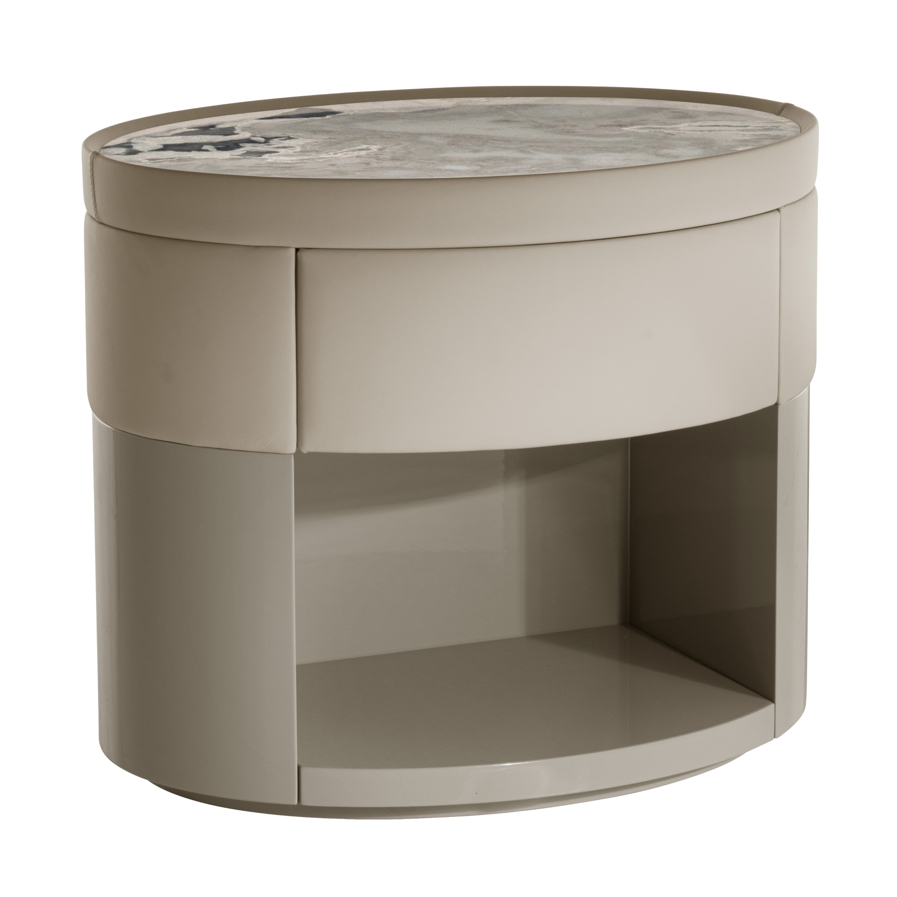 Oval bedside table with a molded MDF shell in glossy lacquer, available in RAL/NCS colors, defined by a soft, continuous profile. The drawer and top edge are upholstered in contrasting leather or fabric, while the recessed polished marble top adds a refined material accent. The drawer features soft-close runners for smooth and silent operation.