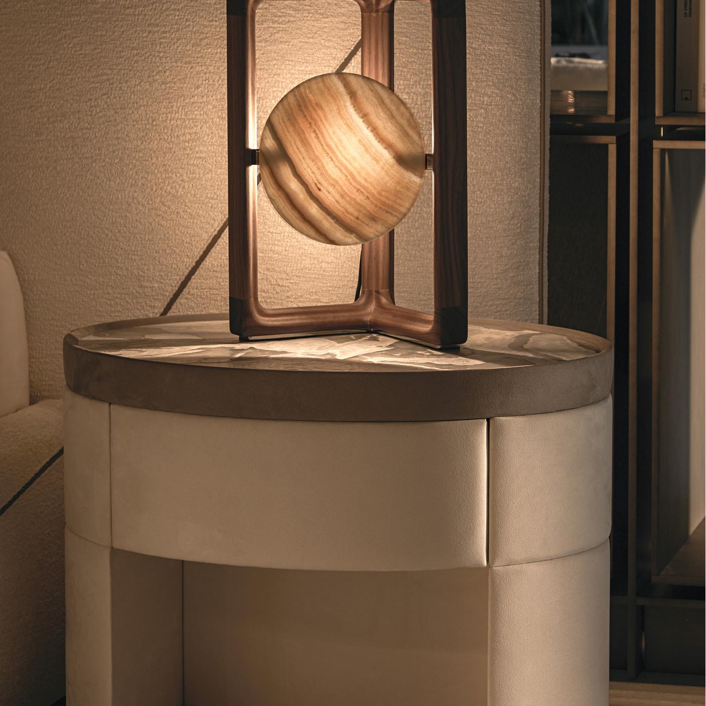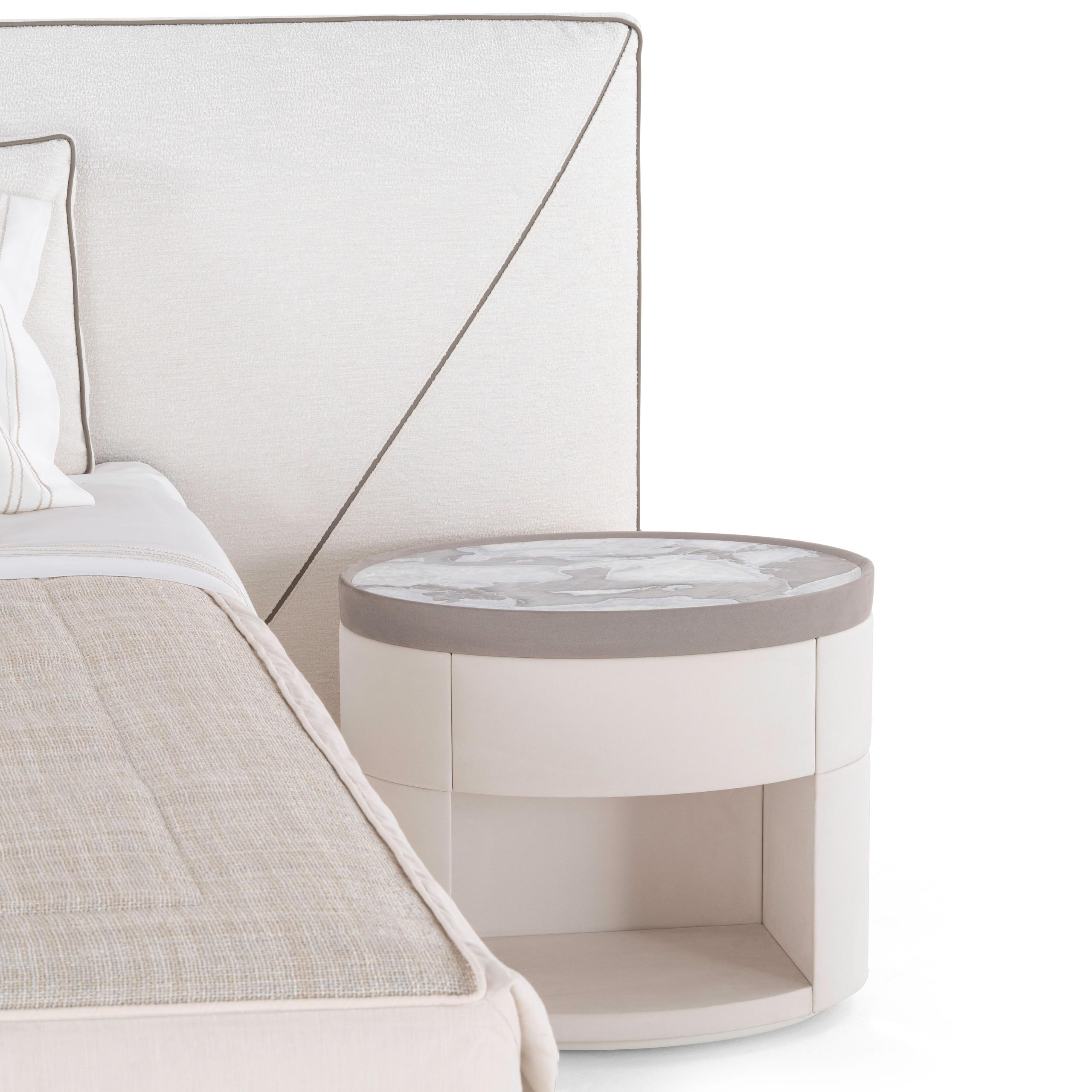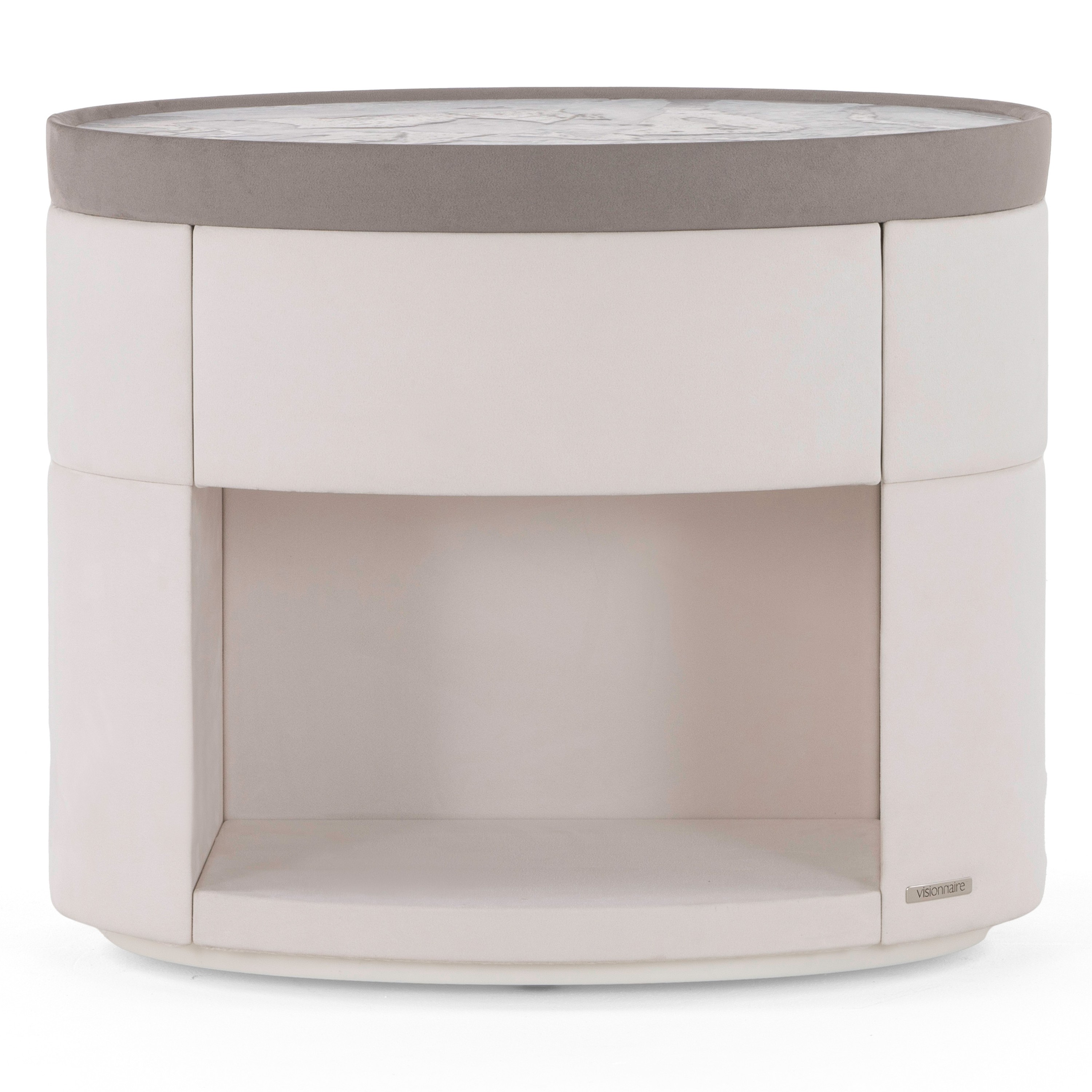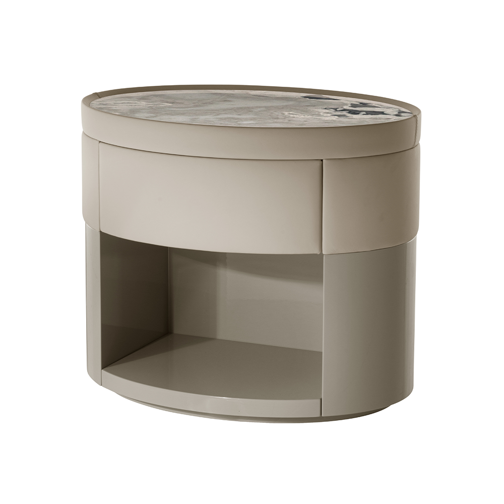 Oval bedside table with a molded MDF shell in glossy lacquer, available in RAL/NCS colors, defined by a soft, continuous profile. The drawer and top edge are upholstered in contrasting leather or fabric, while the recessed polished marble top adds a refined material accent. The drawer features soft-close runners for smooth and silent operation.