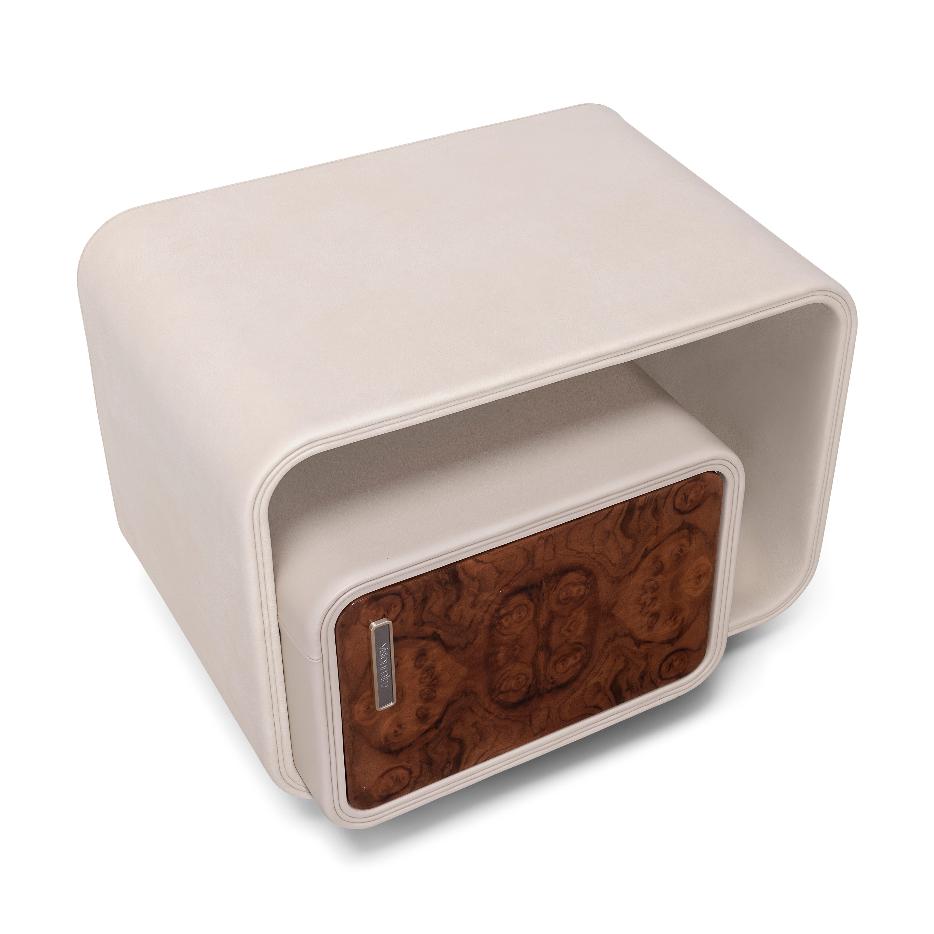 Double-box bedside table upholstered in leather or fabric. External structure in lightly padded wood composed of an open compartment and a drawer entirely covered with a mirrored back and LED courtesy light. Internal structure with front in wood covered in briar wood with a 100-glossy finish. The push-pull drawer has an aluminum and steel button and is available in a selection of metallic finishes.
