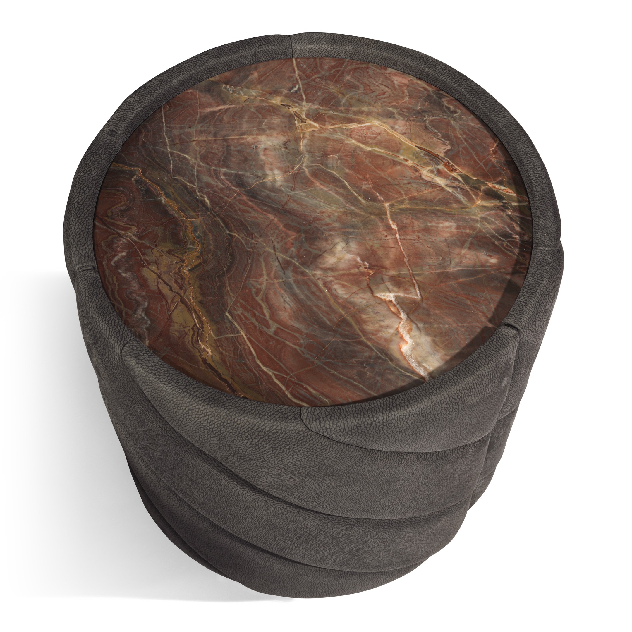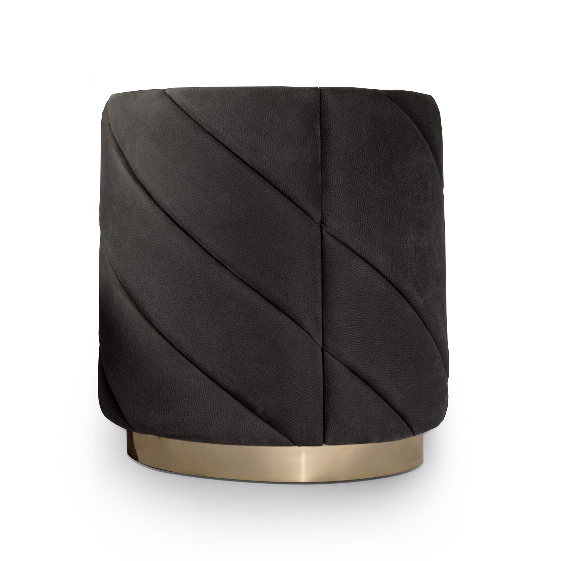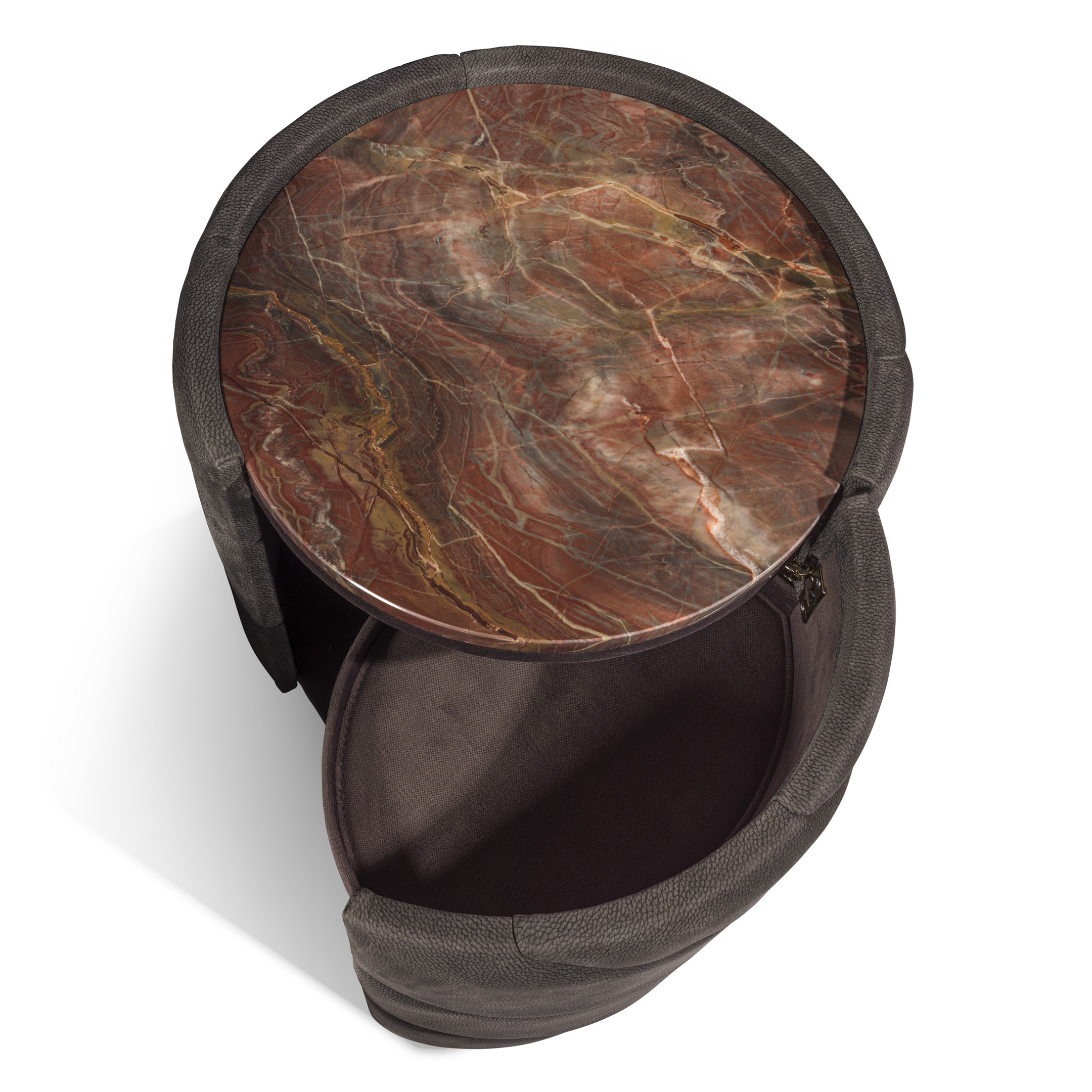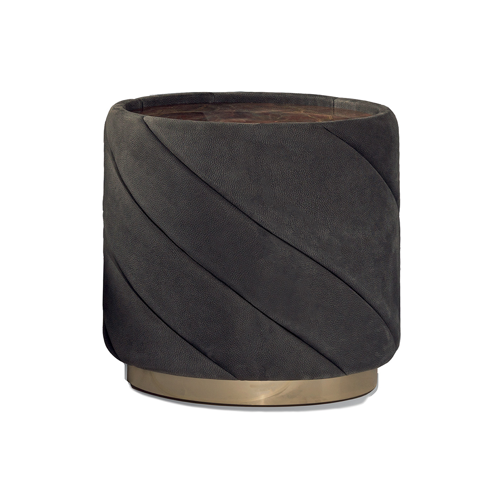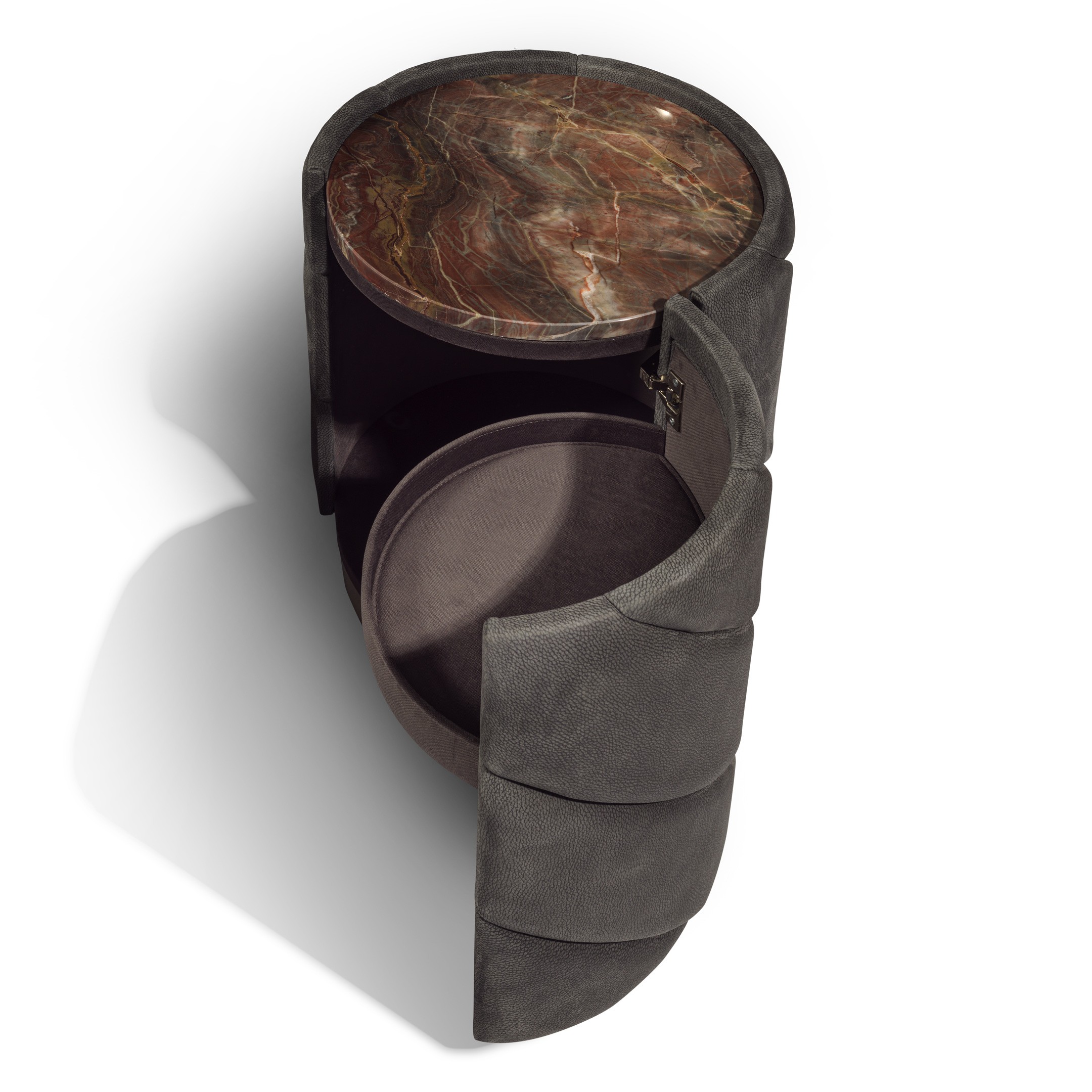 Round bedside table with door, fully upholstered in leather or fabric with diagonally banded panels, each individually padded and detailed. A marble top and polished steel base complete the piece. The interior, lined in tone-on-tone microfiber, includes a spacious compartment and a convenient shelf integrated into the door. Metal elements are available in the collection’s selected finishes.