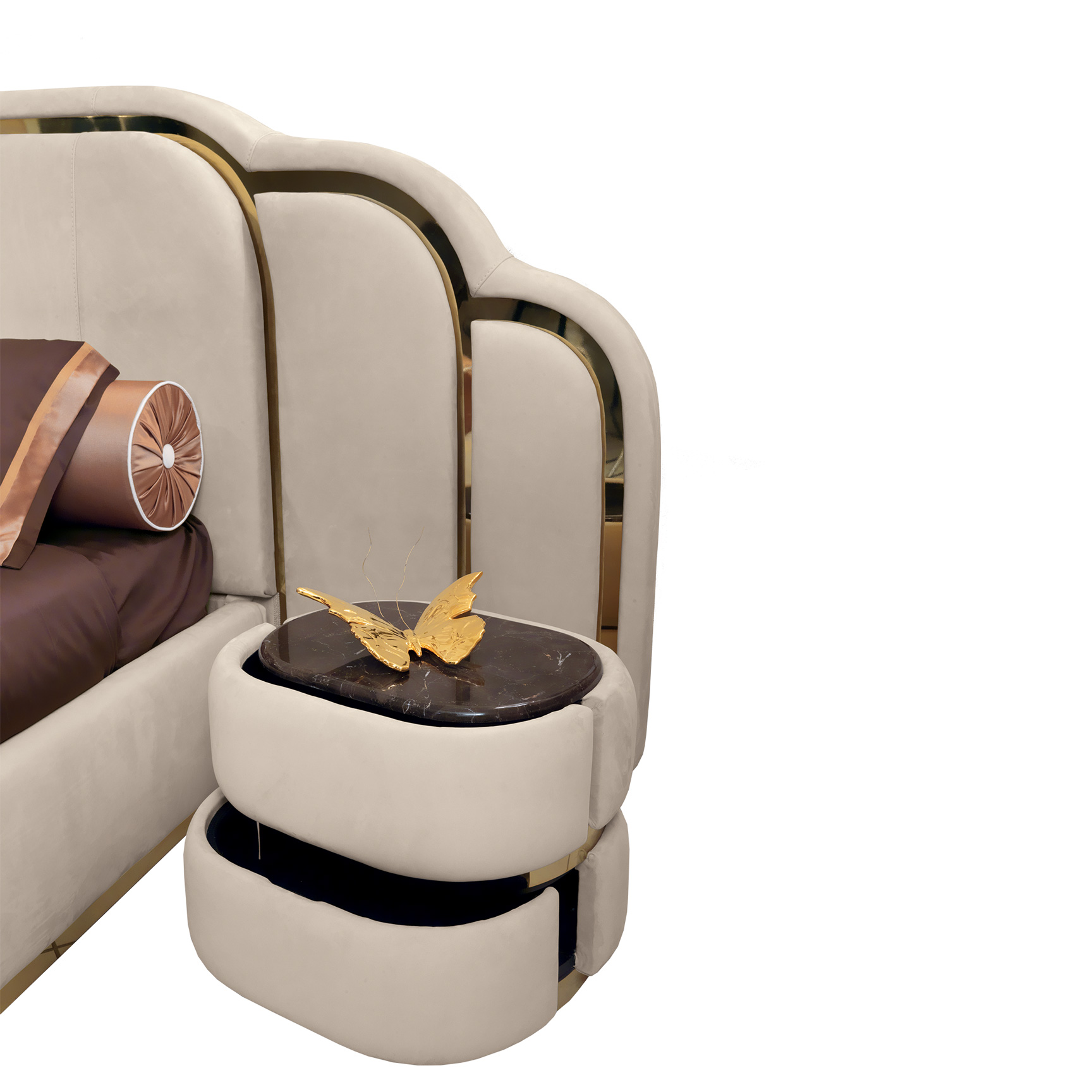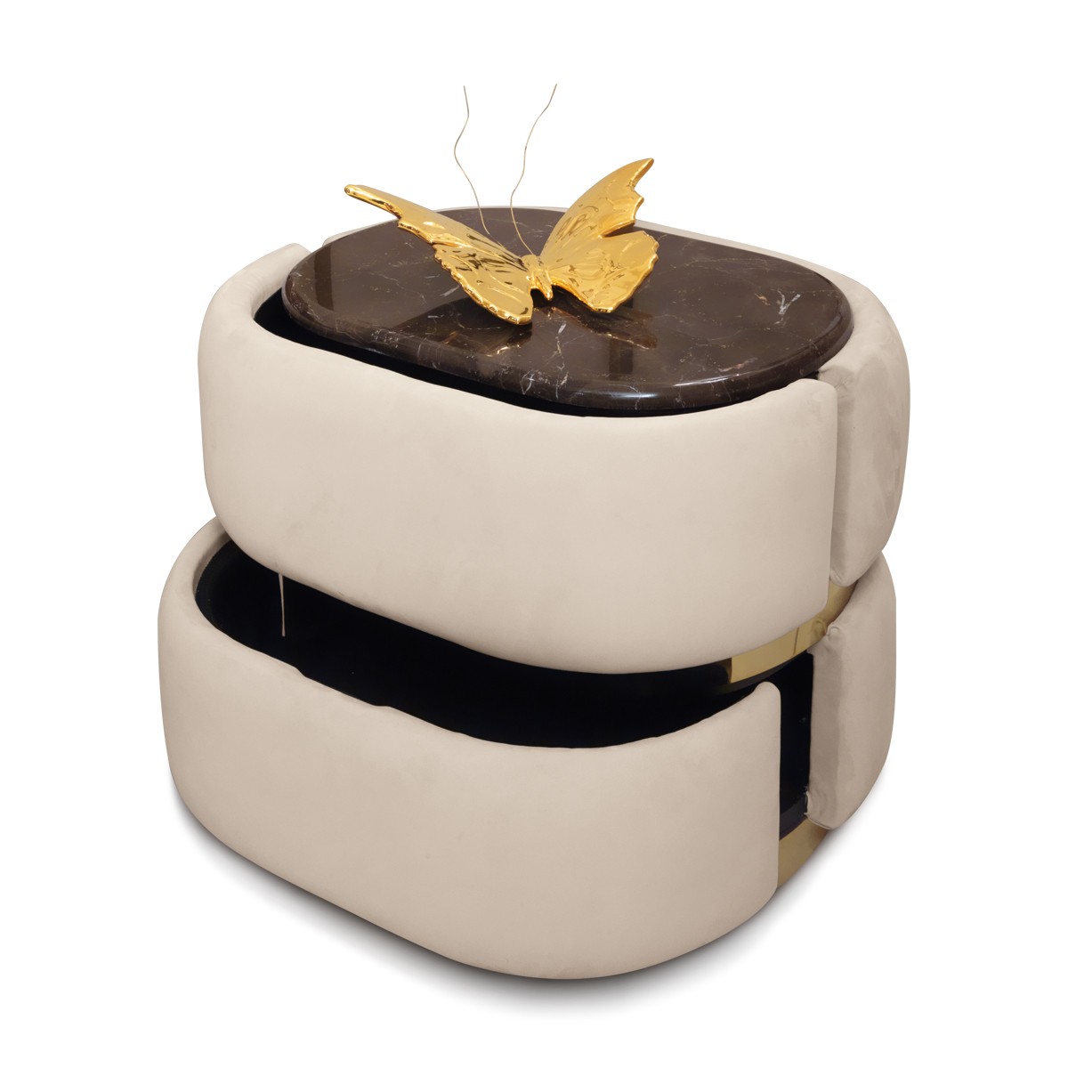 Two-drawer bedside table upholstered in leather or fabric, with a softly padded curved multilayer wood structure that enhances its visual softness. The marble top is elegantly set within a polished stainless steel perimeter band, echoed in the plinth. The interior is finished in matte lacquer, offering contrast to the available metallic finishes from the collection.