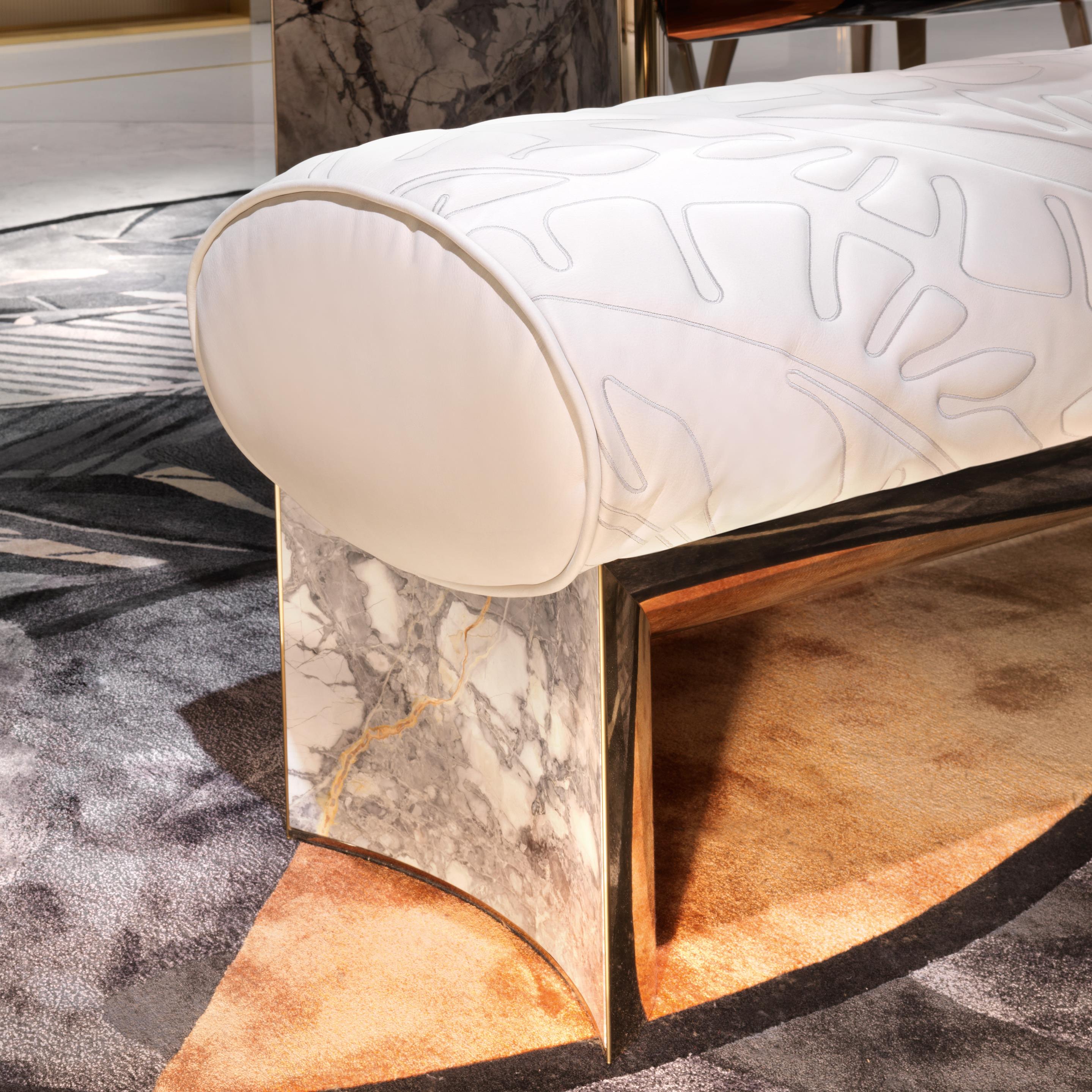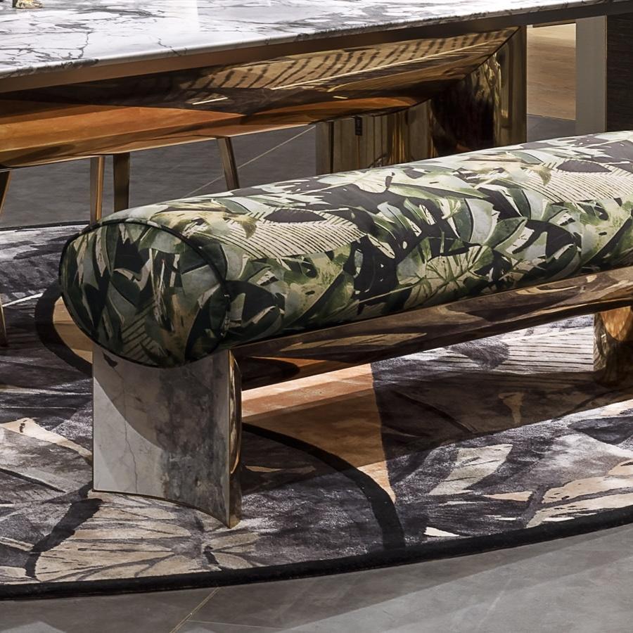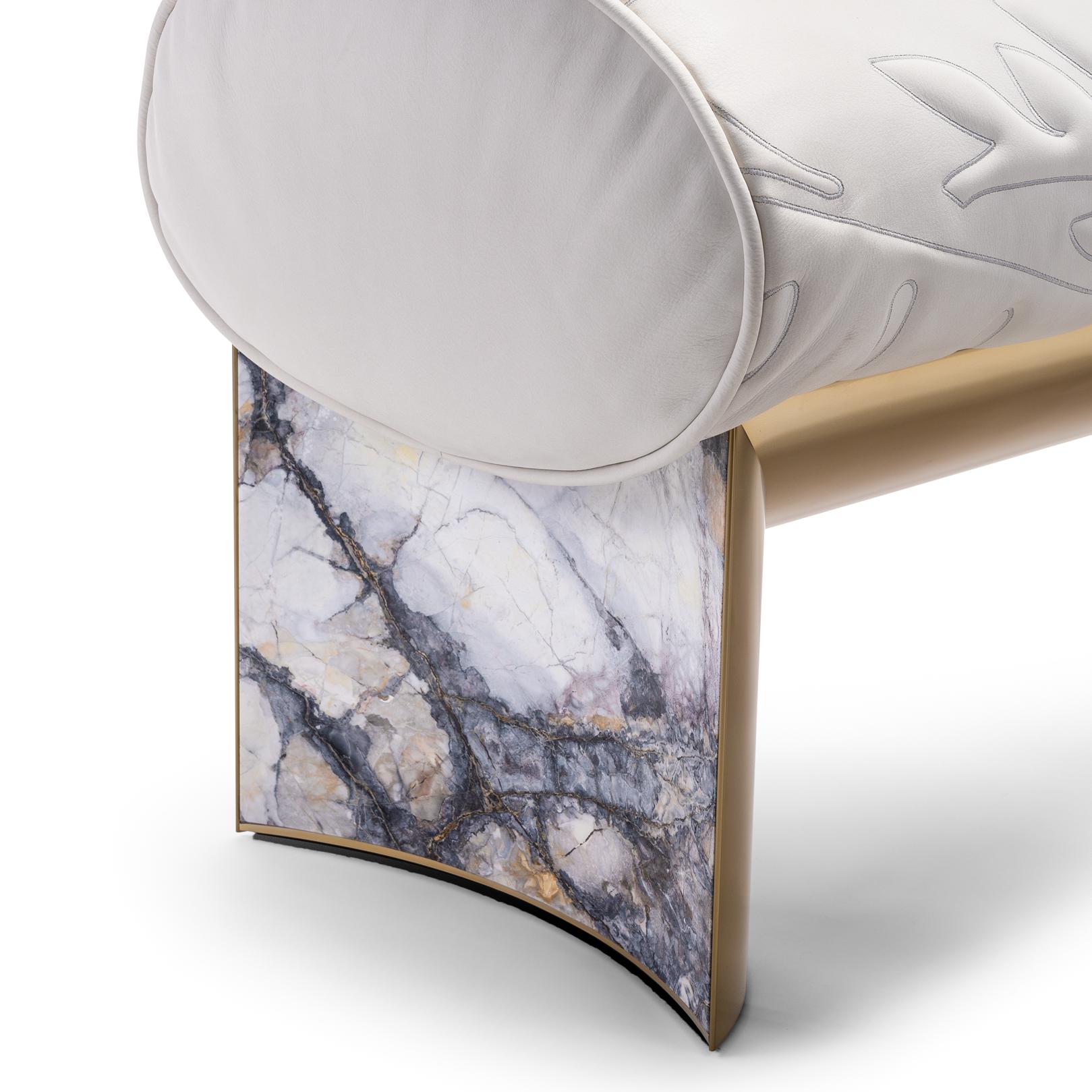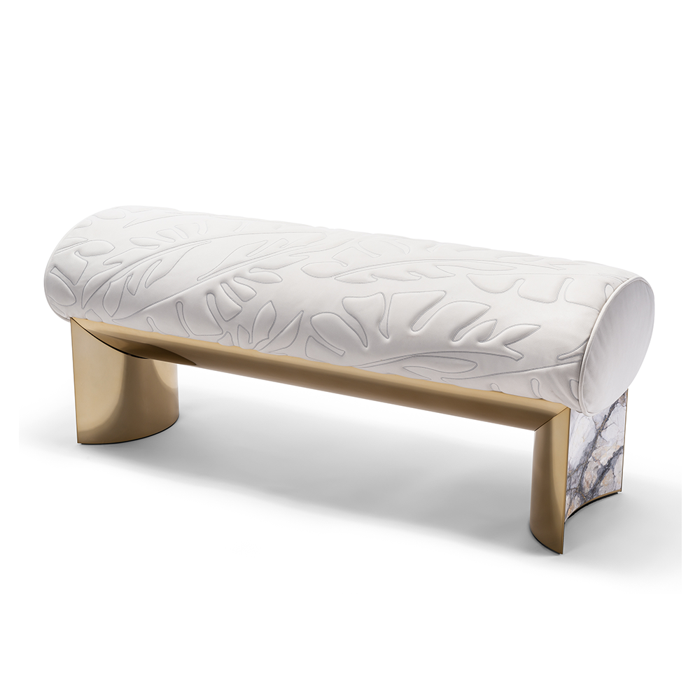 Upholstered bench with a linear seat in leather or fabric, also available in a “quilted” version with lightly padded foliage embroidery. The base is clad in curved polished stainless steel, while the side elements, in sculpted solid marble, feature a concave form. The steel parts are available in the curated selection of metal finishes.