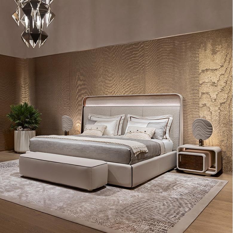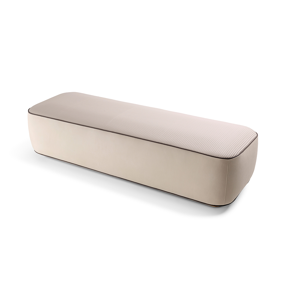 Upholstered bench with a solid and multilayer wood structure, featuring a generous seat covered in fabric or leather. The canneté pattern enhances its graphic appeal while offering both comfort and distinctive character. The MDF base is clad in satin-finished metal, available in a curated selection of metallic finishes, adding a bold material presence.