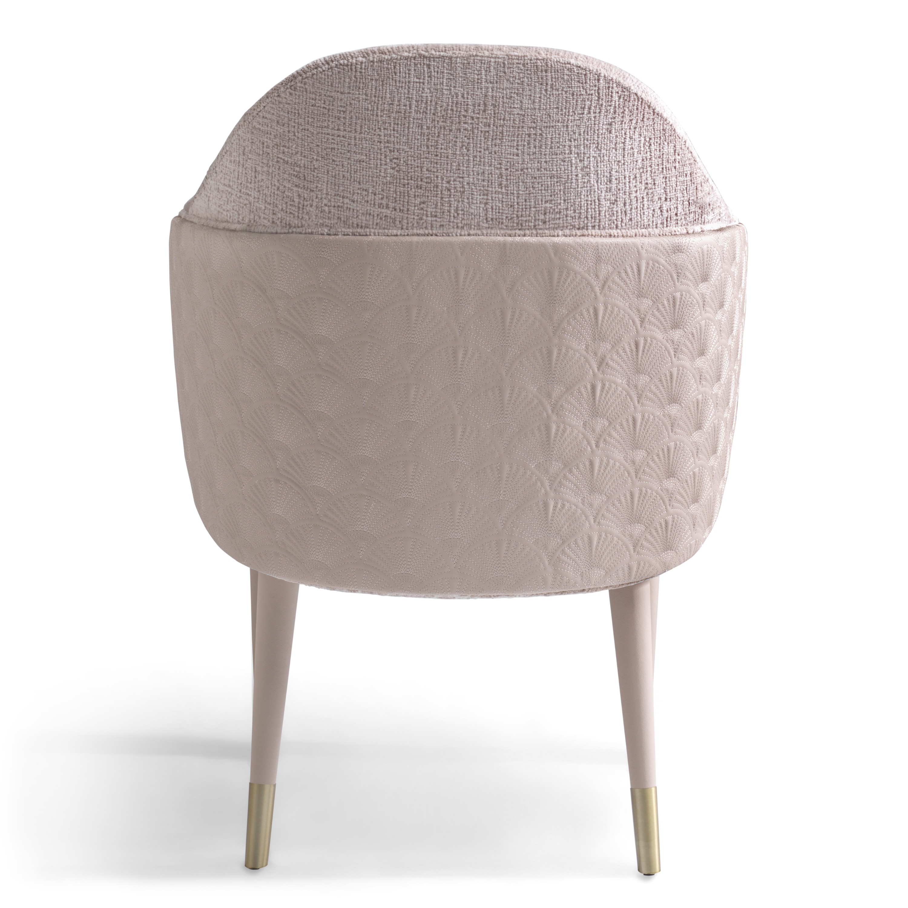 Upholstered chair with a curved and solid wood frame, crafted for enveloping comfort and refined presence.The seat and backrest are upholstered in leather or fabric, featuring quilted stitching and leather piping that accentuates the silhouette. The outer shell can be enhanced with an all-over embroidered pattern, while the leather-clad legs are finished with metal caps available in a curated selection of metallic finishes.
