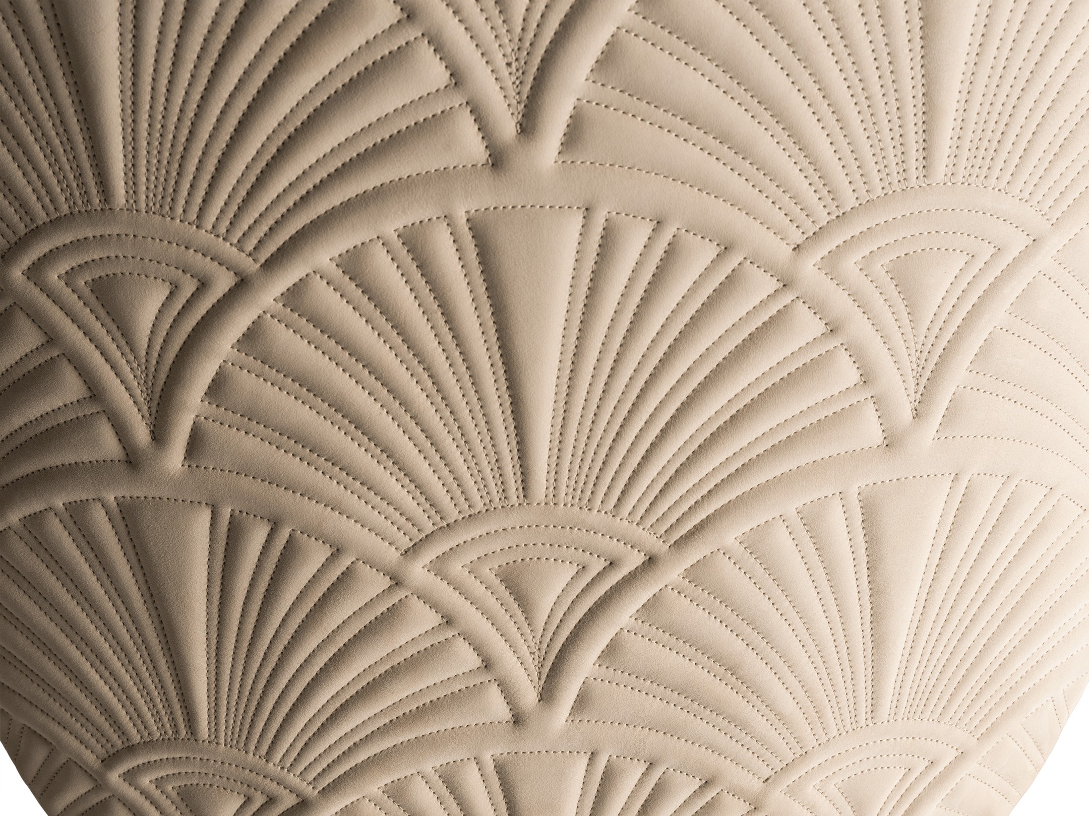 Upholstered dining chair with a curved wooden shell, covered in leather or fabric, designed to strike a balance between comfort and visual lightness. The satin-cast aluminum legs, precisely shaped, are available in a range of metallic lacquer finishes. The backrest, also offered in a quilted version with exclusive selectable patterns, introduces a decorative detail with refined tactile expression.