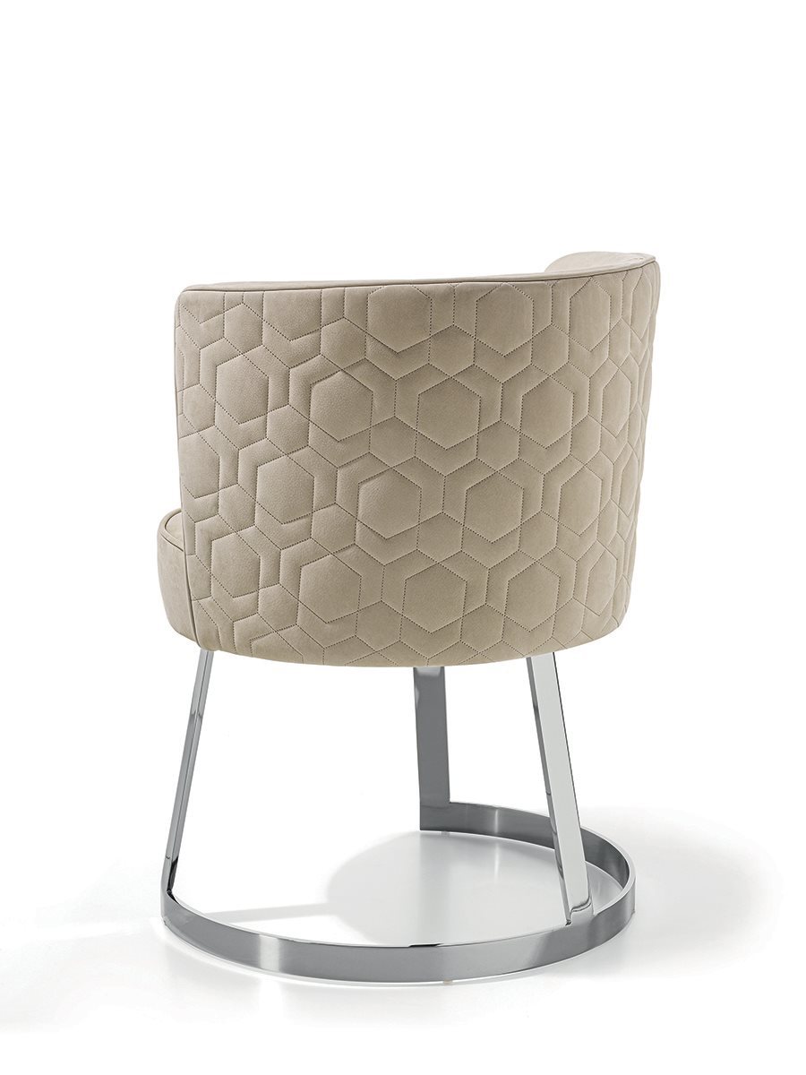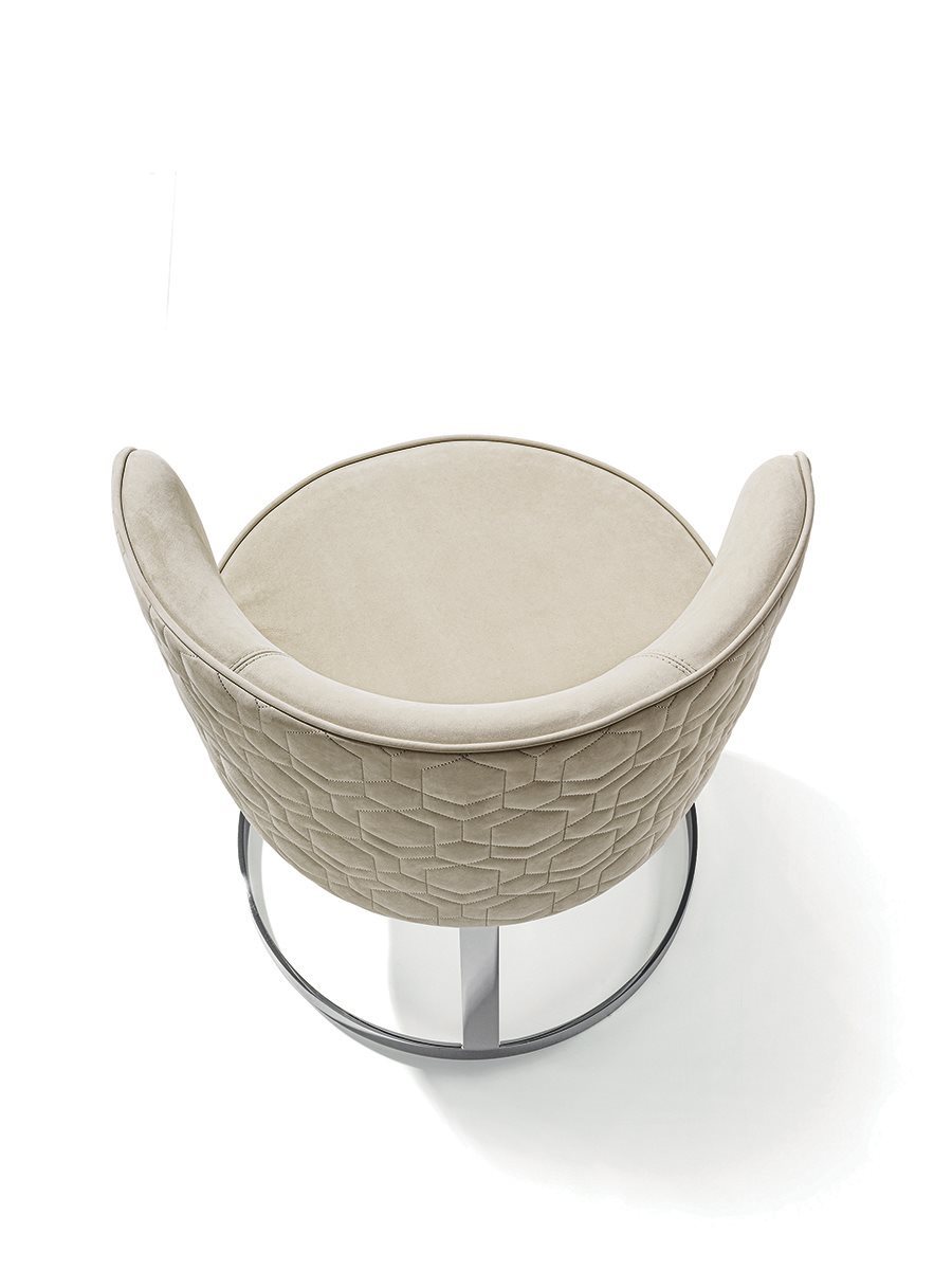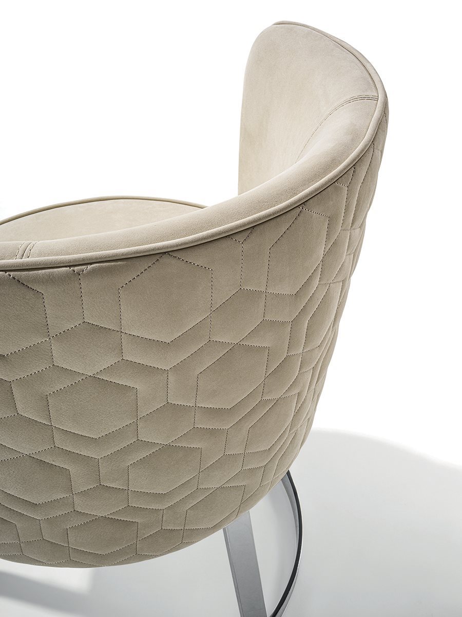 Upholstered chair with a polished stainless steel frame, designed to combine visual lightness with structural solidity. The curved plywood shell defines the ergonomic profile of the seat and backrest, complemented by differentiated-density polyurethane padding. The upholstery is available in leather or fabric, while the metal components come in a carefully selected range of finishes.