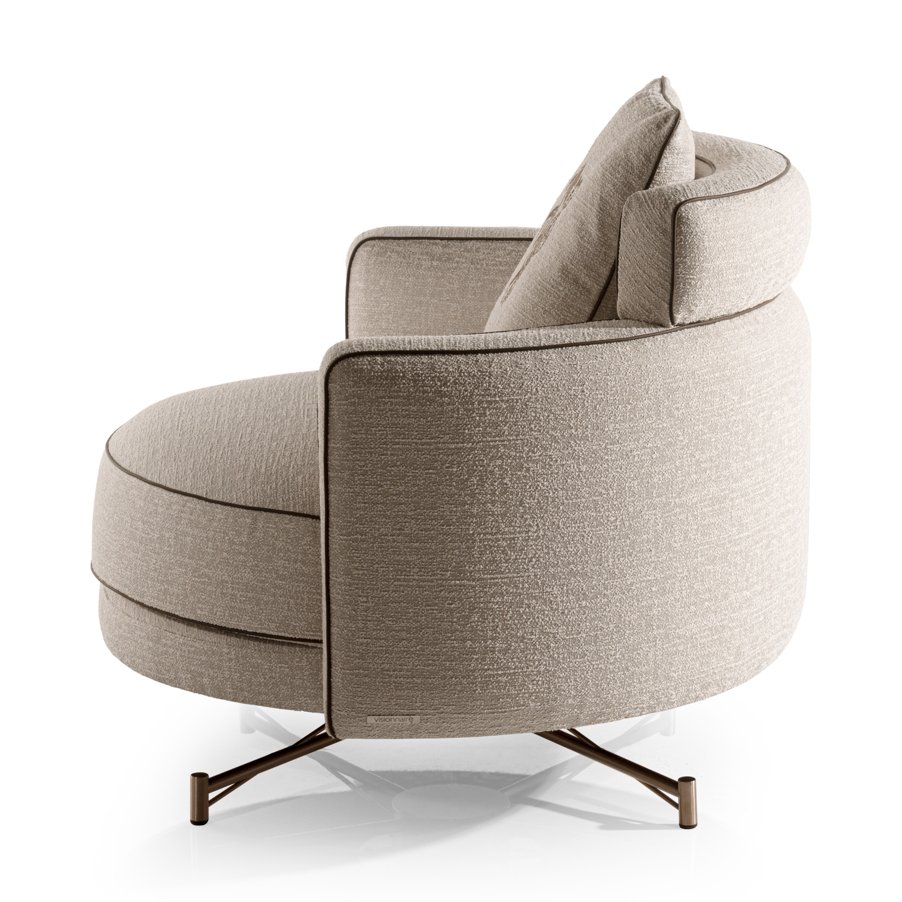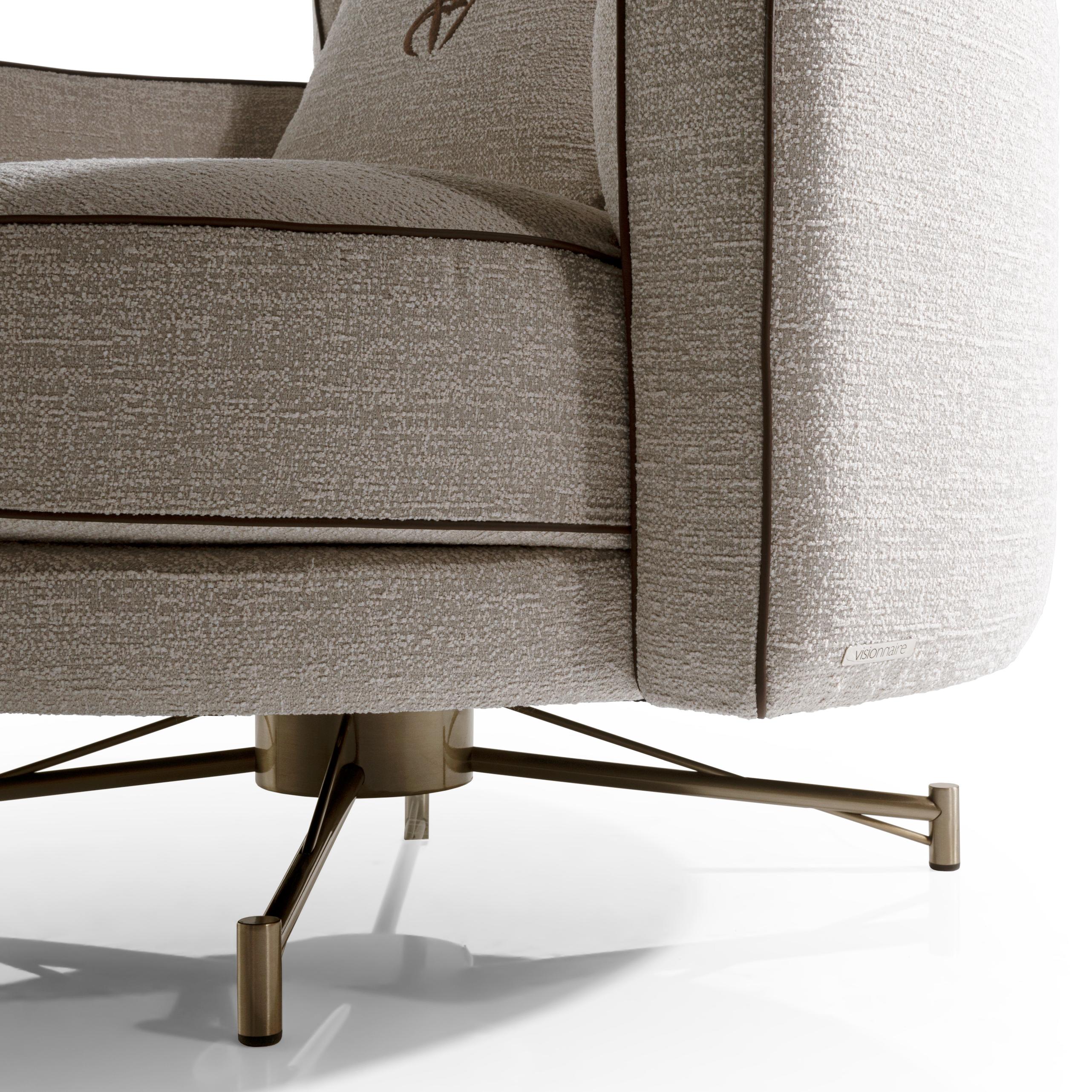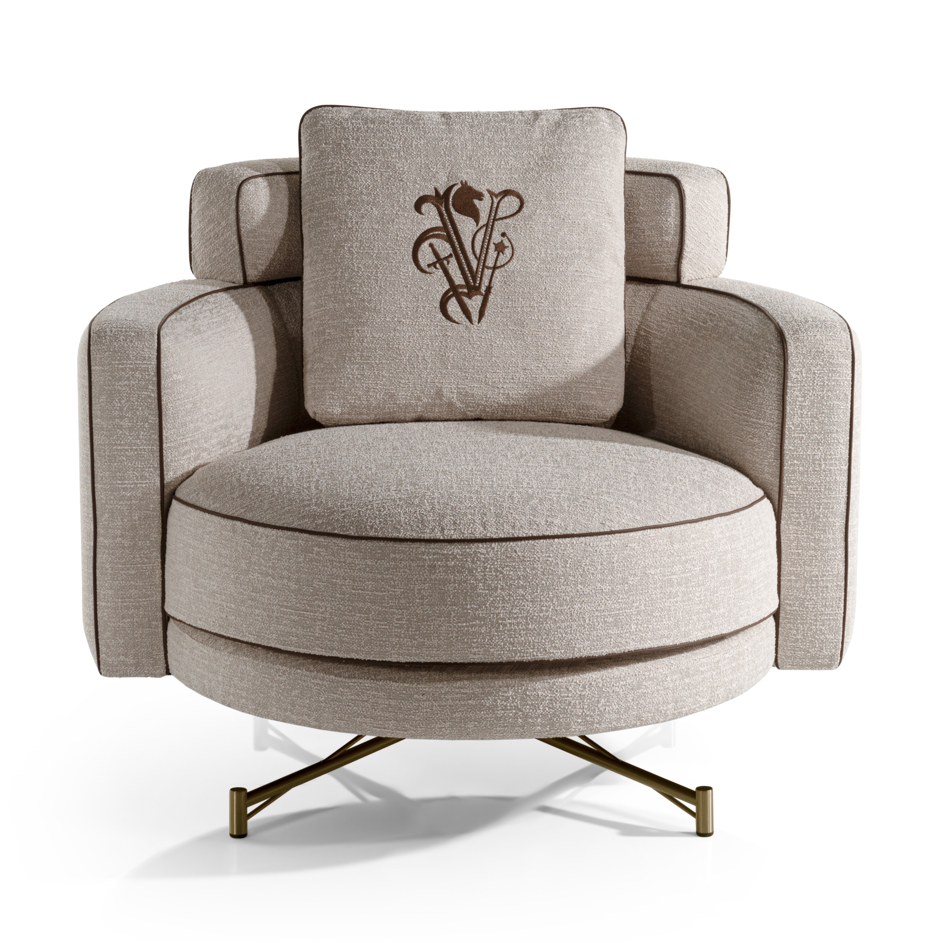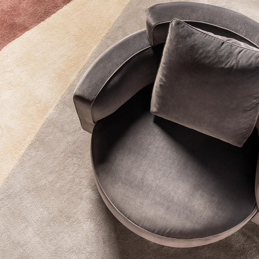 Elegant armchair, upholstered in leather or fabric, with a solid and multilayer wood structure. The seat frame features elastic webbing, while the curved armrests and backrest are designed for optimal comfort. The padding, made from multi-density polyurethane and acrylic fiber, is complemented by a feather back cushion. Contrasting details, such as leather piping and the embroidered, enrich the design. The tubular stainless steel base, available in satin metal finishes, includes a self-aligning rotating system with a central mount.